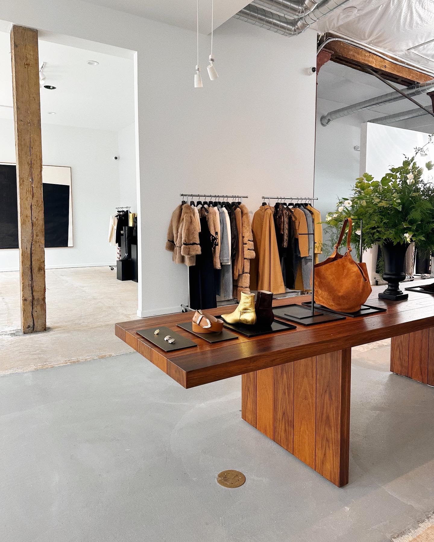 The Claudio Silvestrin for Cappellini Walnut Dining Table, the Ludwig Mies van der Rohe Barcelona Daybed, and the Project 213A x Forsyth Larry’s Lounge Chair in Cowhide on display at the Khaite trunk show produced by Merch Mates at Barrett Barrera Projects.