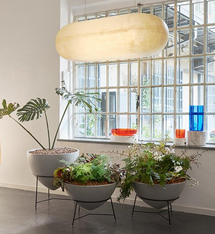 Puffball, a collection of minimal lamps, draws inspiration from the rounded caps and columned stalks of wild mushrooms and toadstools. The chunky silhouettes, made of raw fiberglass and tumbled or painted aluminum, give off a warm luminescent glow.