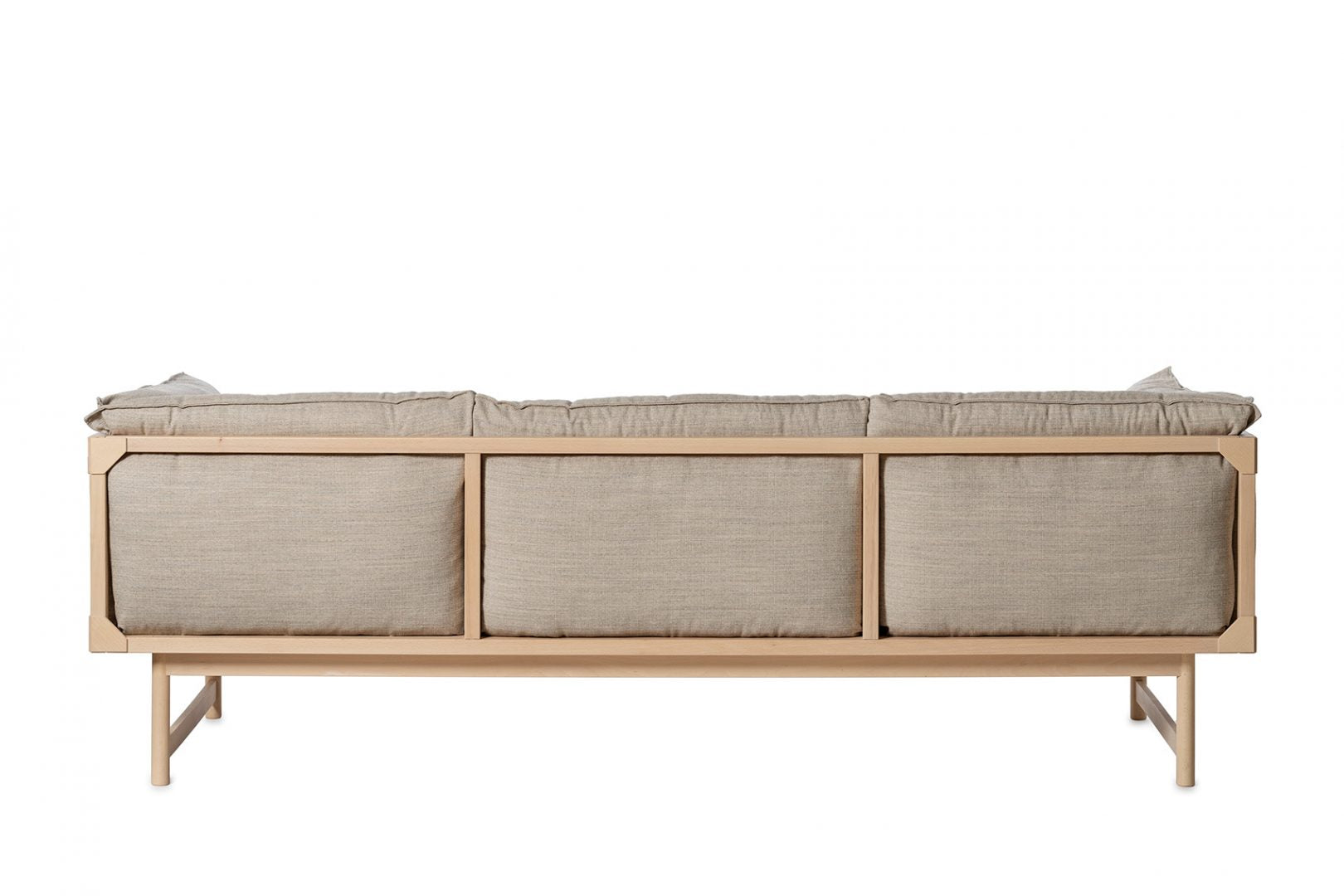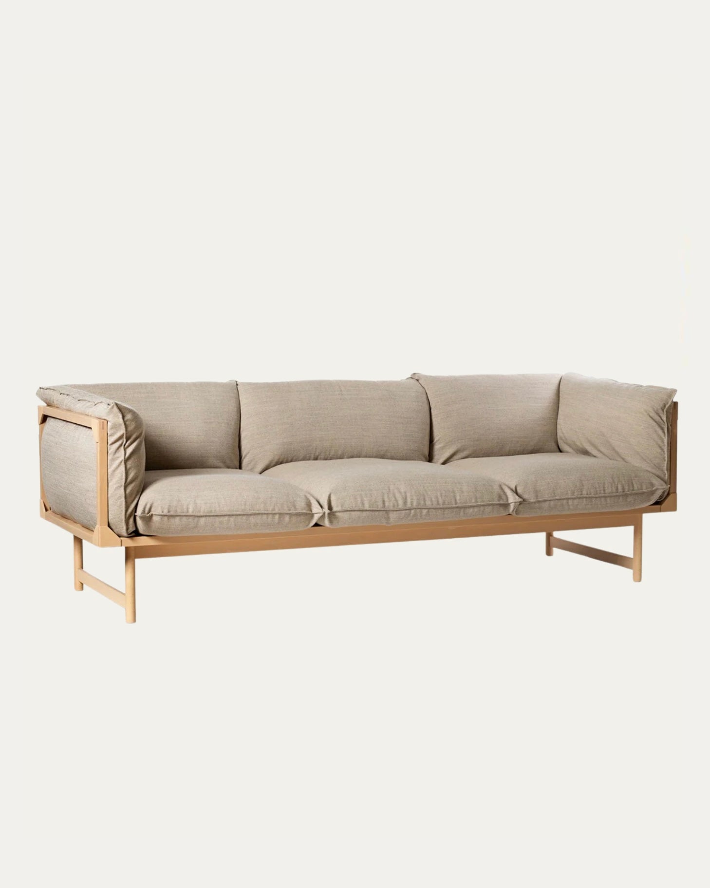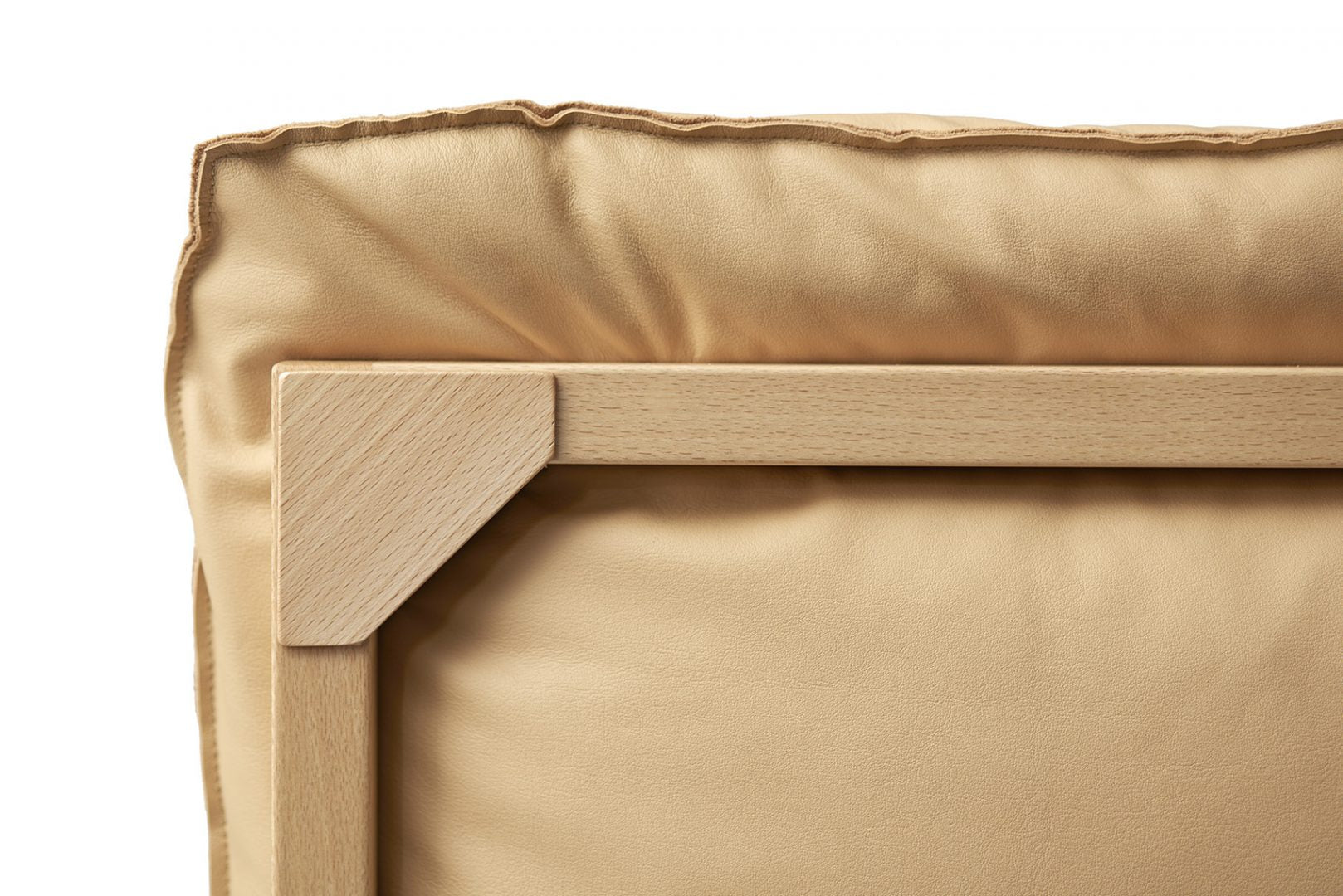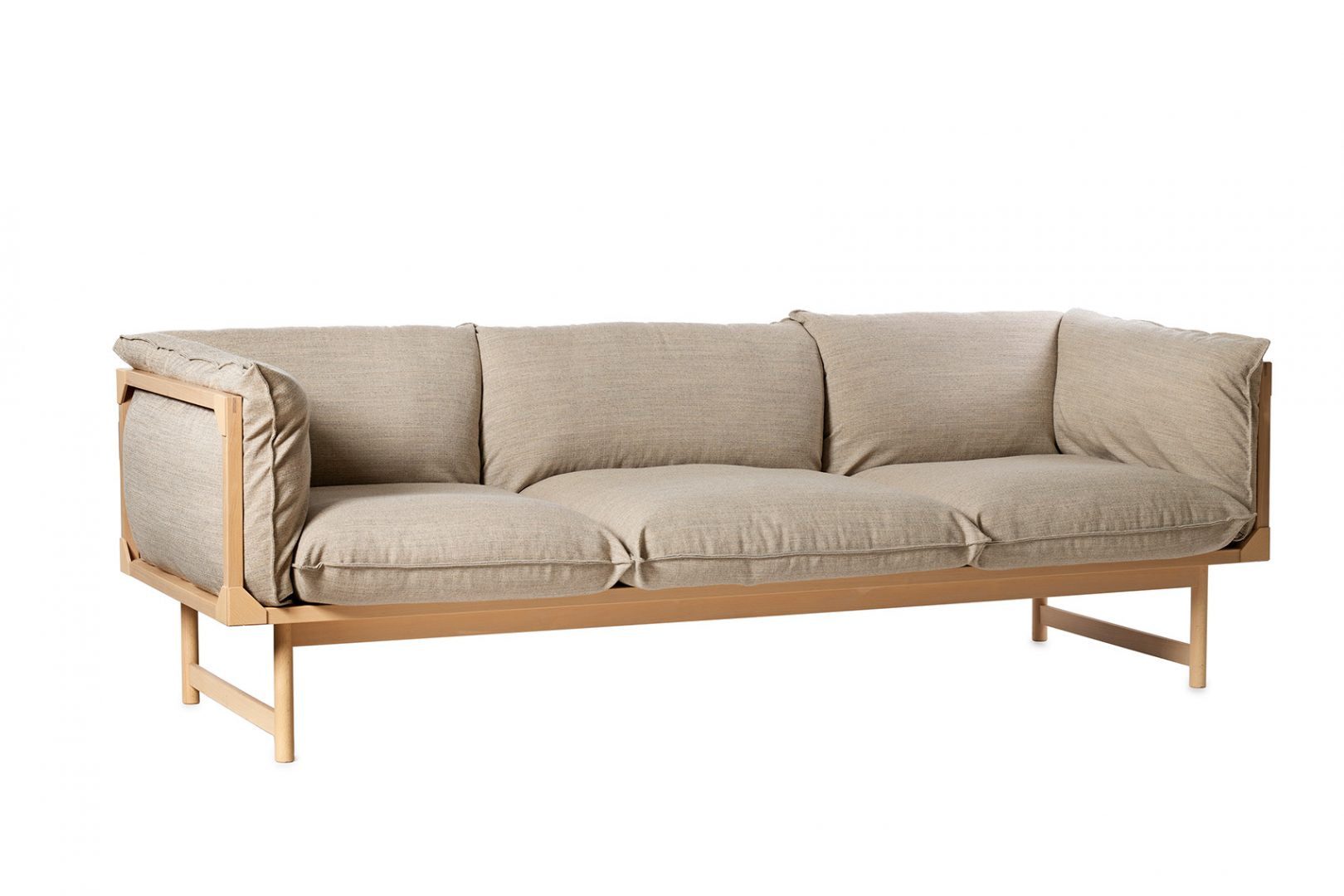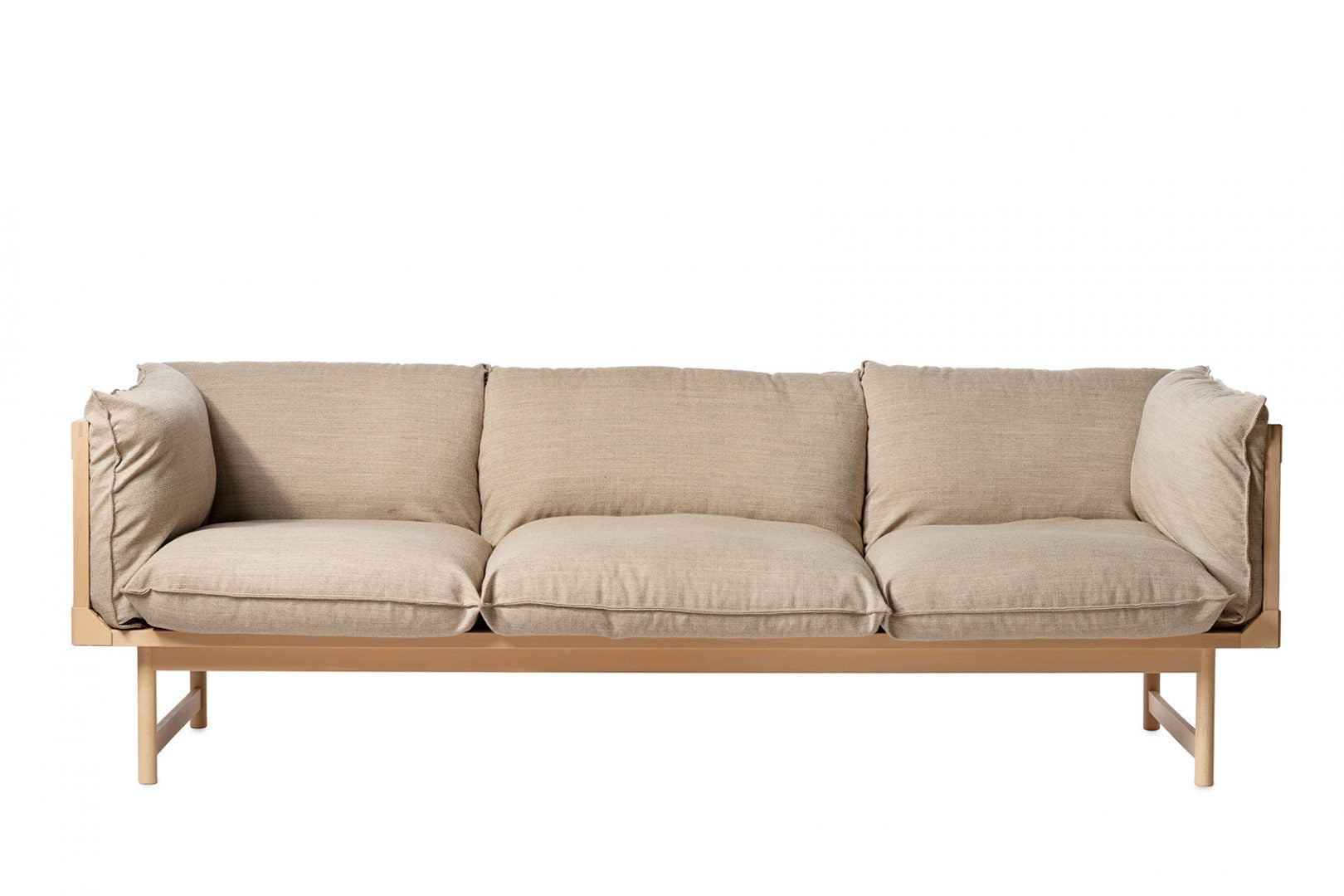 Sofa with frame in solid beech. Upholstered in fabric or leather. Cushions with padding of polyether and ball fiber. Polyether core.