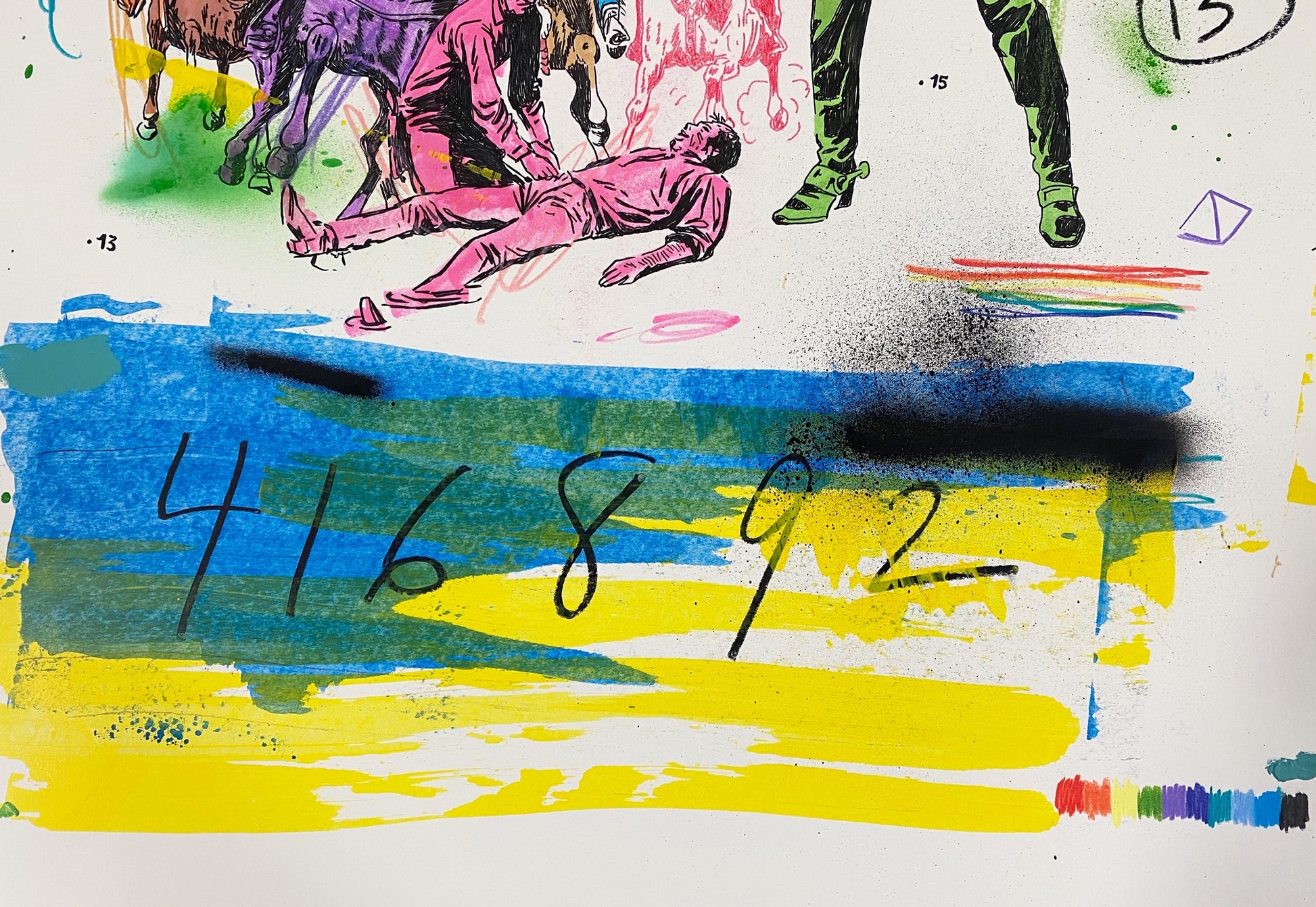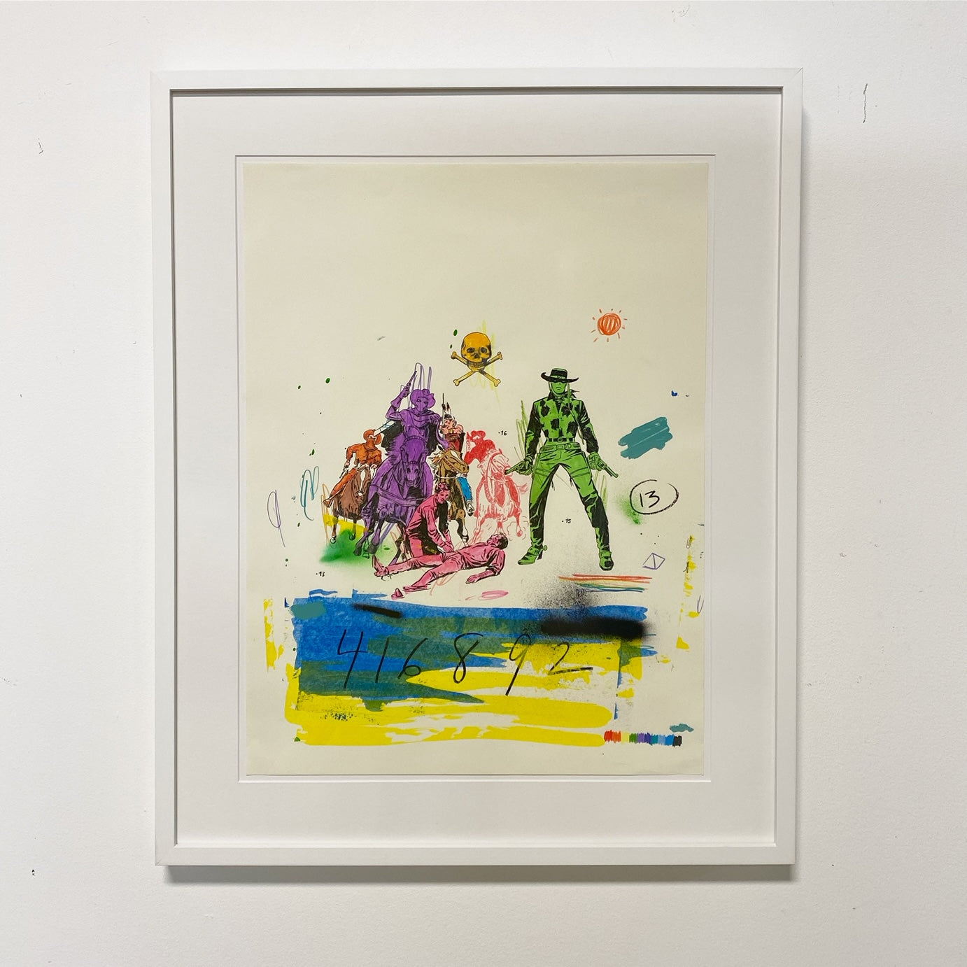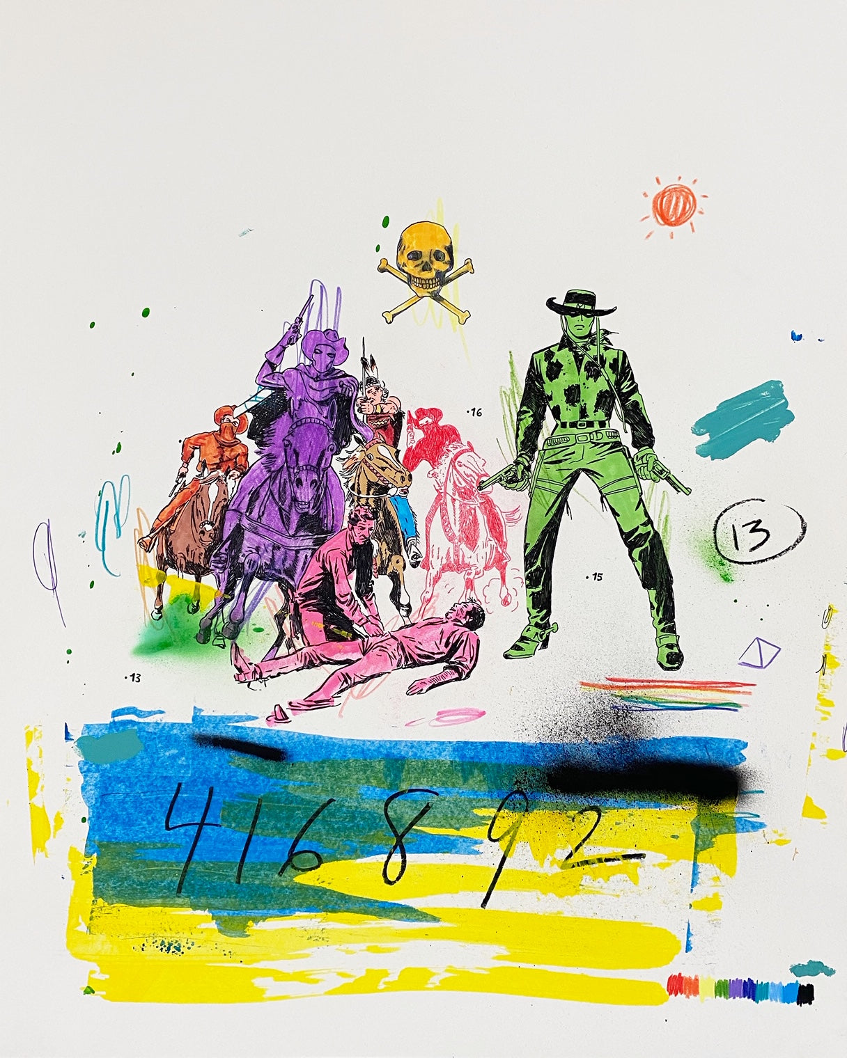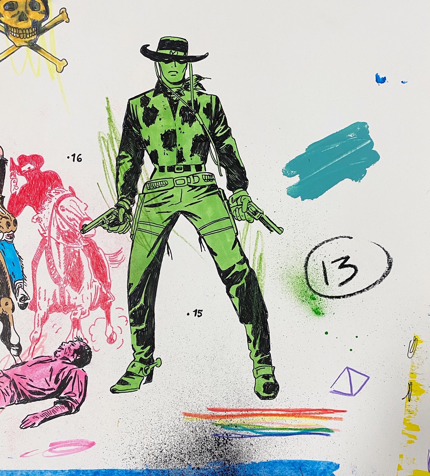American (b. 1975). Matt Eddmenson, who graduated from The Art Academy of Cincinnati in 1999, draws from a range of influences and sources for his practice, including Cowboy Comics, Pop Art, and the work of Cy Twombly. His works are gatherings and reconfigurations of American imagery and iconography, commonly featuring cowboys, skulls, and rodeo horses. He also incorporates images from the golden age of comics and tattoo culture. Eddmenson explains: “I work from my memories as a child, I learned to draw by tracing comic book covers over and over until I was able to draw these characters from memory—I have a deep admiration for comic book art.” Works like 'You Keep Twistin My Words Around' (2020) and 'Don't Look at the Sun Too Long' (2020) demonstrate Eddmenson’s ability to reference western comics, his love for postmodern masters, and the great colorists of the 21st century.