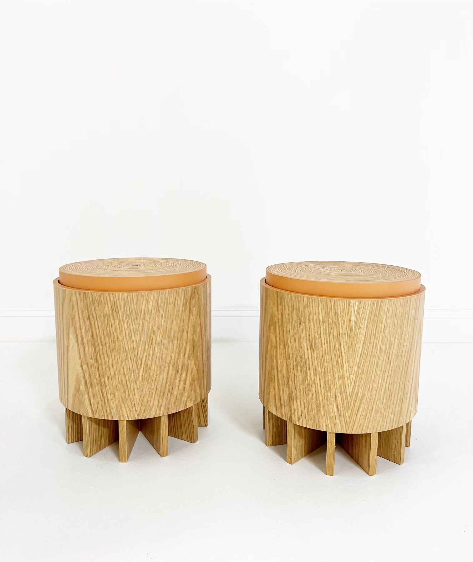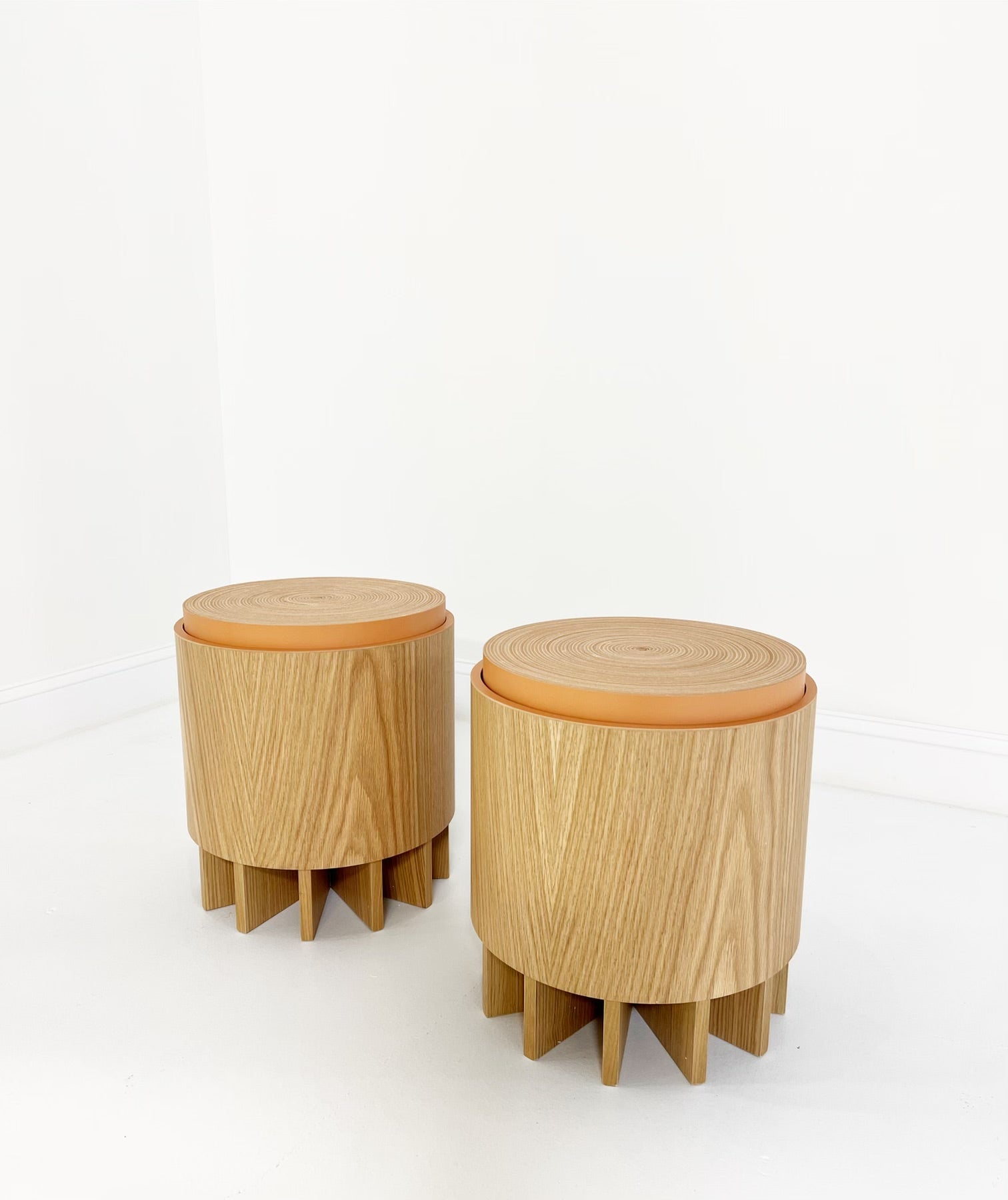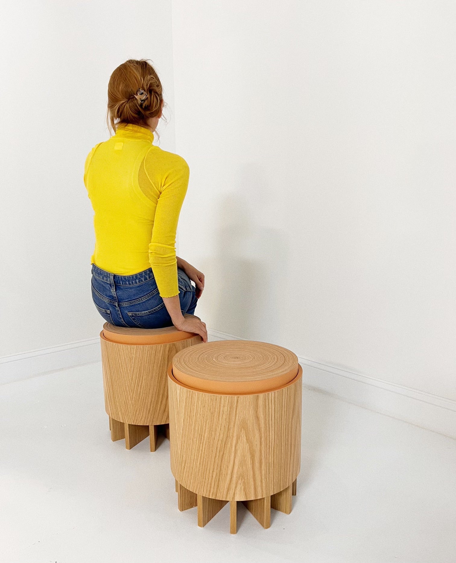 The Cruz Stool, designed by Simone Fanciullacci, boasts a natural laminated wood structure with a rolled saddle leather insert on top.