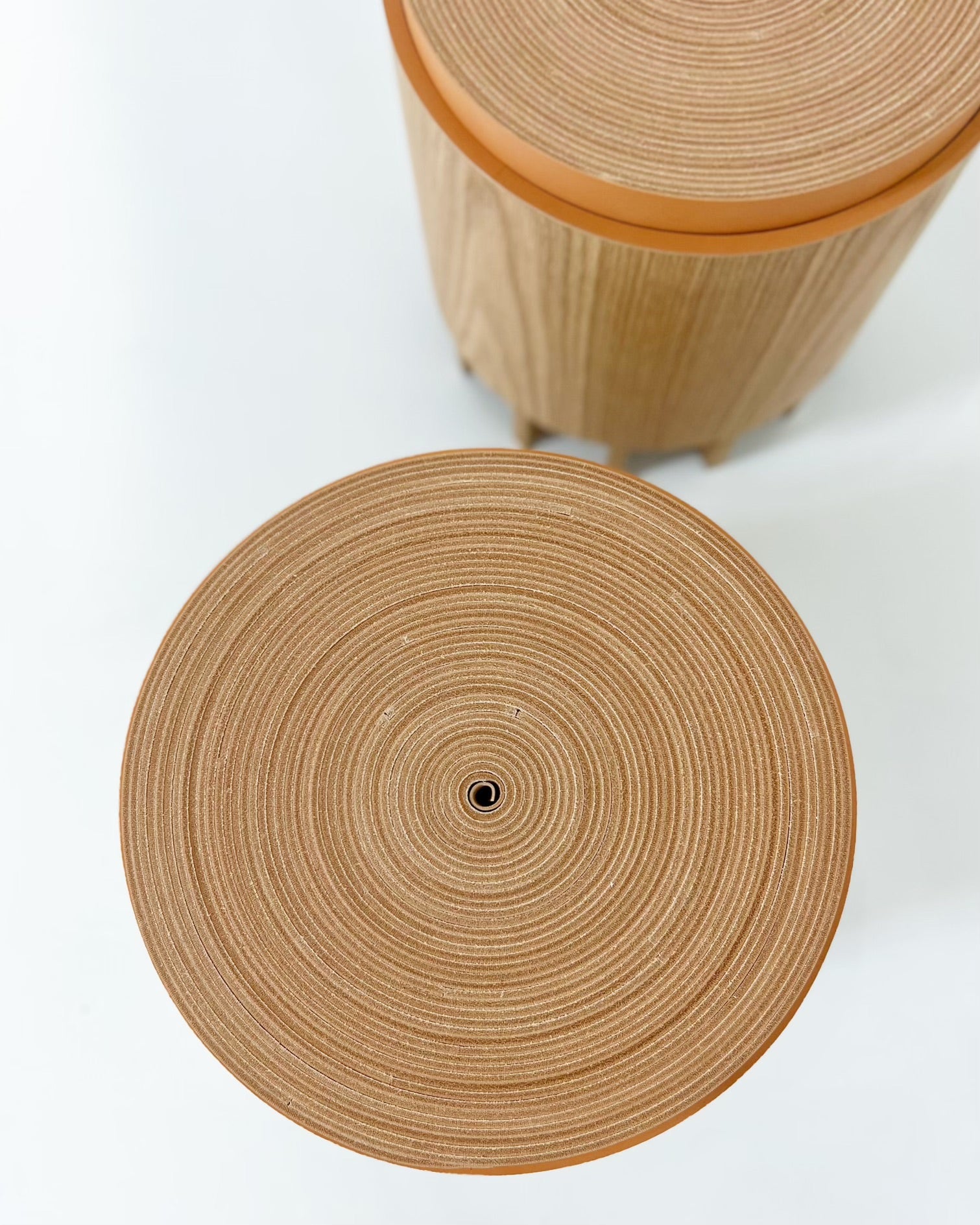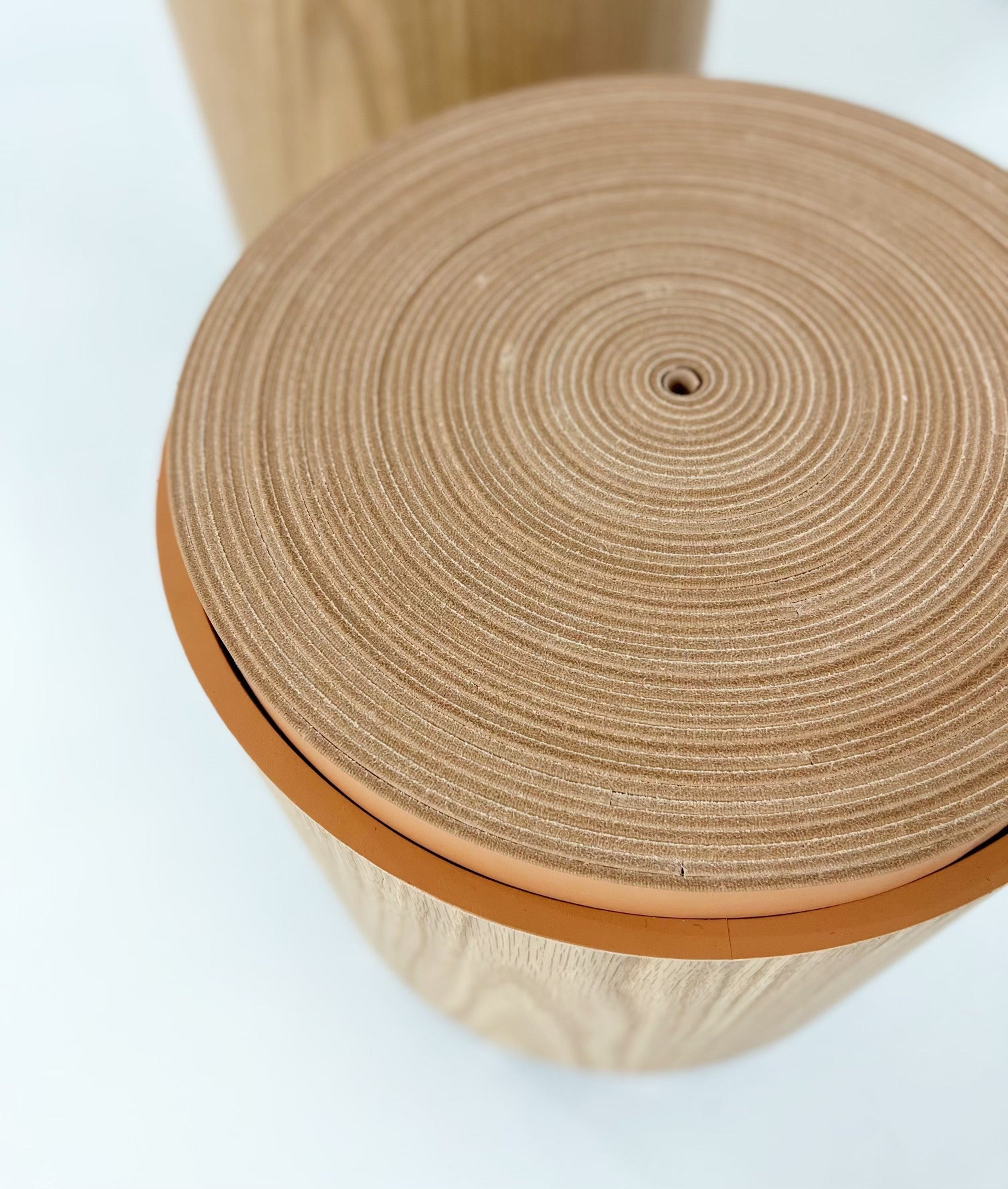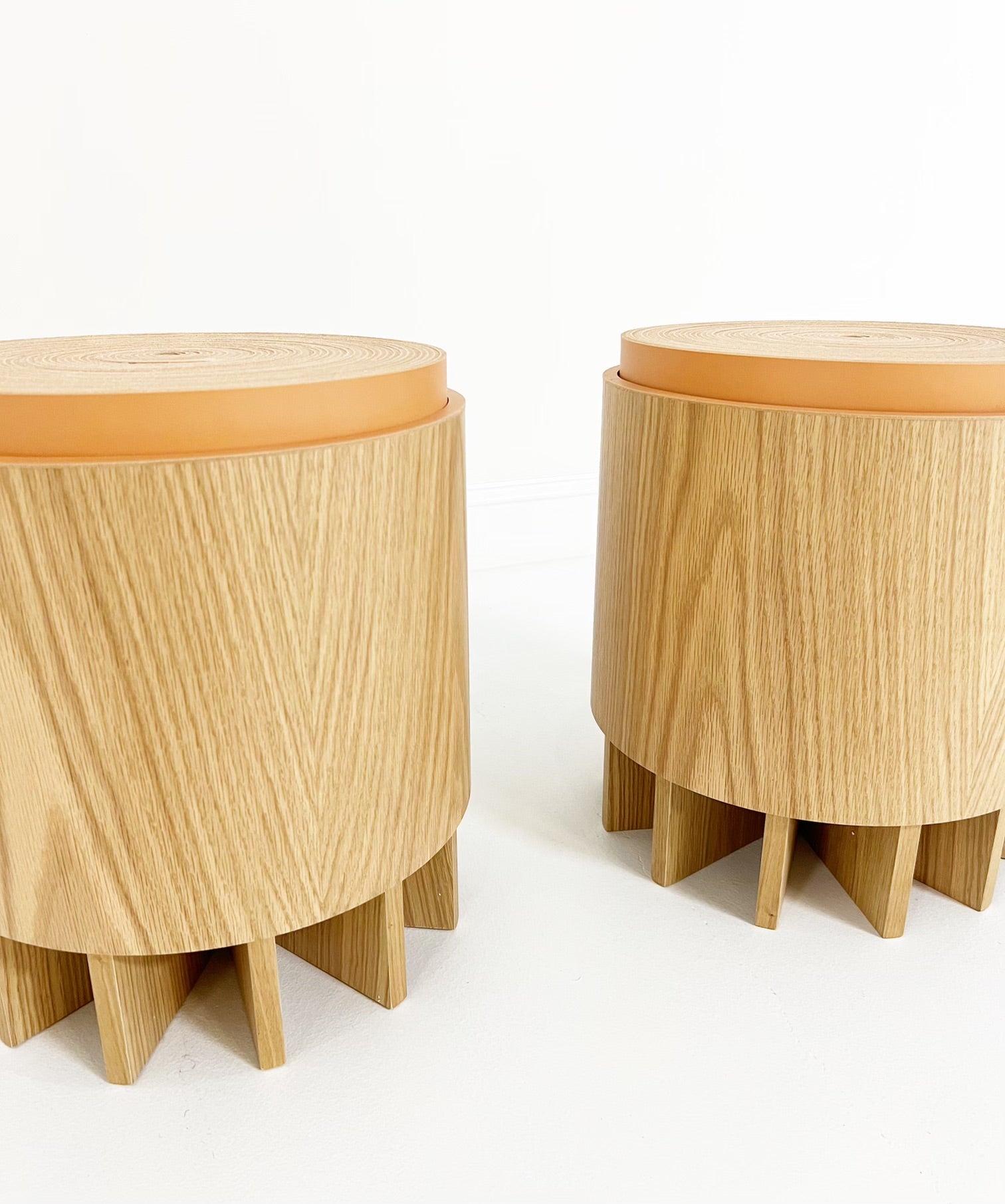 The Cruz Stool, designed by Simone Fanciullacci, boasts a natural laminated wood structure with a rolled saddle leather insert on top.