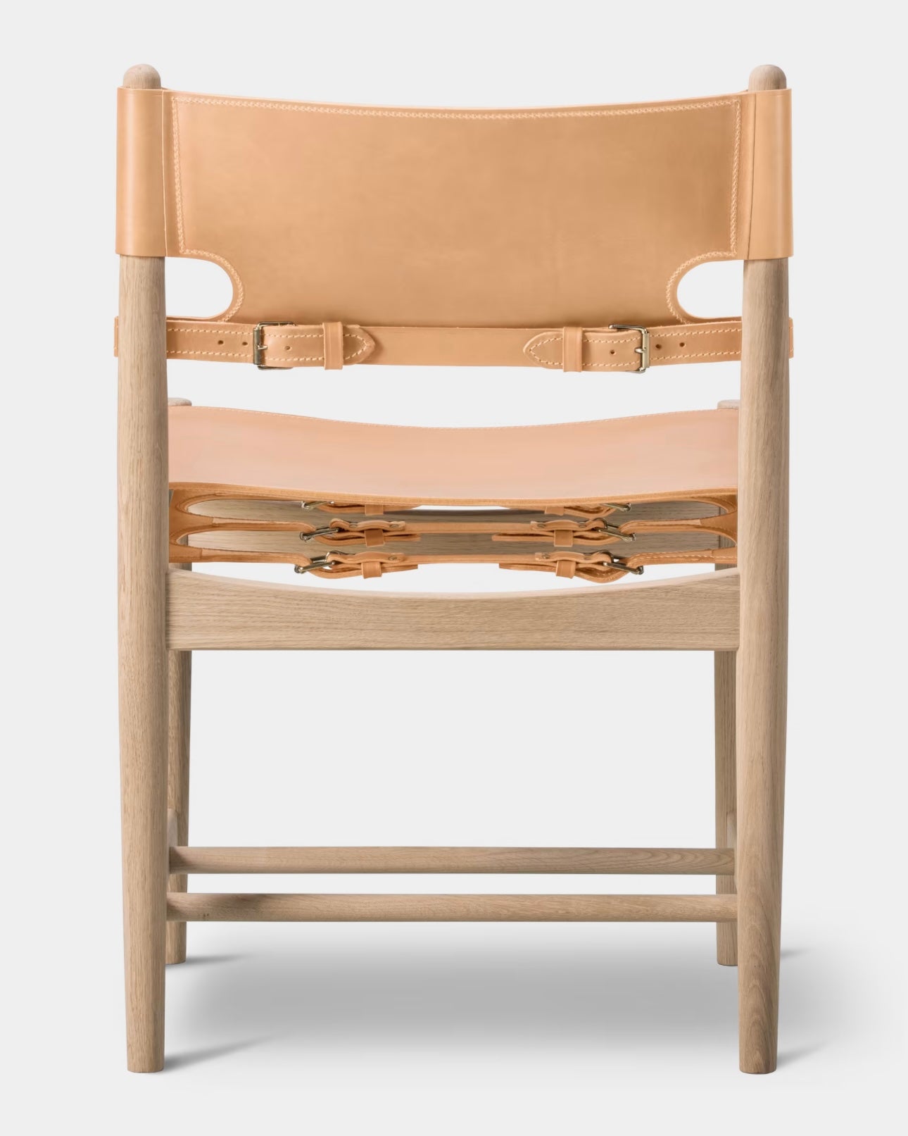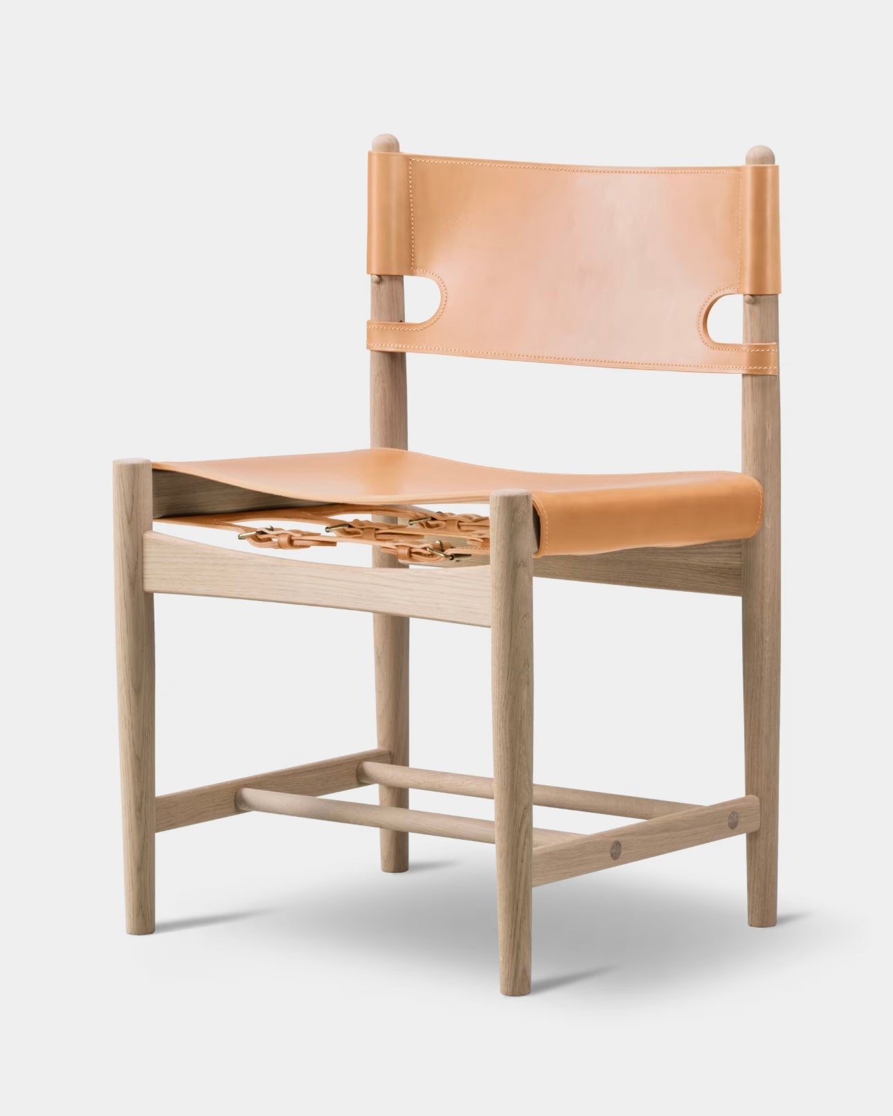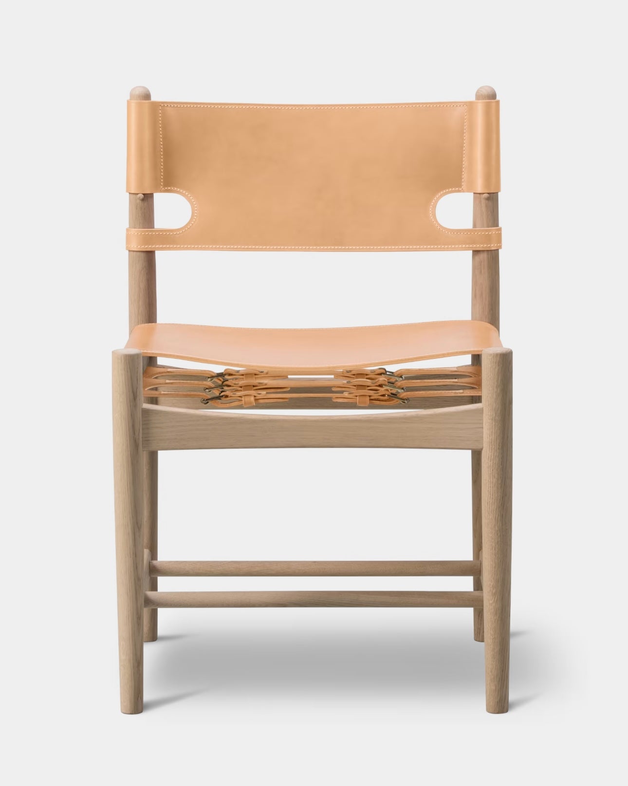 The Spanish Dining Chair is a generous and exquisitely crafted chair in Børge Mogensen’s well known series of saddle leather chairs. Over time, as the leather expands, the adjustable straps can be tightened. A true statement of craftsmanship. Solid oak or walnut is combined with the highest caliber saddle leather in a chair that will only become more beautiful with age.