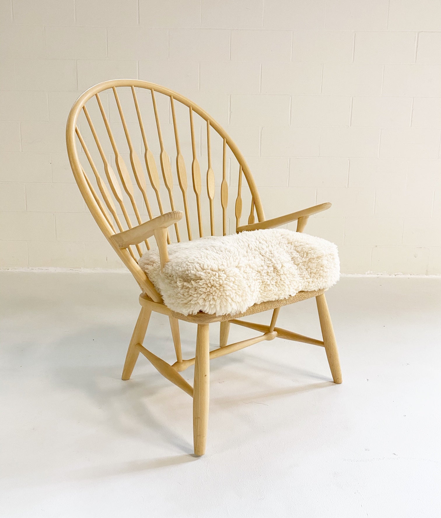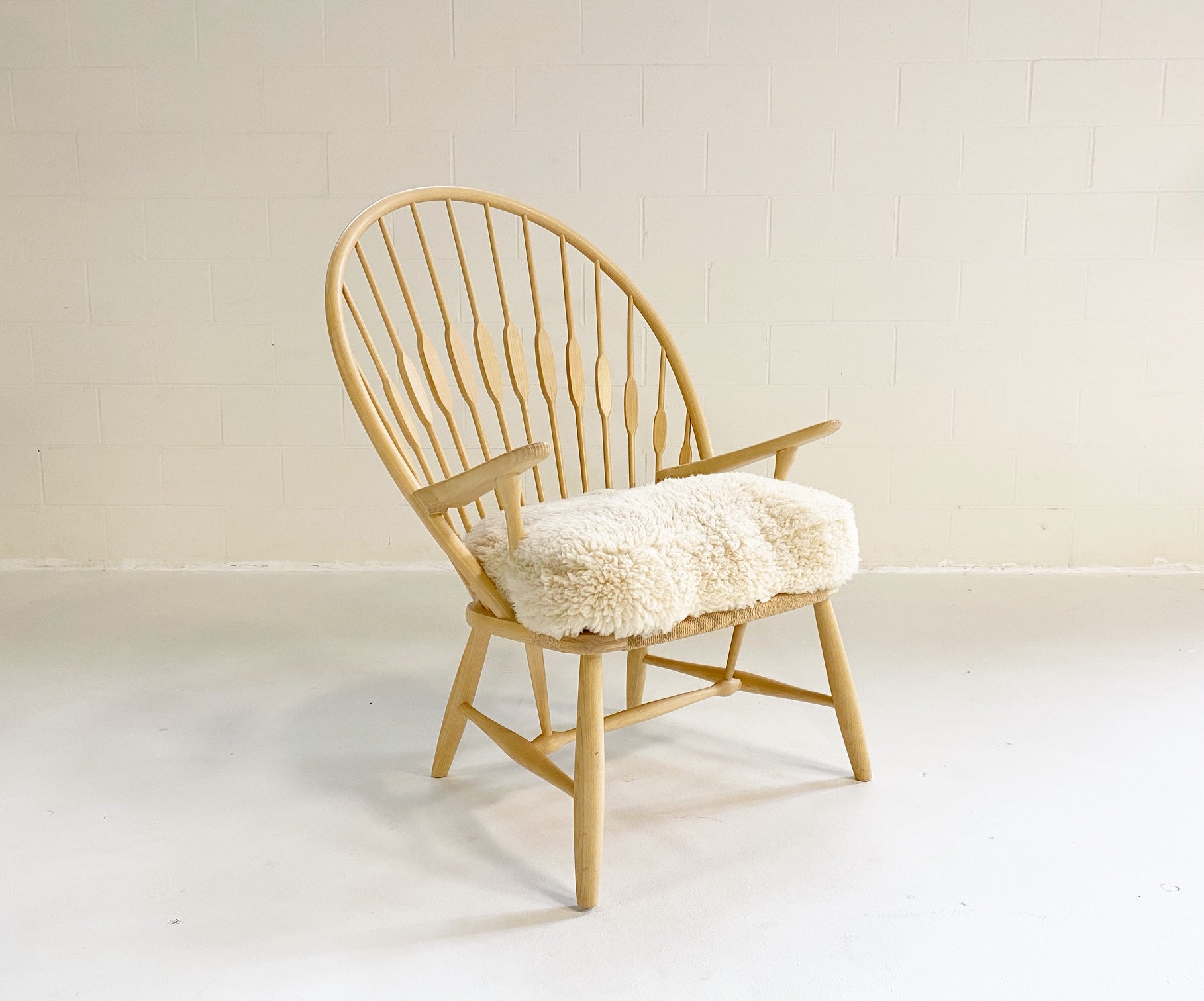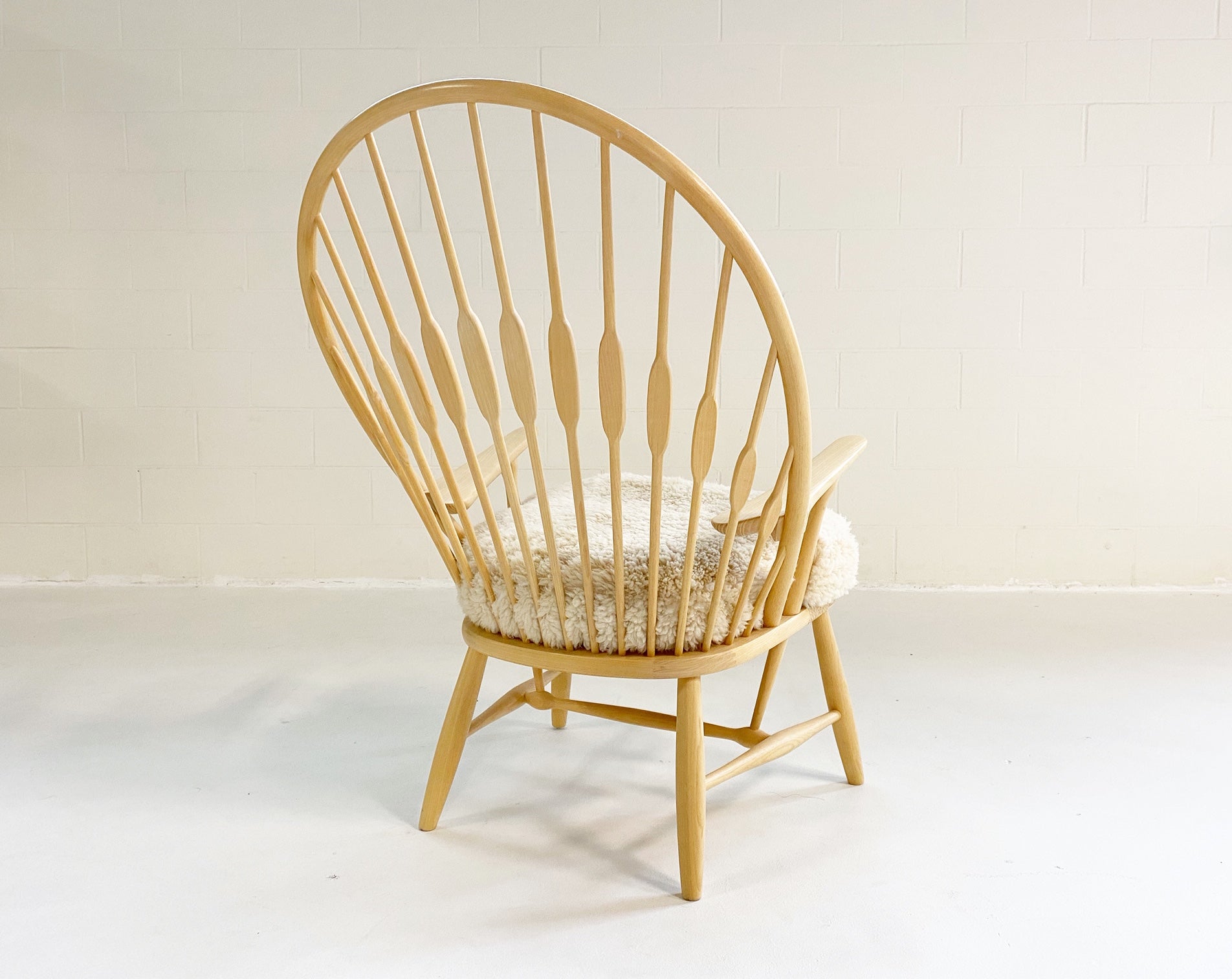 This is a beautiful, model PP550 "Peacock" lounge chair, in truly excellent condition. When Finn Juhl first saw this chair he immediately noticed its characteristic back and named it The Peacock Chair - a name which stuck with the chair. Its consciously modern lines are not merely a matter of looks. Rather, the sweeping back with its extravagantly shaped sticks are a feat of ergonomic aesthetics. The flat part of the sticks, which gives it its peacock-like appearance, are placed where the shoulder-blades meet the chair's back. Manufacturer's brand is on the underside. We created a custom-fitted cushion from our California sheepskins. A down feather insert creates a cushy, comfortable seat.