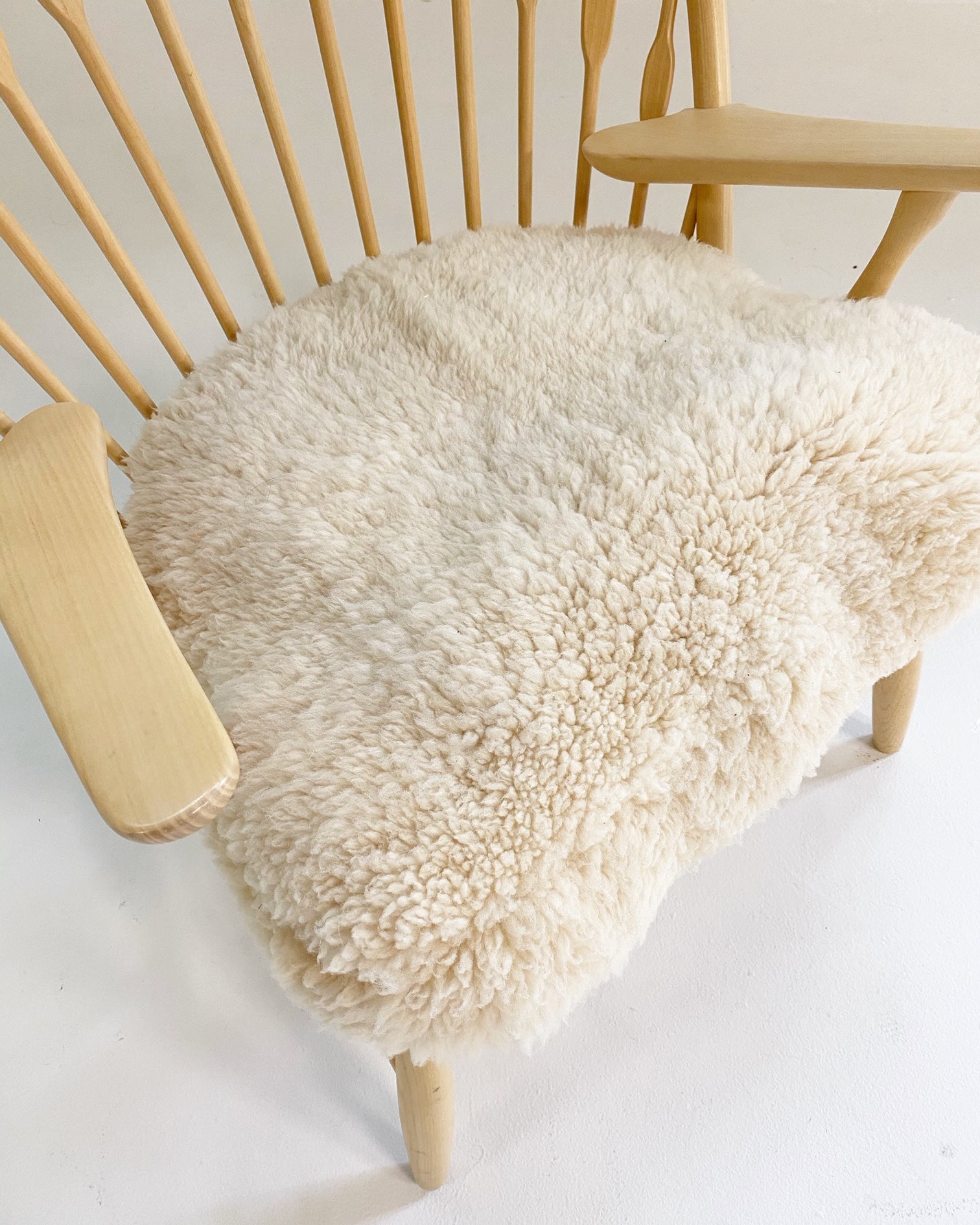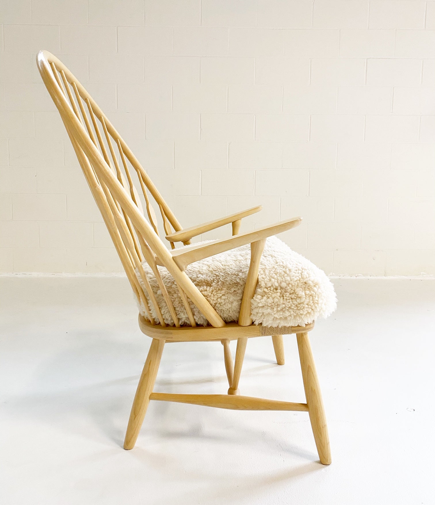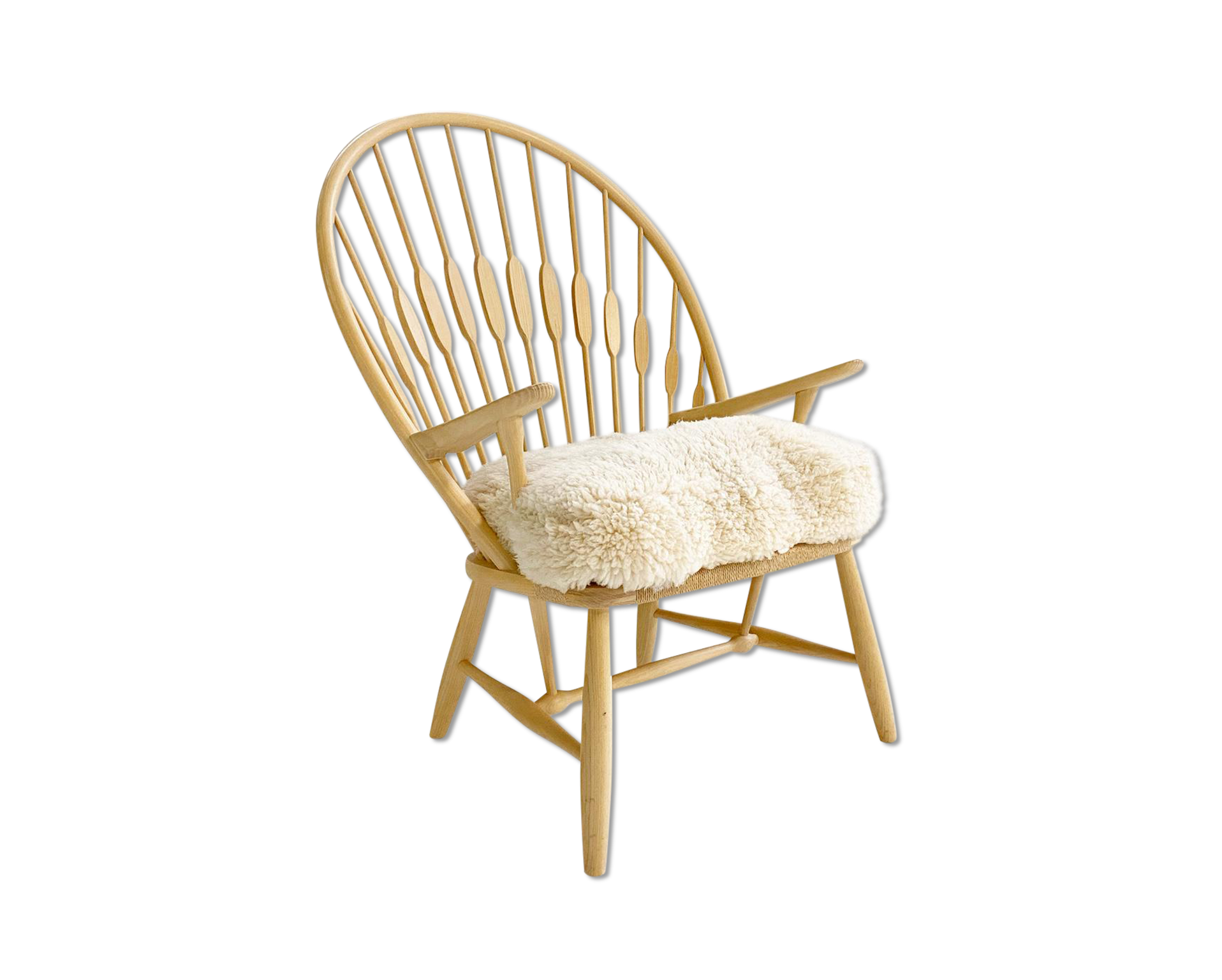 This is a beautiful, model PP550 "Peacock" lounge chair, in truly excellent condition. When Finn Juhl first saw this chair he immediately noticed its characteristic back and named it The Peacock Chair - a name which stuck with the chair. Its consciously modern lines are not merely a matter of looks. Rather, the sweeping back with its extravagantly shaped sticks are a feat of ergonomic aesthetics. The flat part of the sticks, which gives it its peacock-like appearance, are placed where the shoulder-blades meet the chair's back. Manufacturer's brand is on the underside. We created a custom-fitted cushion from our California sheepskins. A down feather insert creates a cushy, comfortable seat.