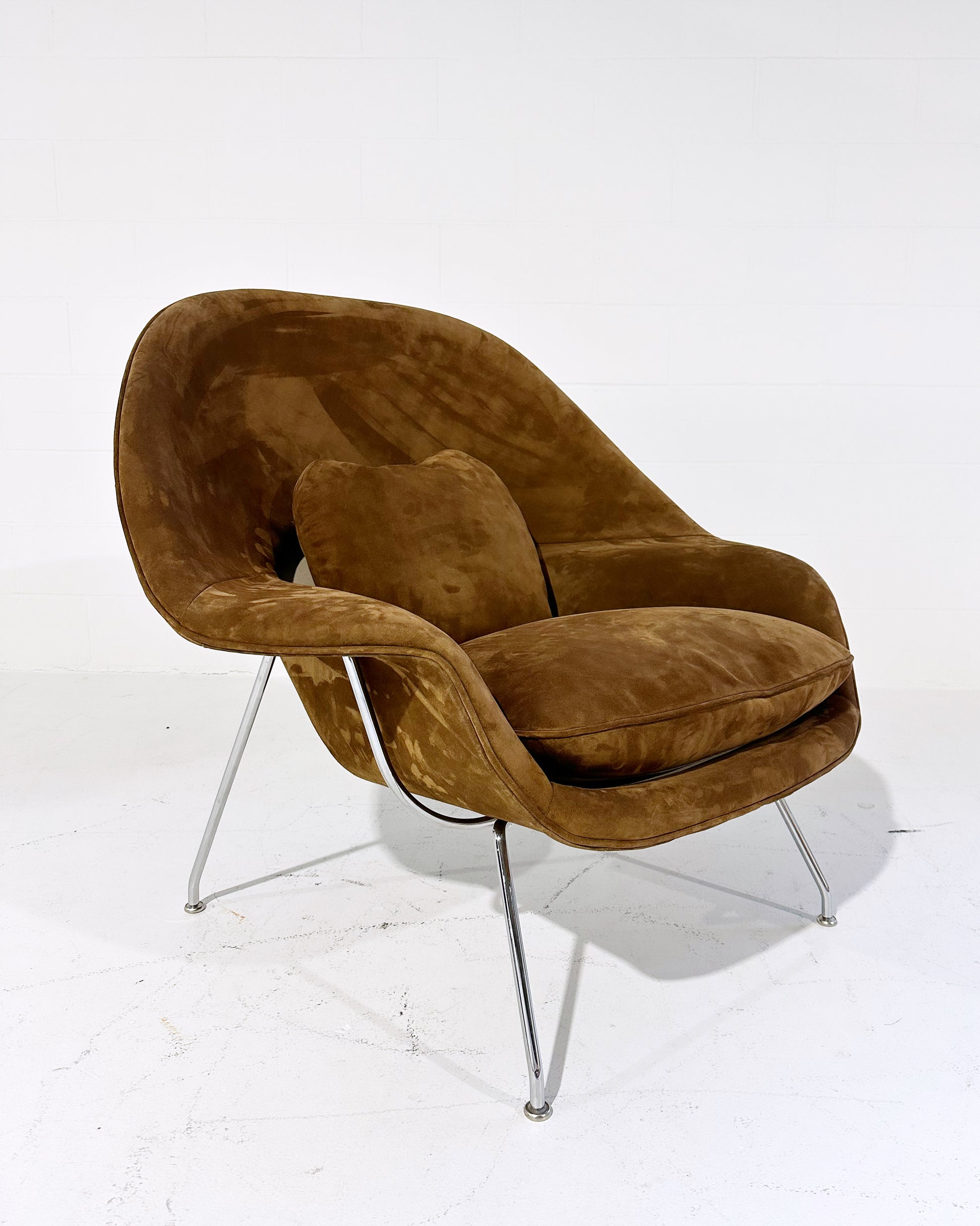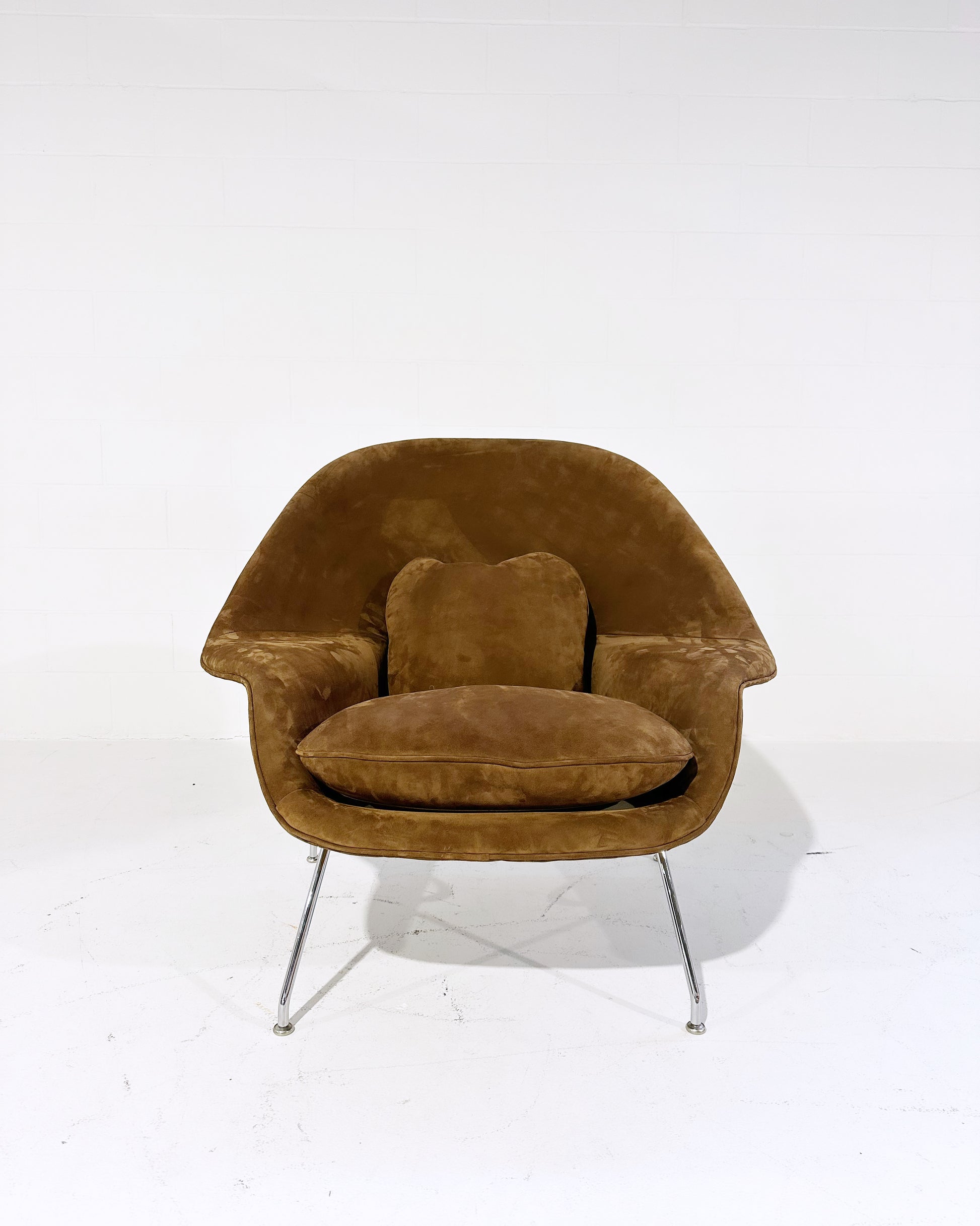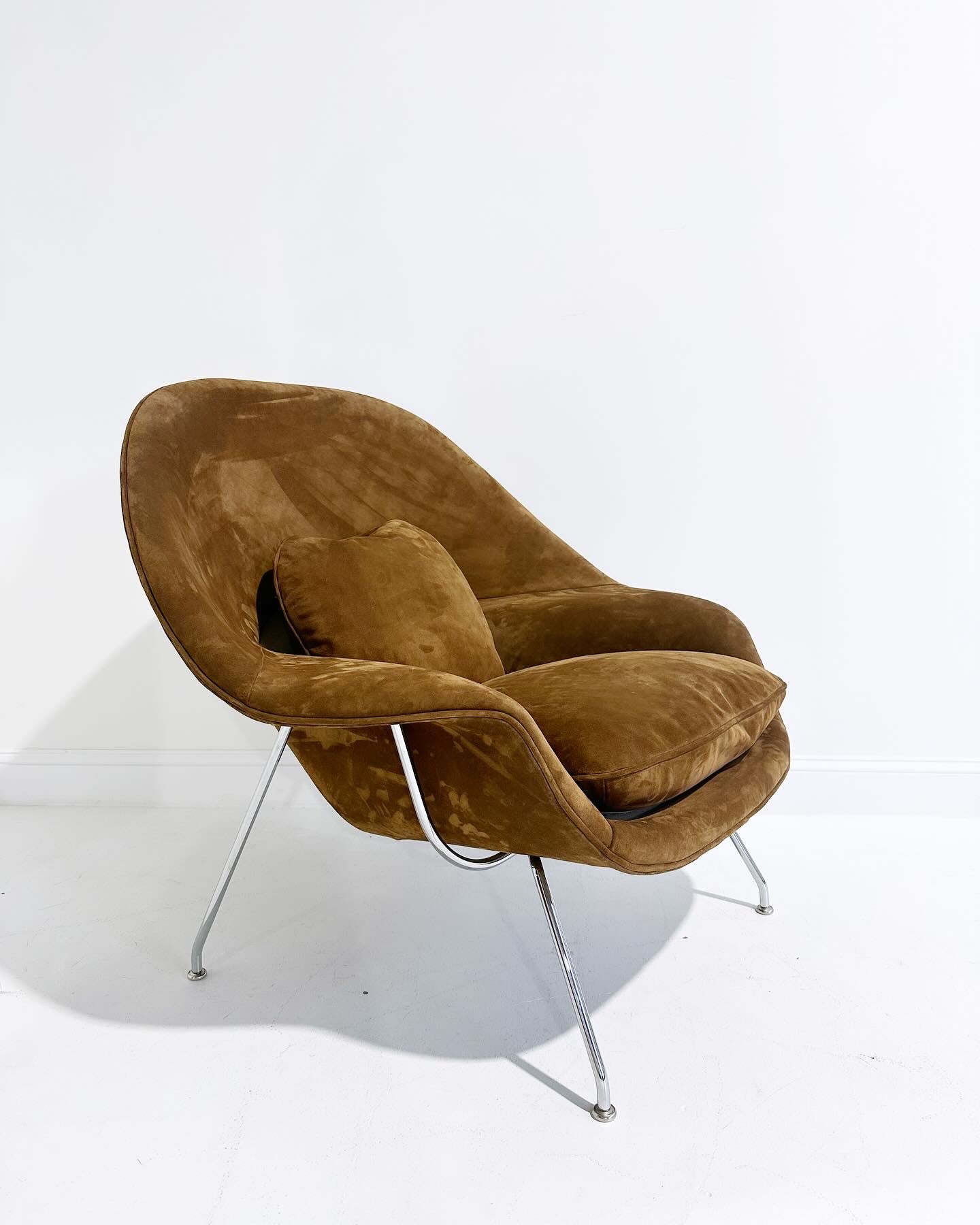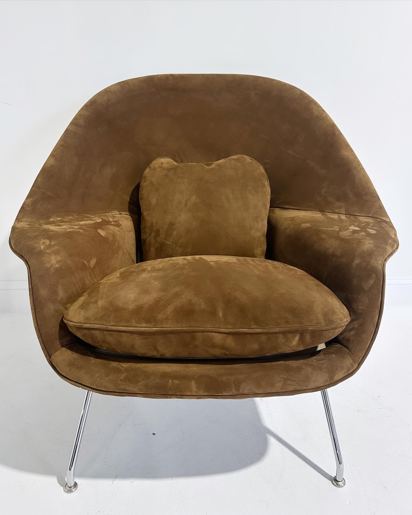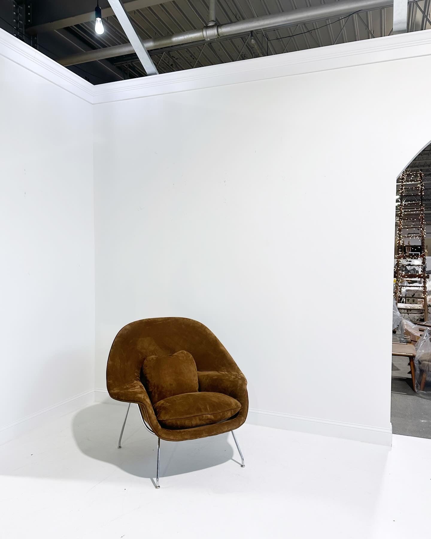 We have an incredible collection of vintage and new Womb chairs waiting for a new life. Our upcycled Womb Chairs are some of our most popular designs. This Womb Chair and Ottoman will be made to order in a luxurious brown suede. Images are of a Womb Chair and Ottoman we recently finished.