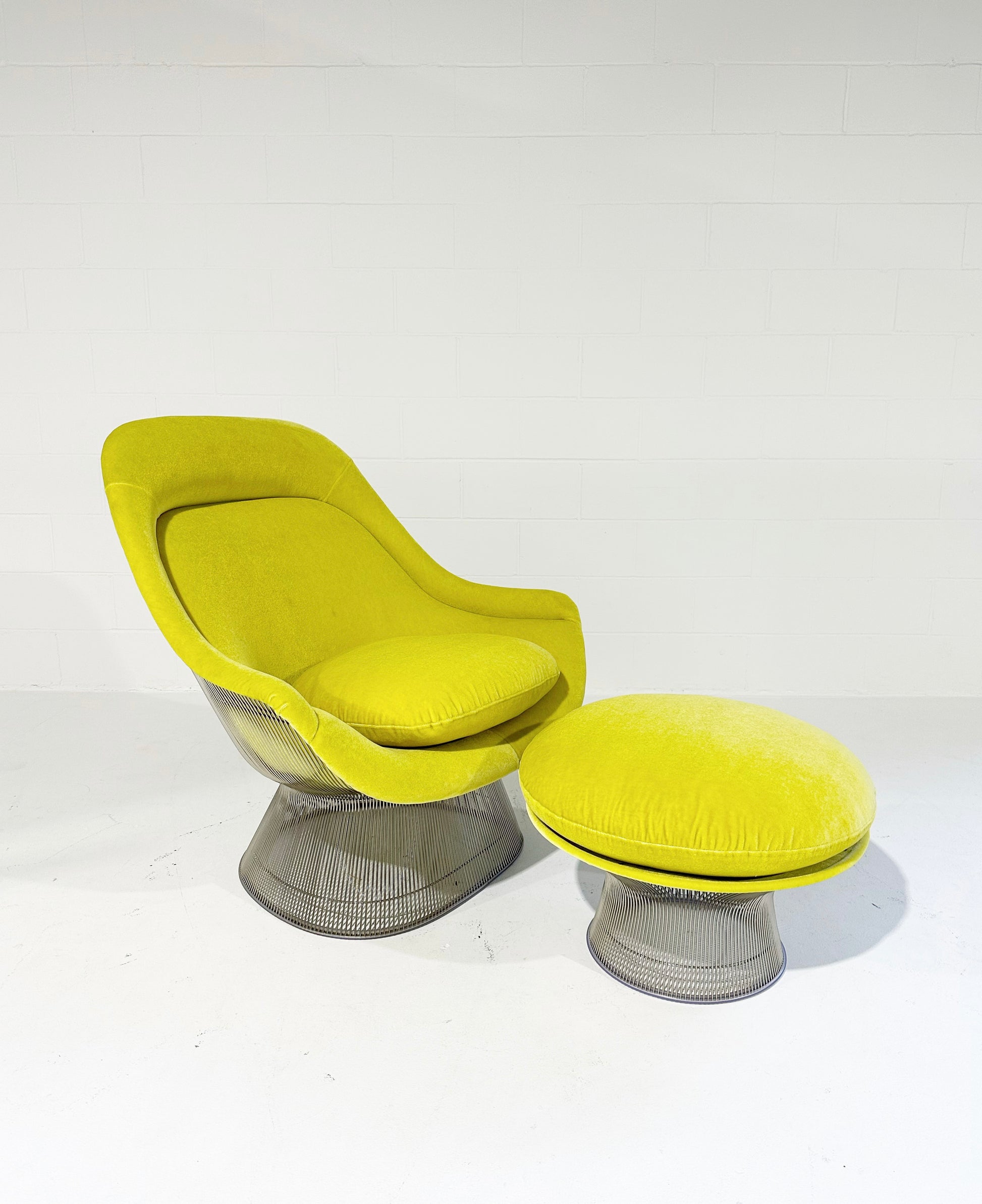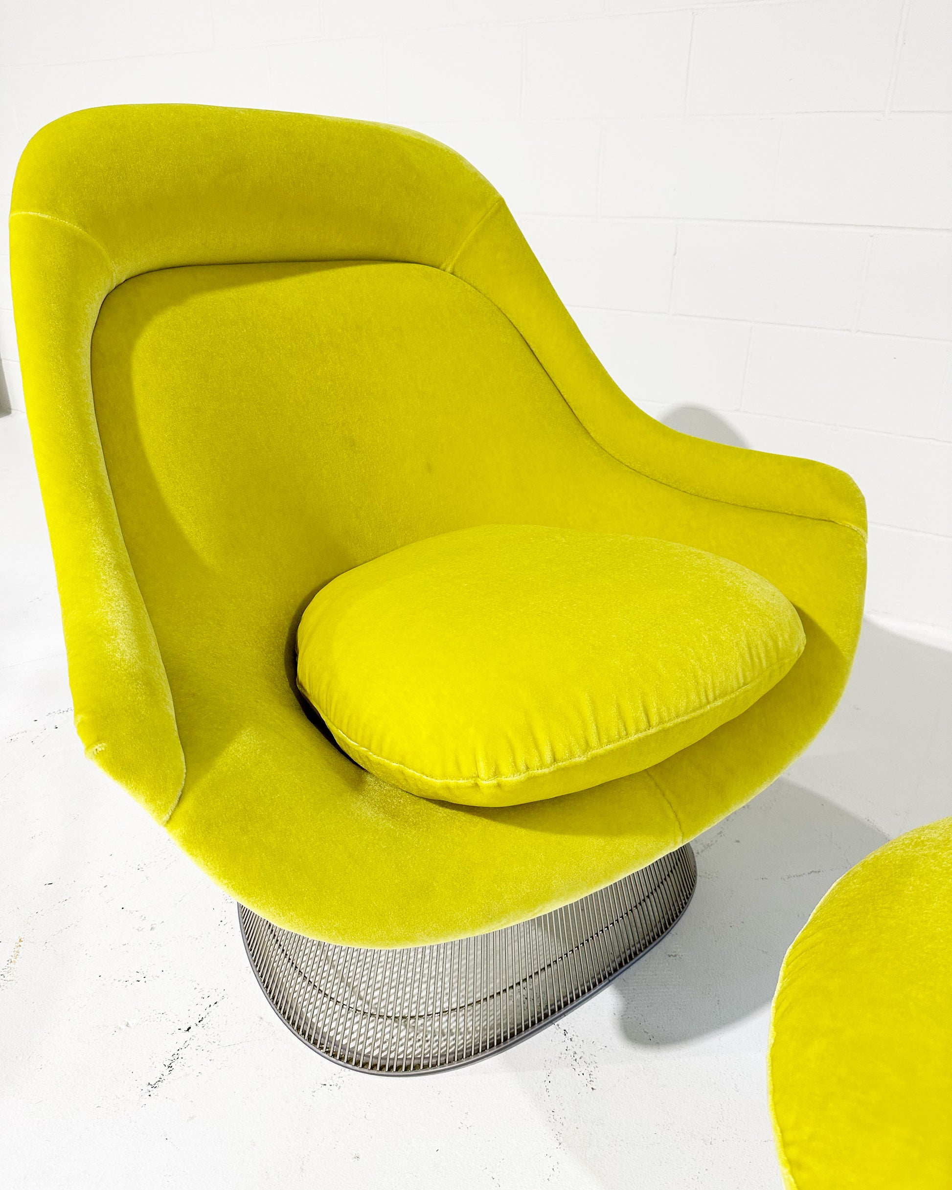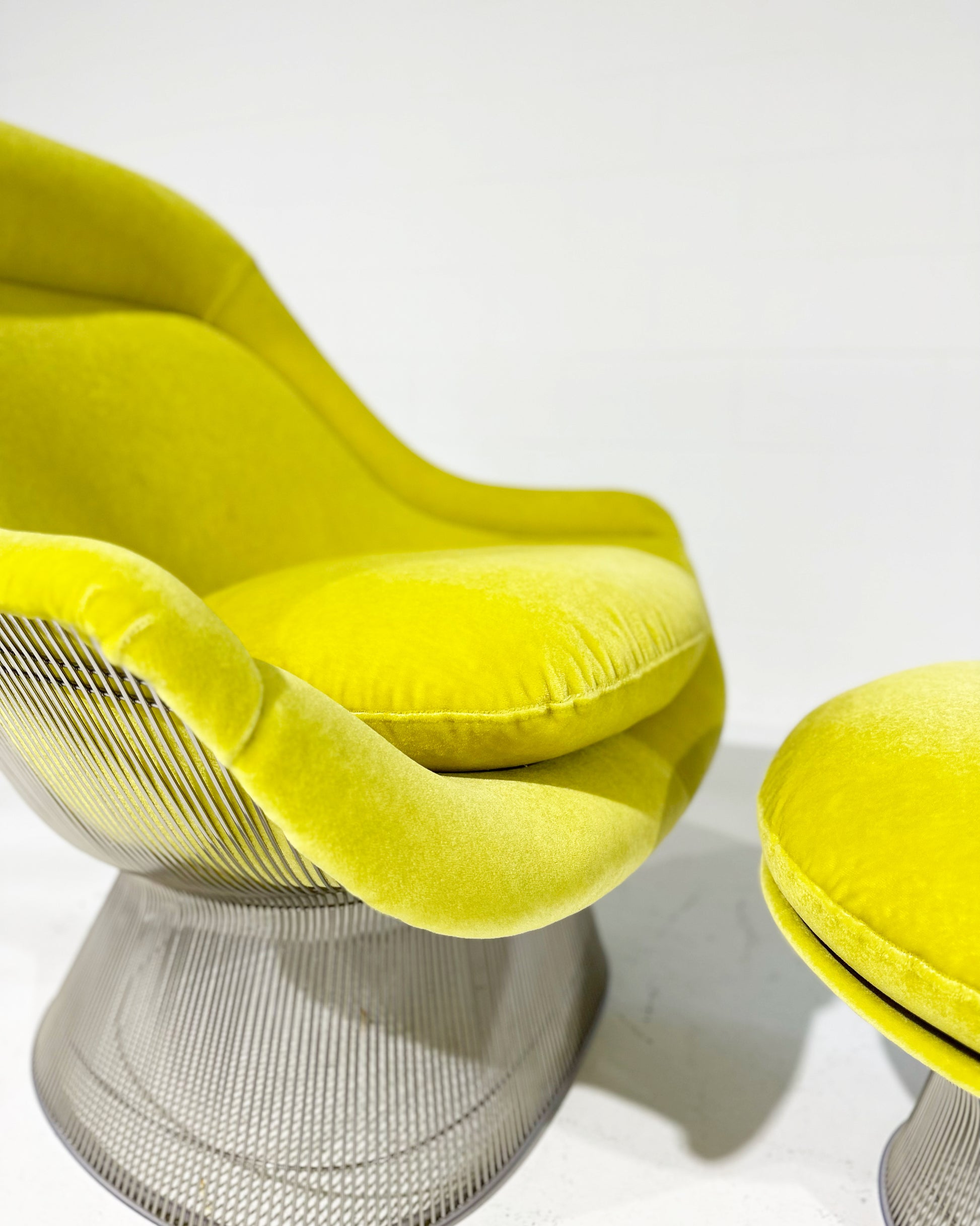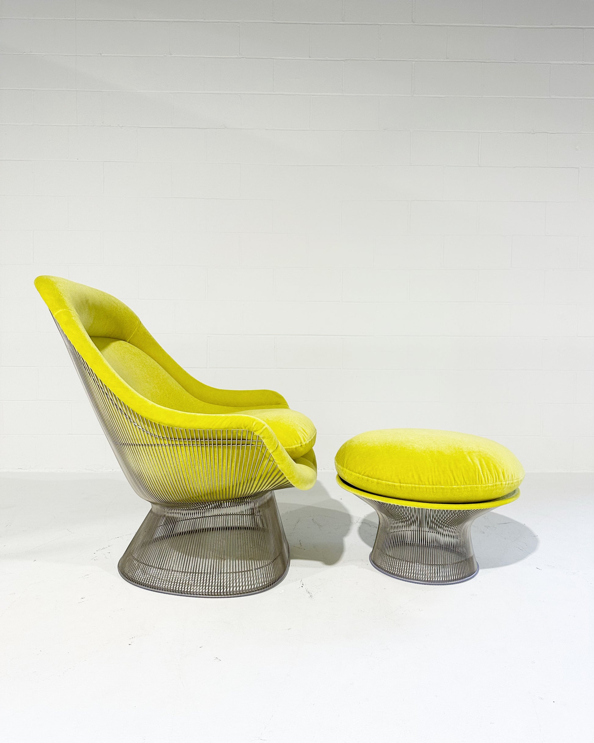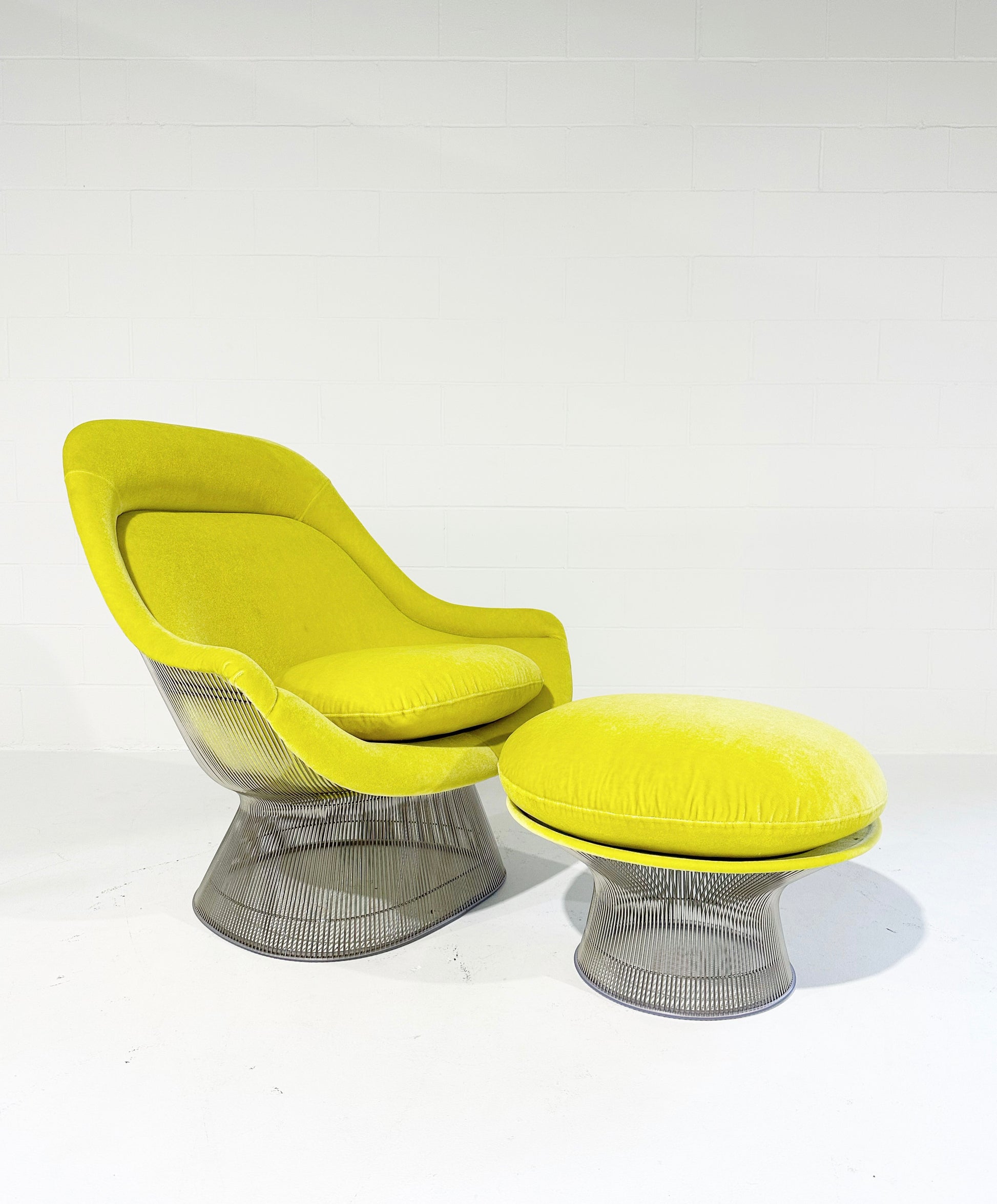 An icon! Released by Knoll, Platner’s large Easy Chair lends mid-century cool to any room. The iconic lounge chair is created by welding curved steel rods to circular and semi-circular frames, simultaneously serving as structure and ornament. We restored this ultimate lounge chair in electric yellow mohair velvet by Dedar.