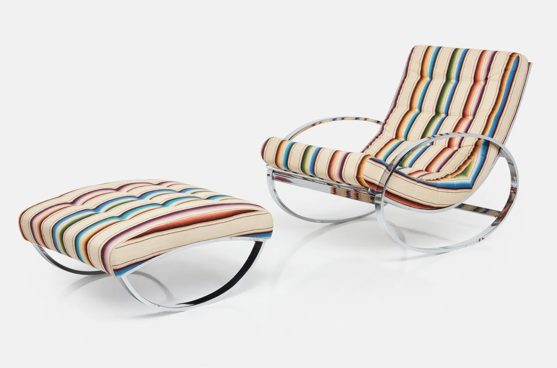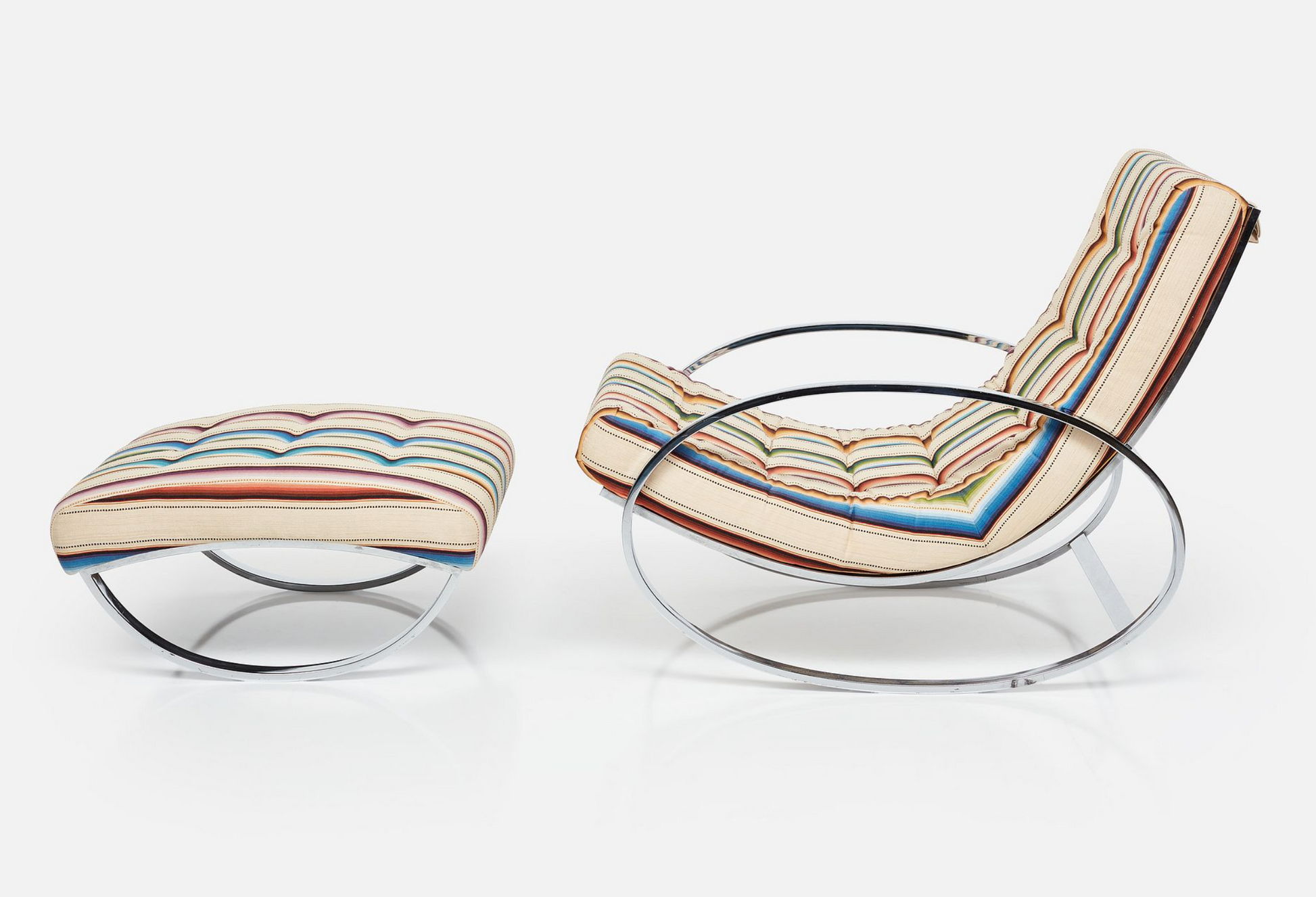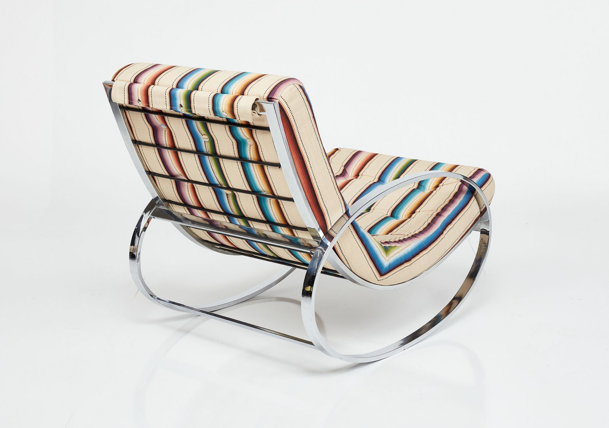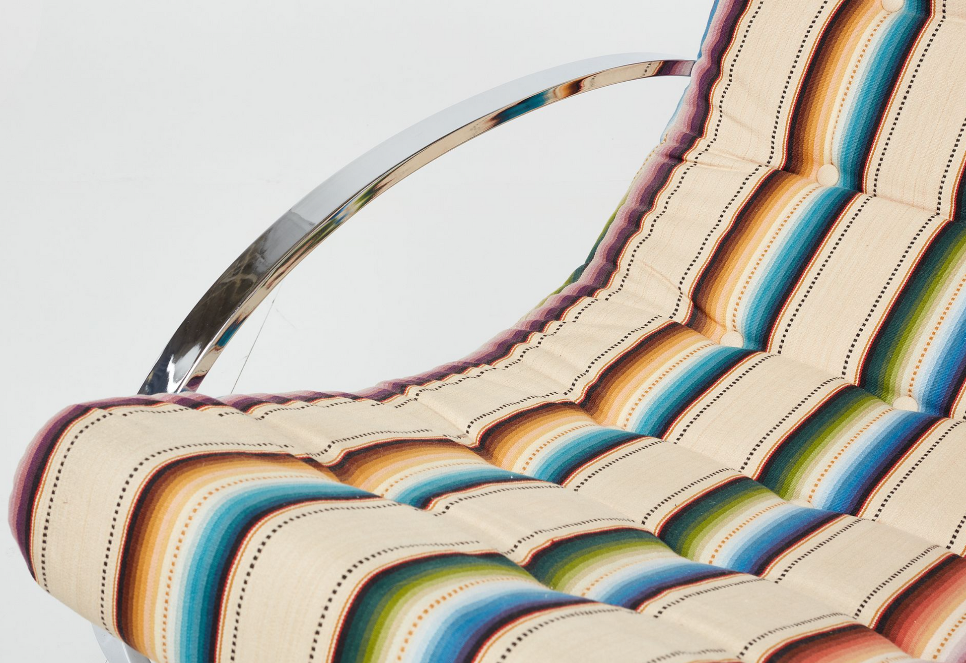 We admire Renato Zevi's designs using chrome in fabulous shapes. Love the shape of this chair and ottoman. The fabric is cool but needs an update.