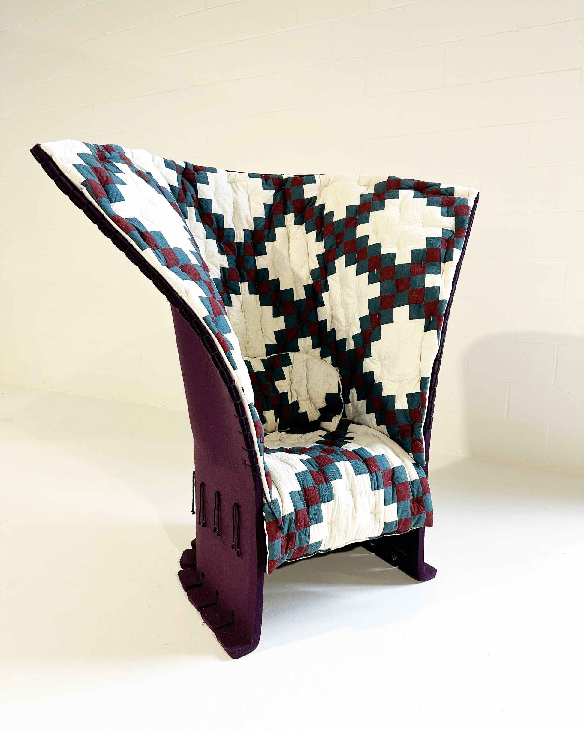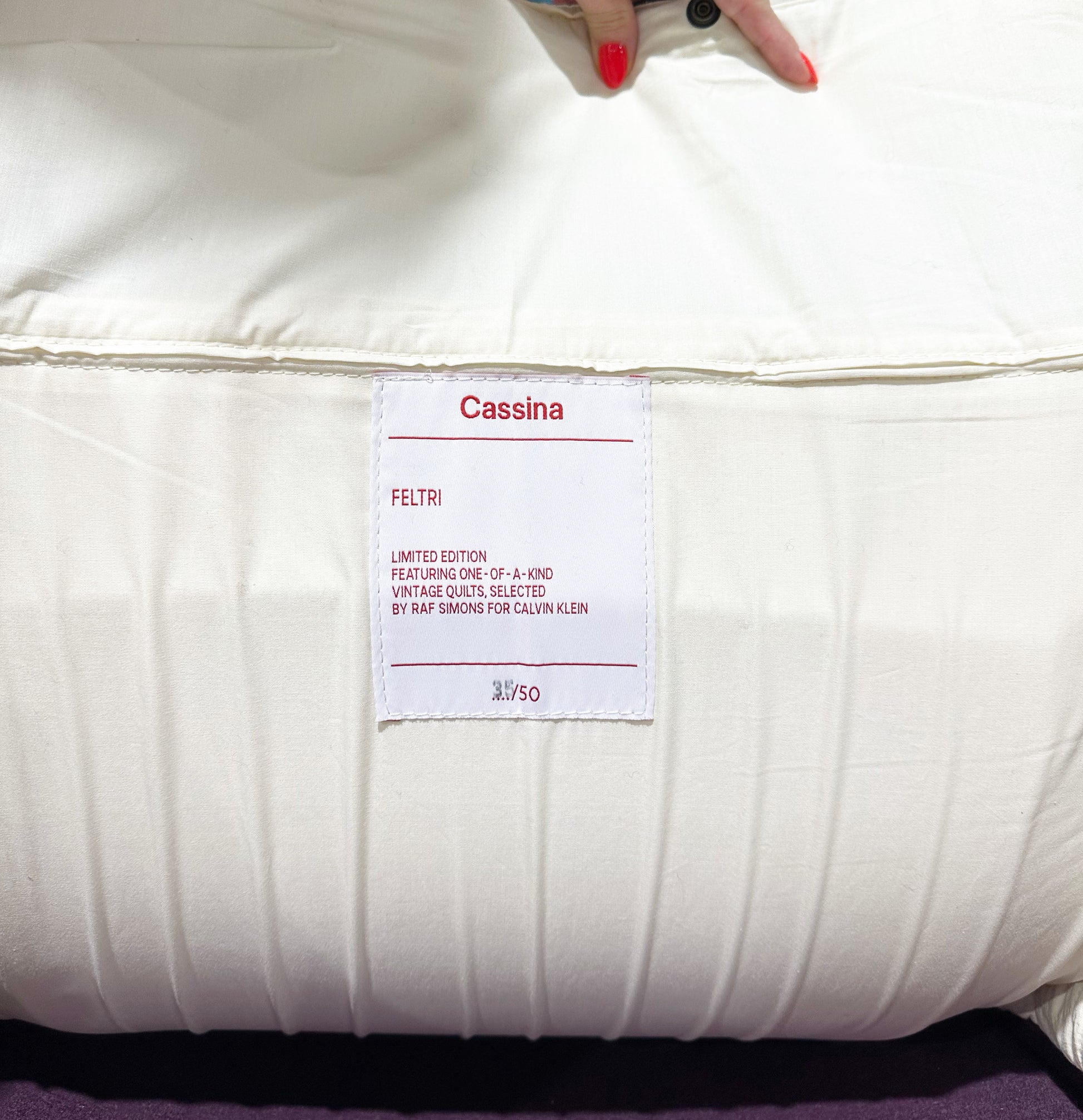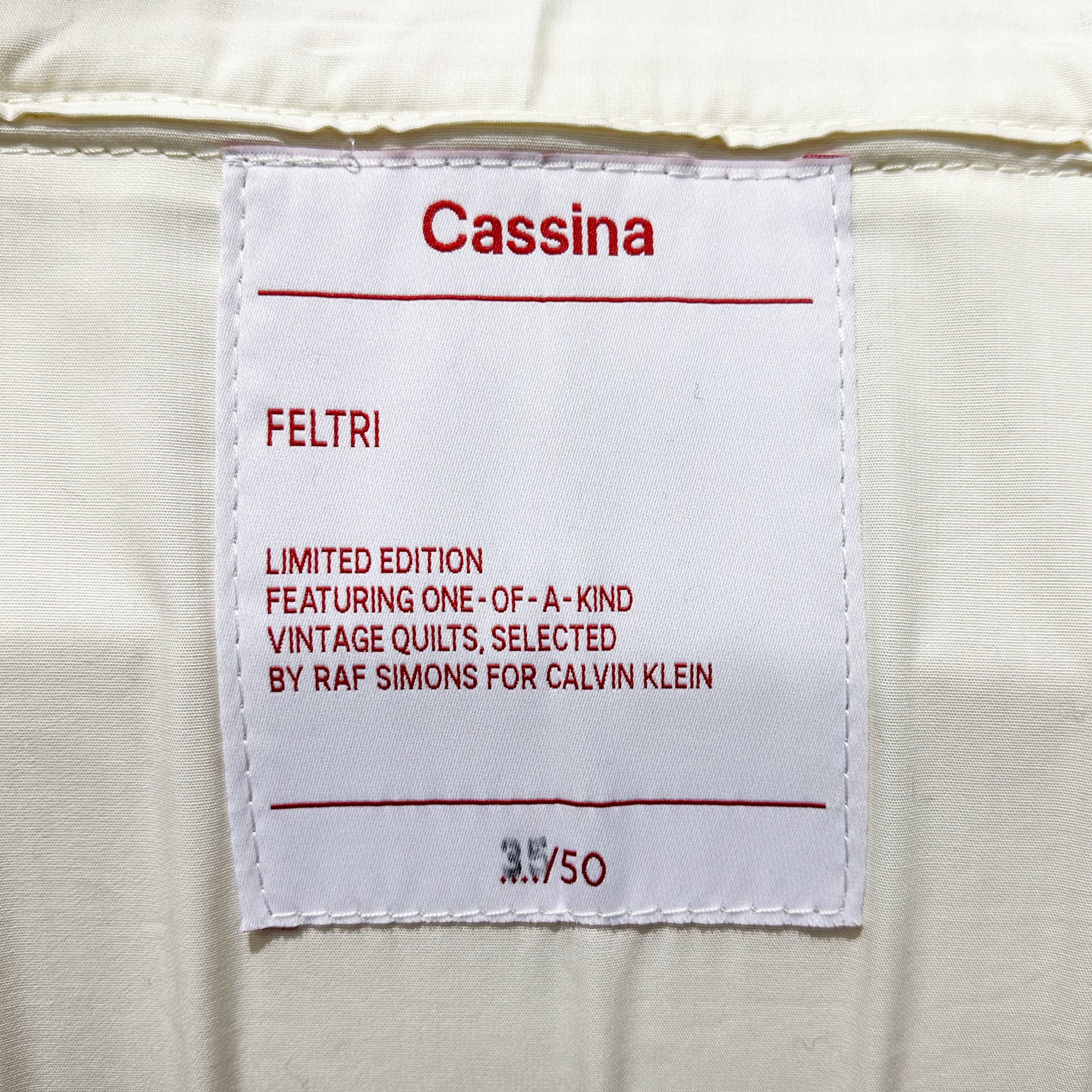 In 2018, at the Design Miami and Art Basel Fair in Switzerland, Calvin Klein unveiled a collaboration between designer Raf Simons, introducing their own take on Gaetano Pesce's famous Feltri chair. The Feltri chair produced by Italian house, Cassina, is a favorite. Made entirely of thick felted wool, the Feltri chair combines an enveloping pliable backrest with a rigid lower section; a quilted topper creates an inviting cocoon. Each chair in the collaboration was upholstered in one of a kind patchwork quilts selected by Simons.