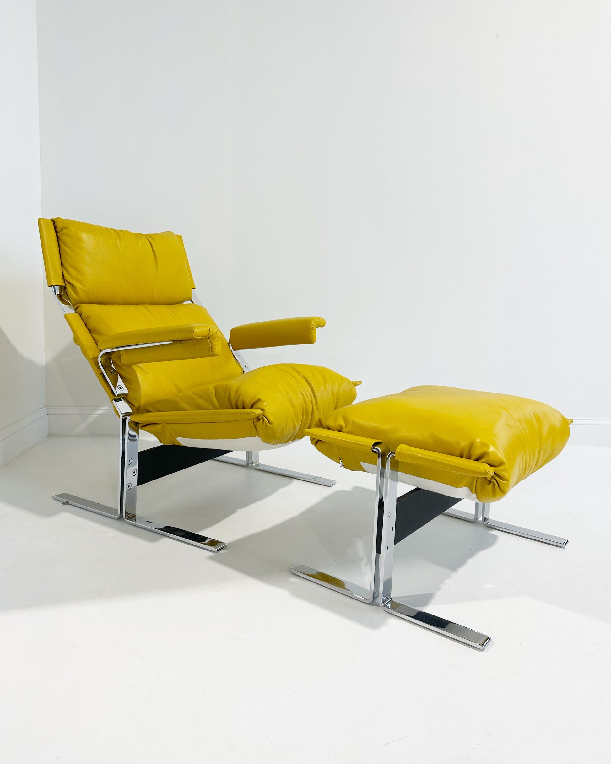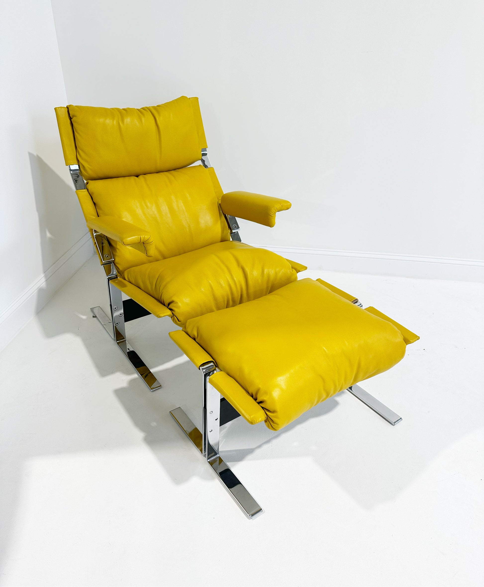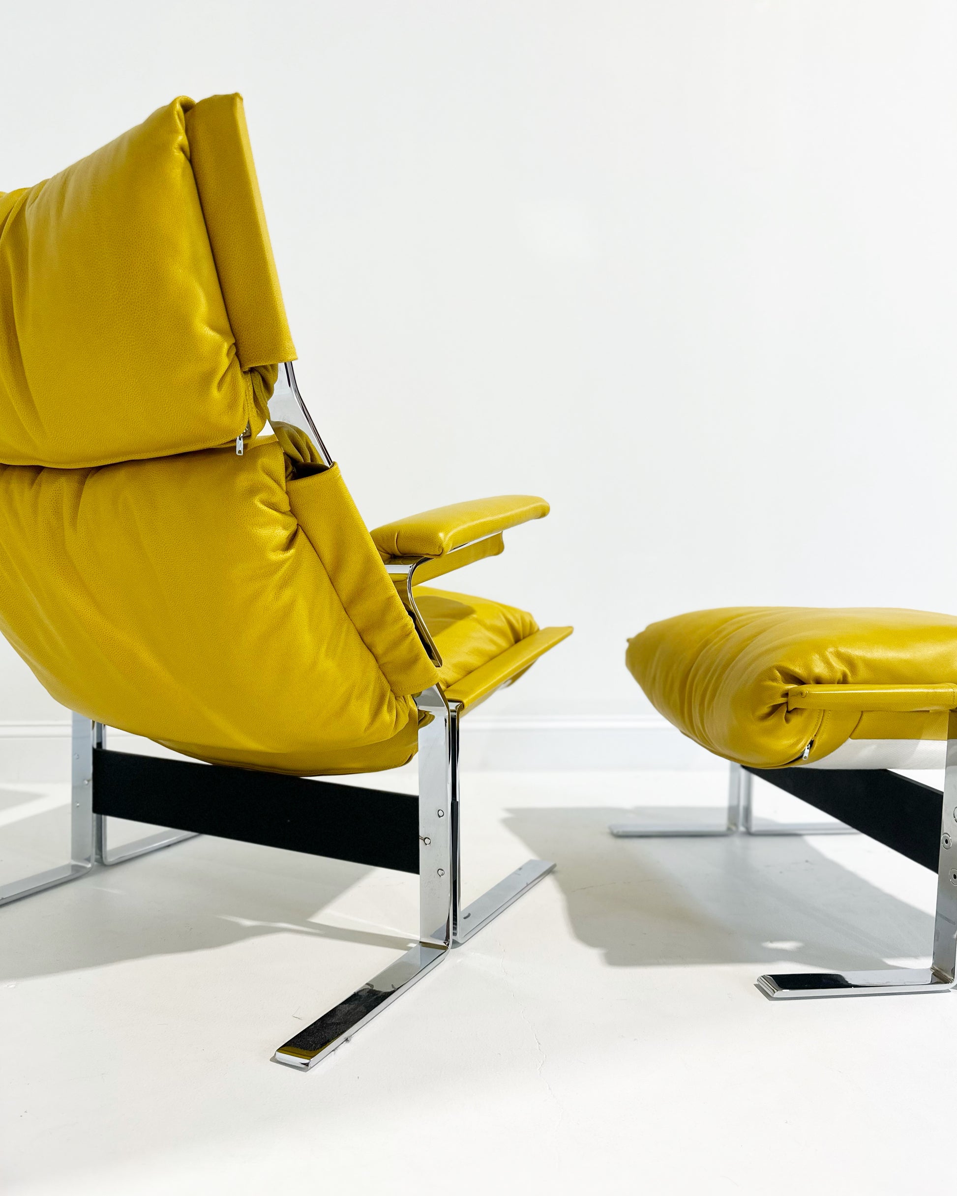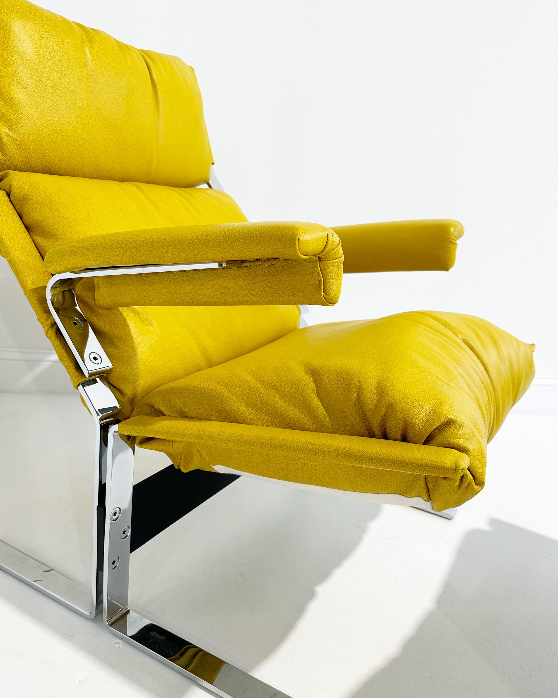 Such a cool chair. Comfortable and heavy in a cool mustard yellow leather.