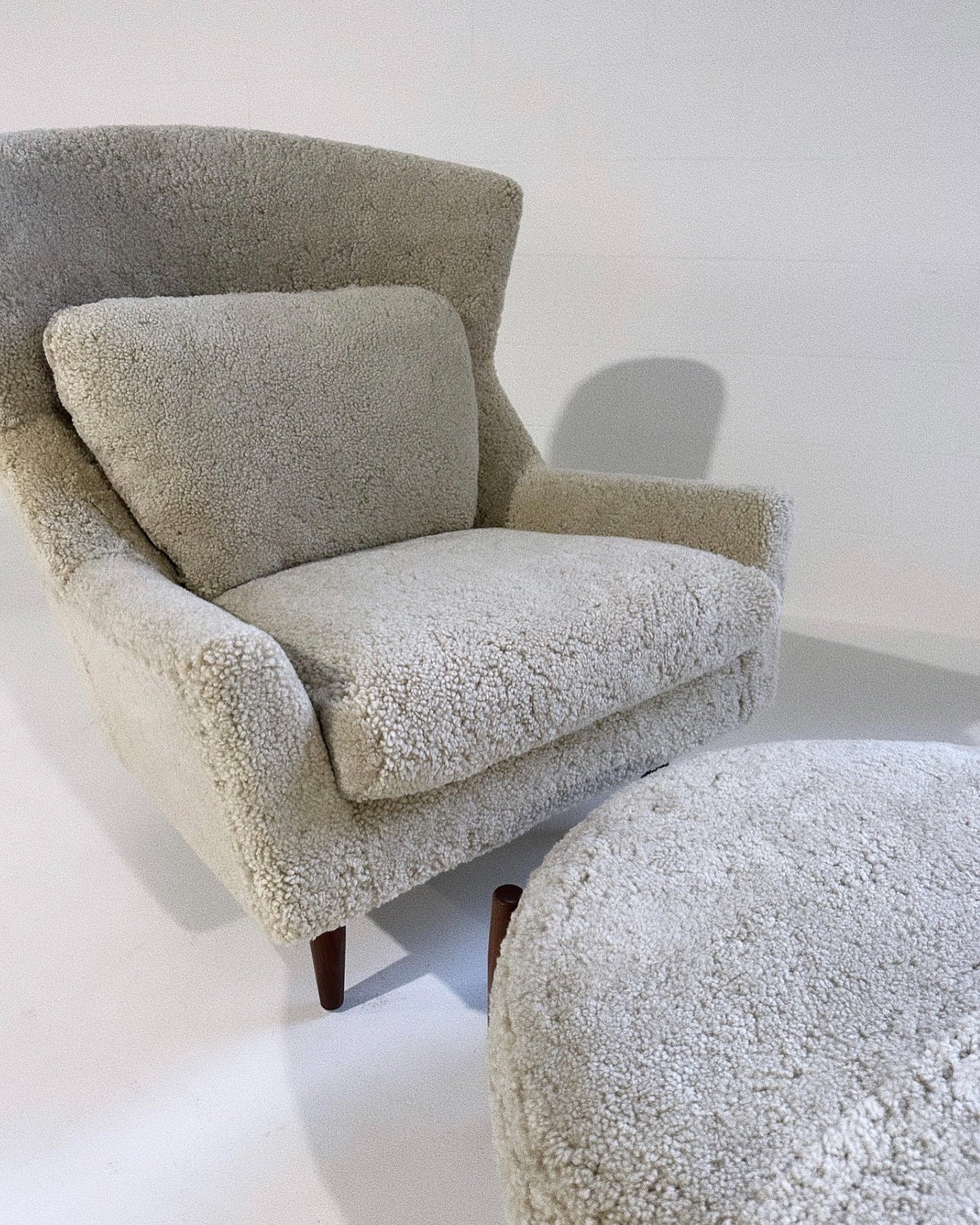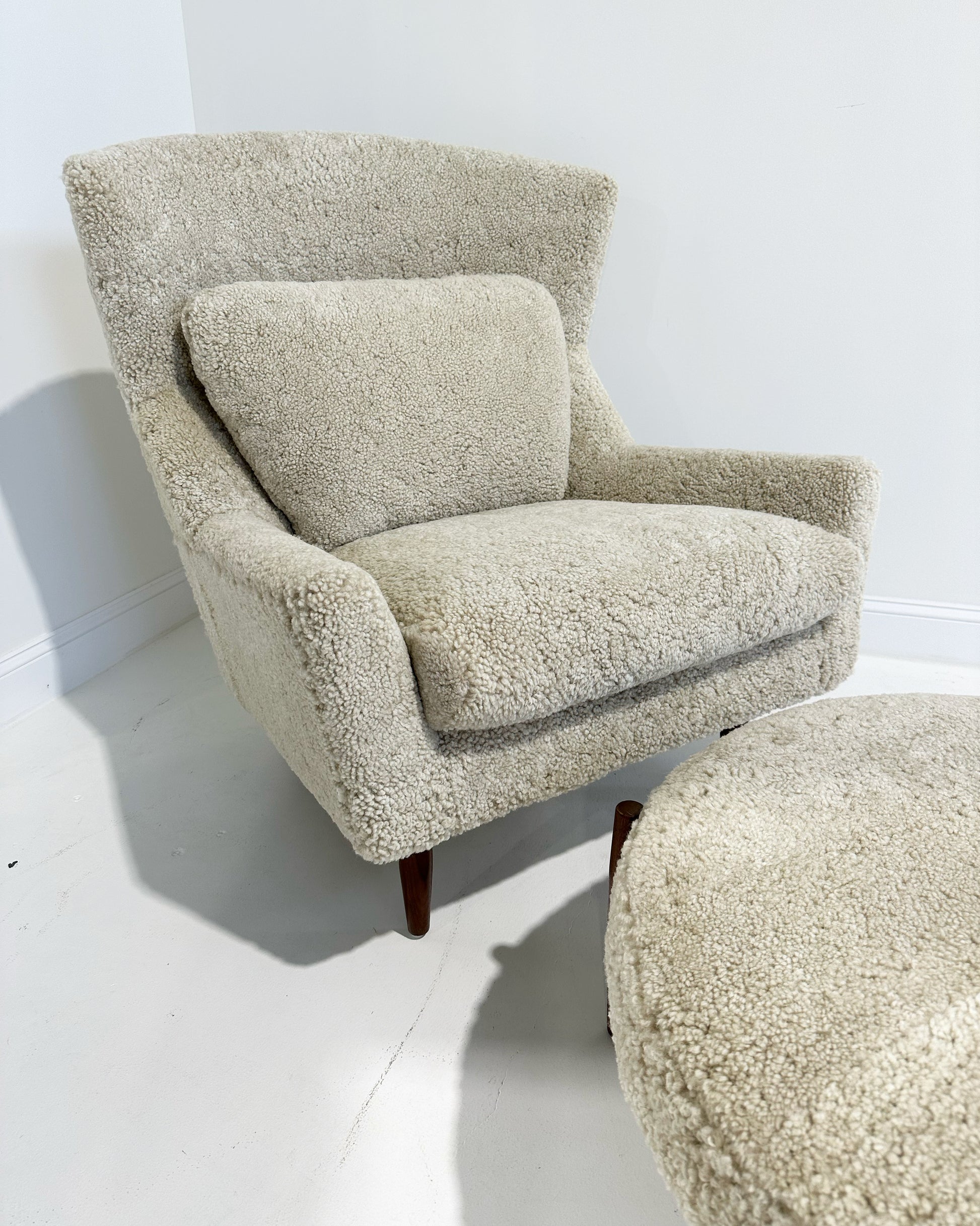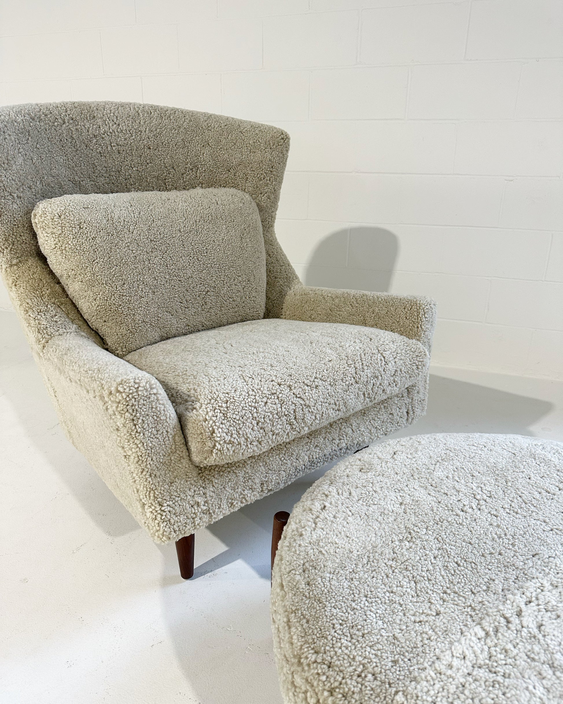 We love the scale of this lounge chair. It's big and wide and beautiful. The chair and ottoman have been meticulously restored in one of our favorite shearlings. This is a statement chair.