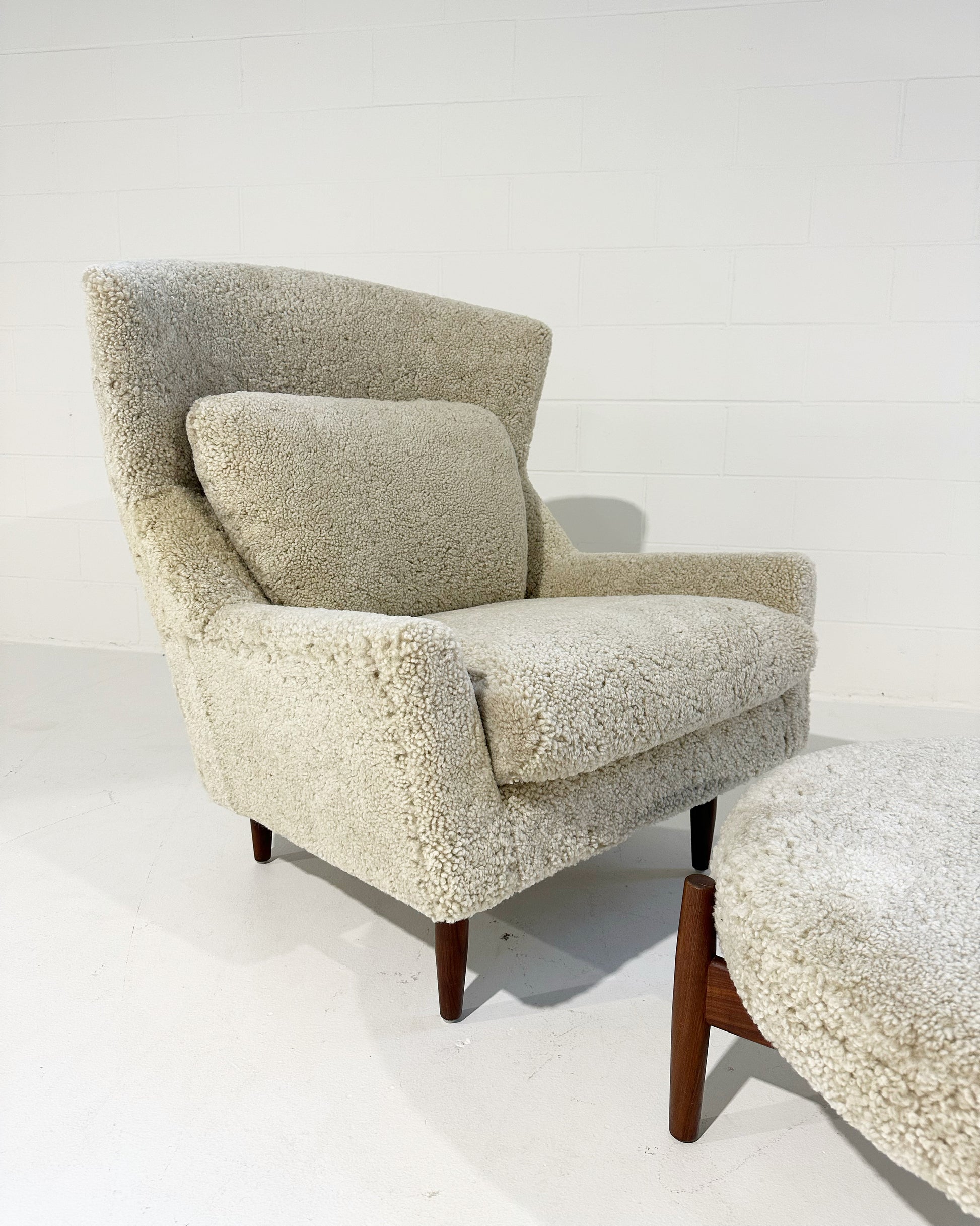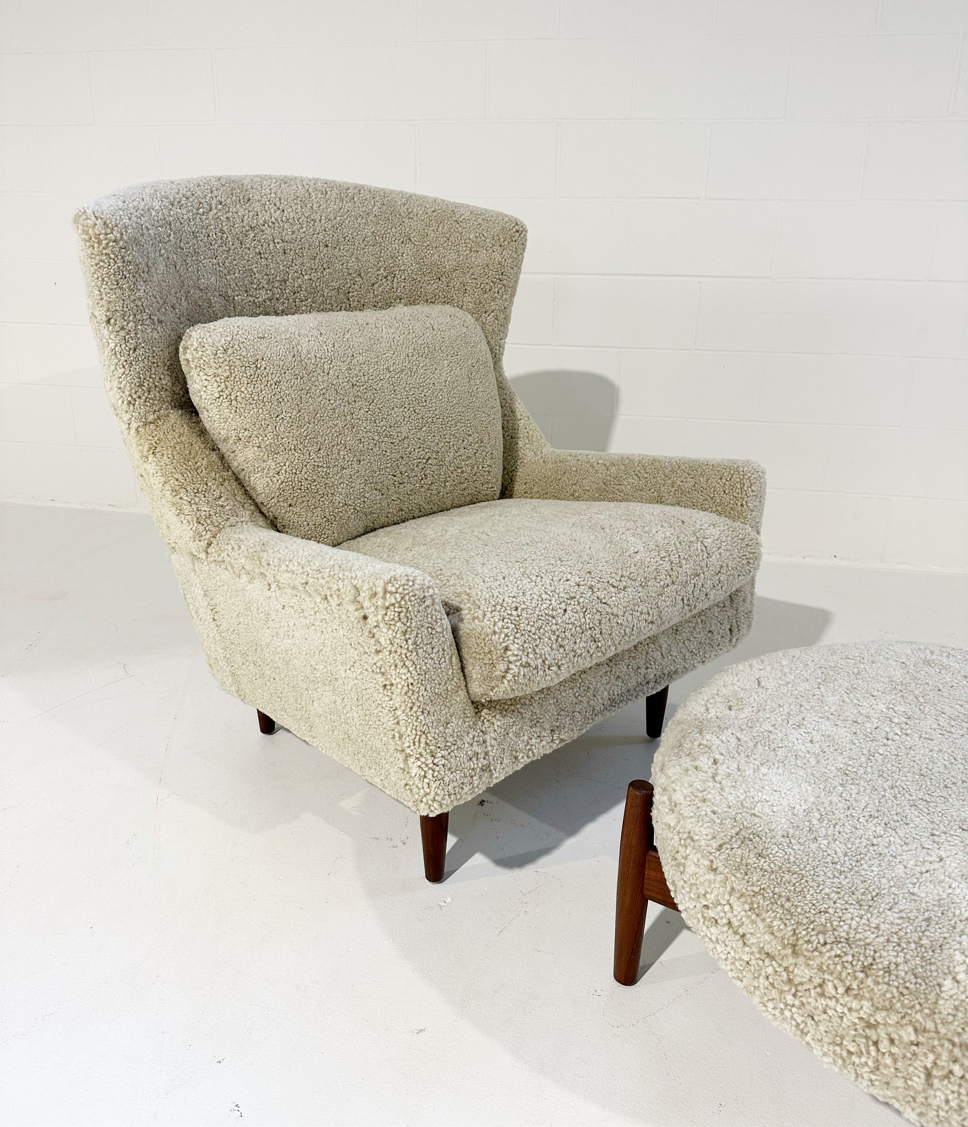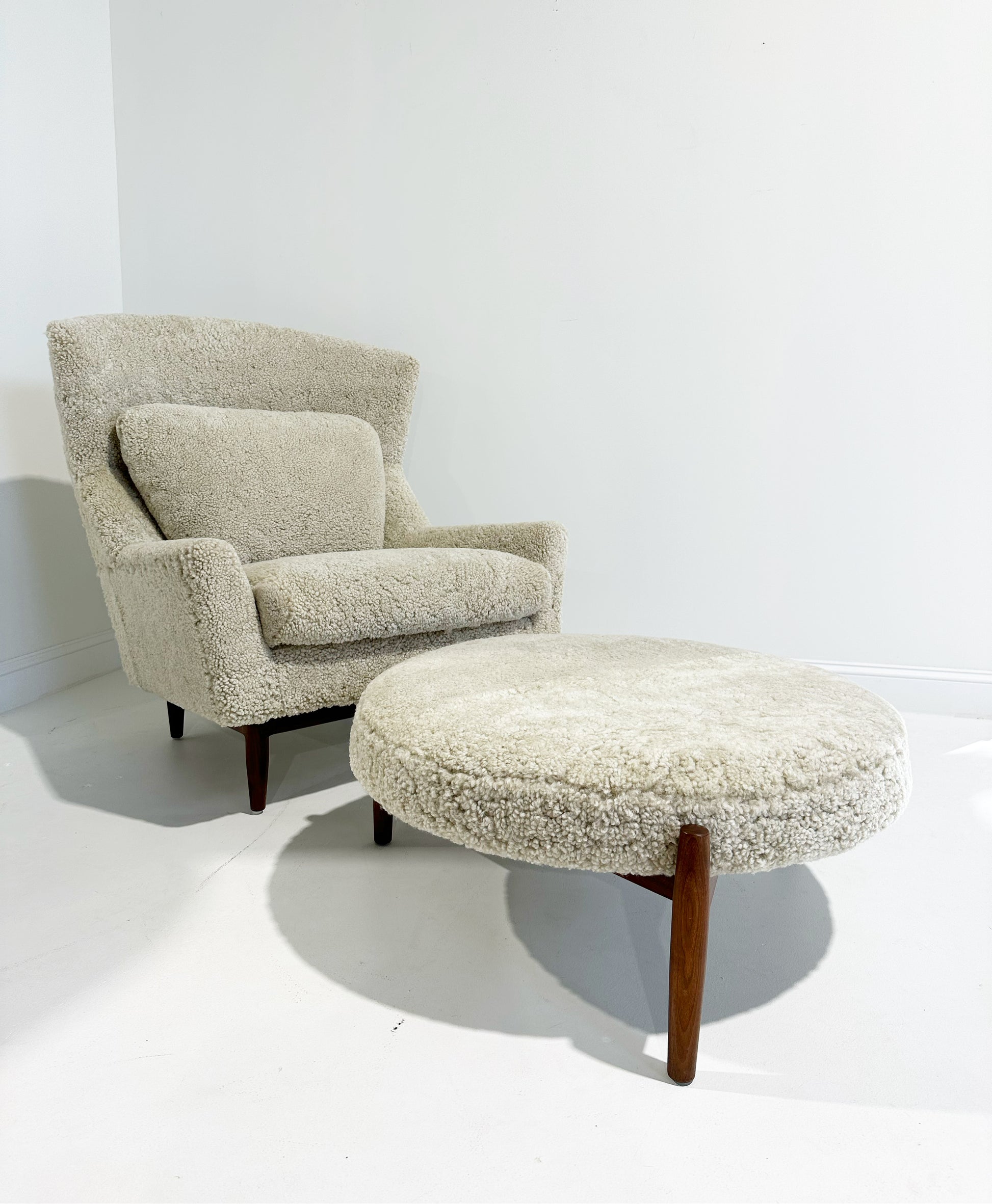 We love the scale of this lounge chair. It's big and wide and beautiful. The chair and ottoman have been meticulously restored in one of our favorite shearlings. This is a statement chair.