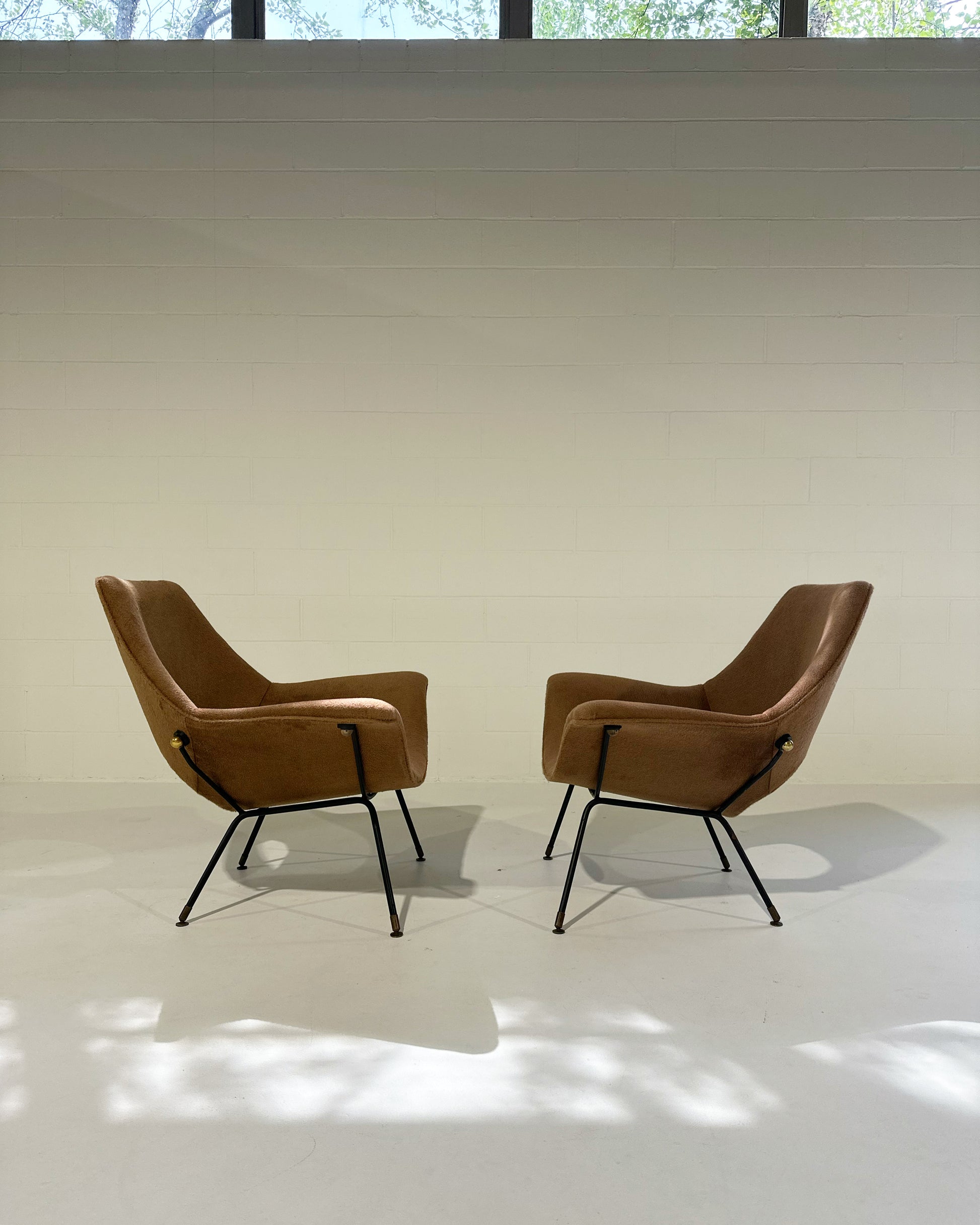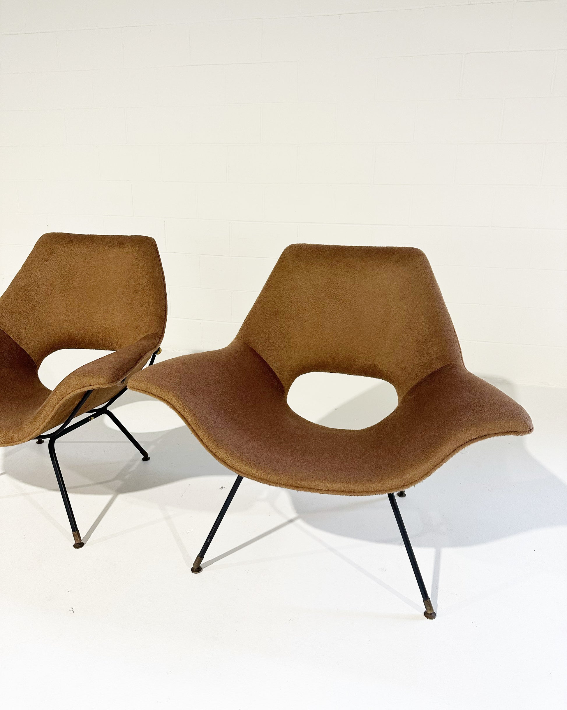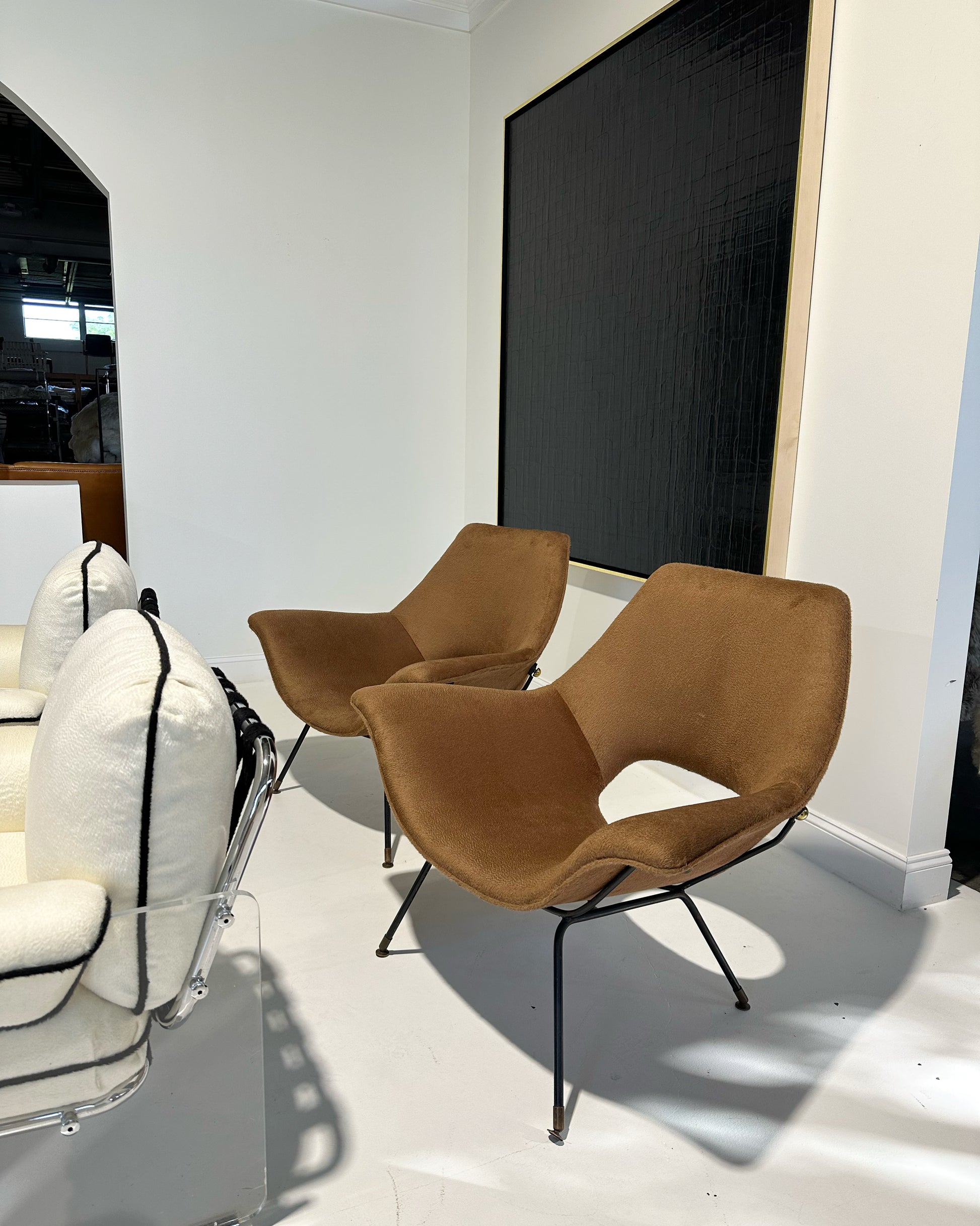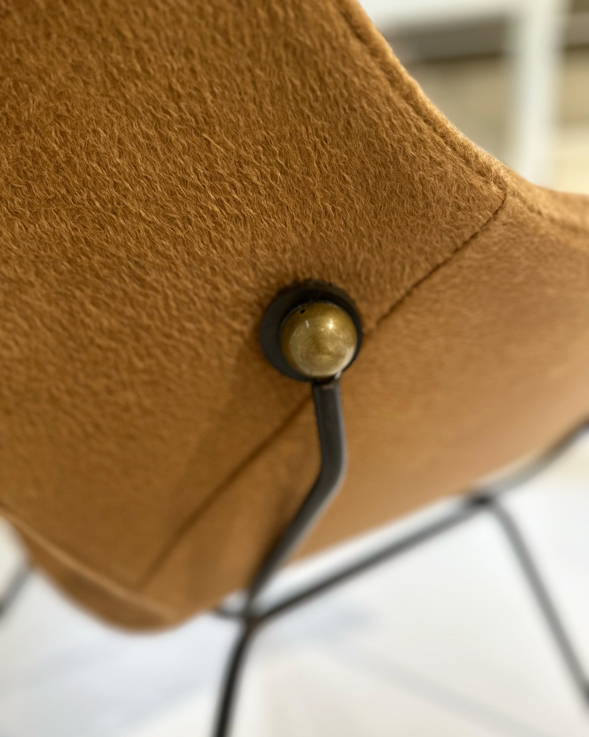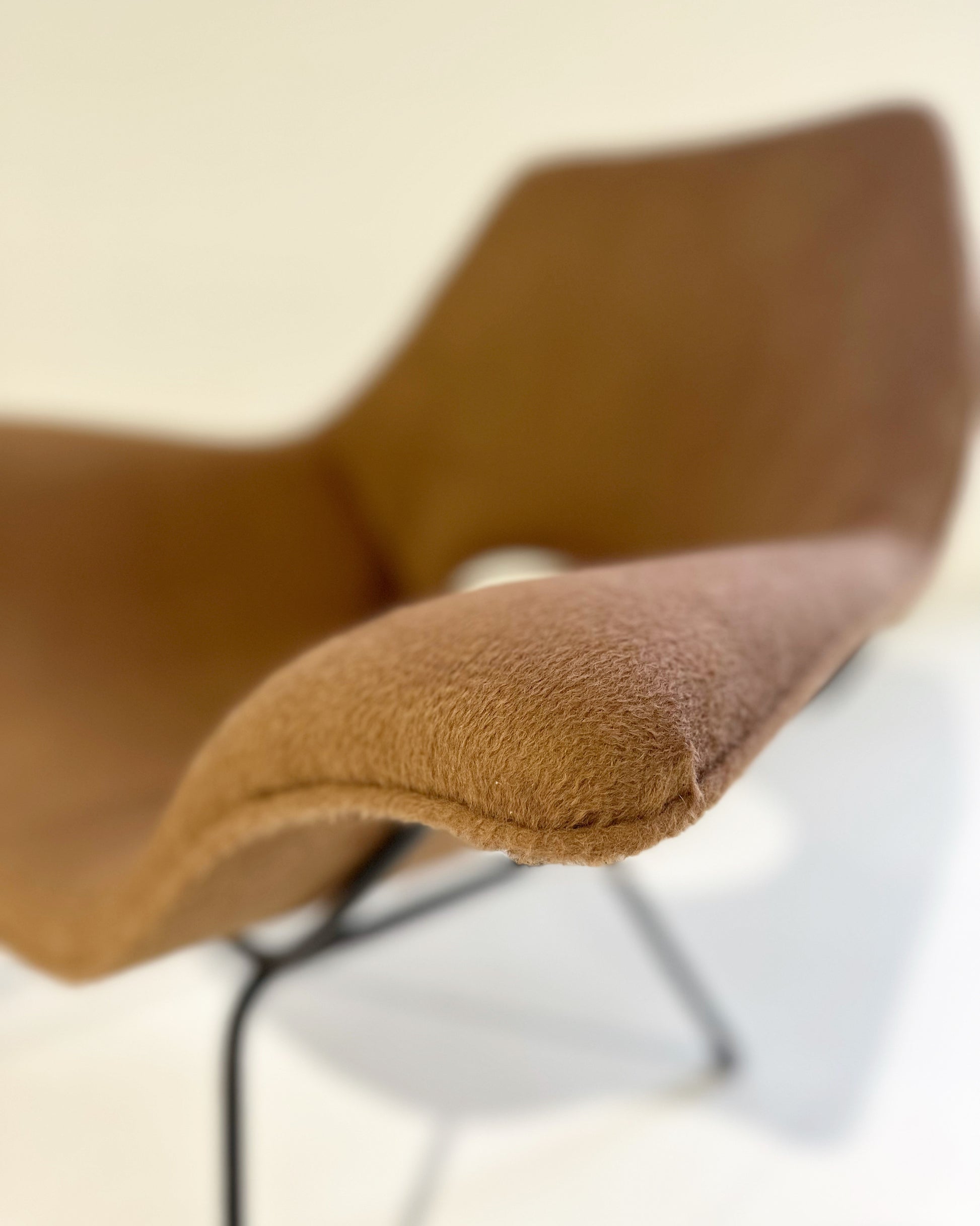 Augusto Bozzi was an Italian furniture designer, working closely with manufacturer, Saporiti. These amazing lounge chairs have a such a cool winged shape. They have been masterfully upholstered in a soft and luxurious baby alpaca fabric by French label, Inata. The Boga fabric in Camel colorway is effortlessly chic.