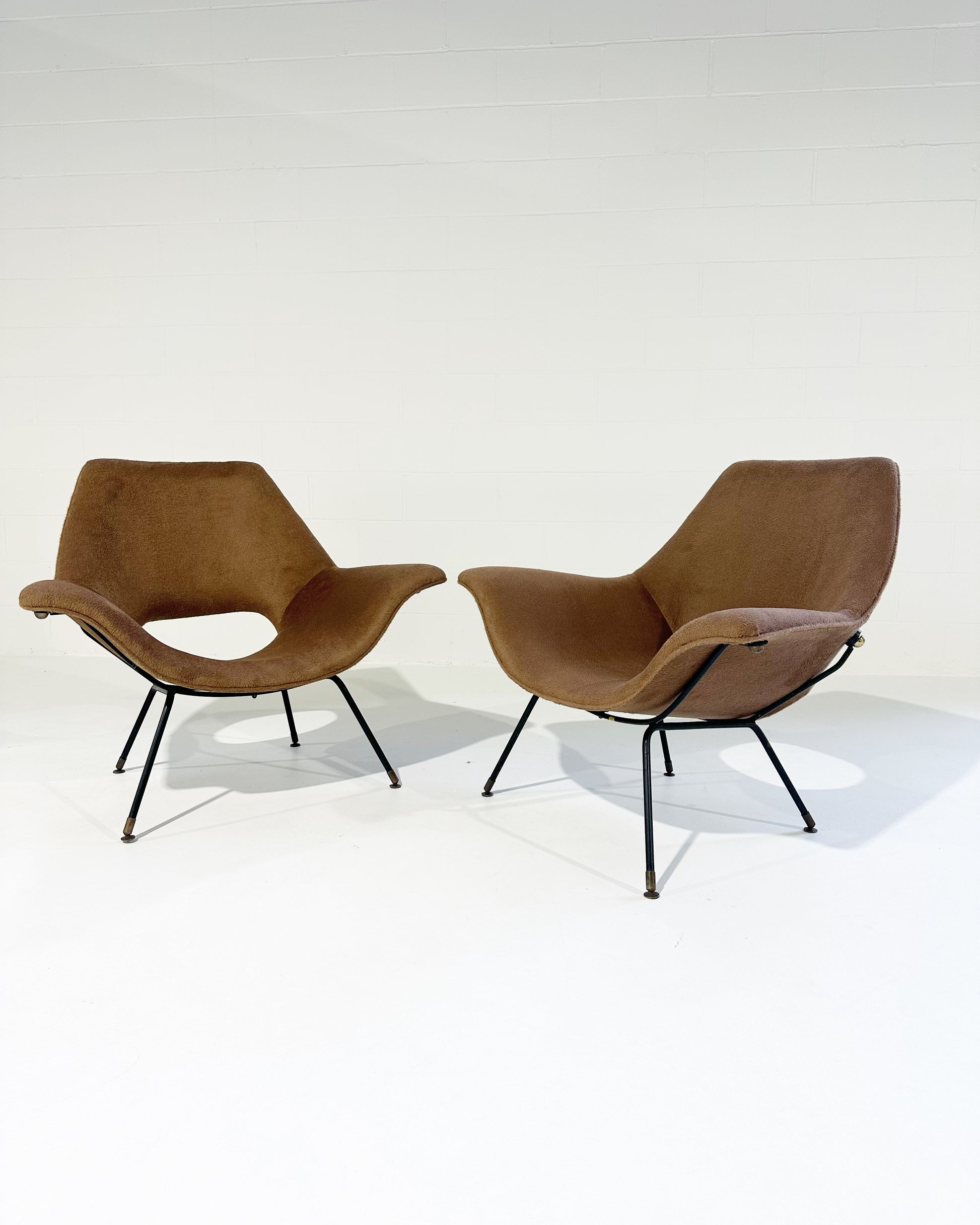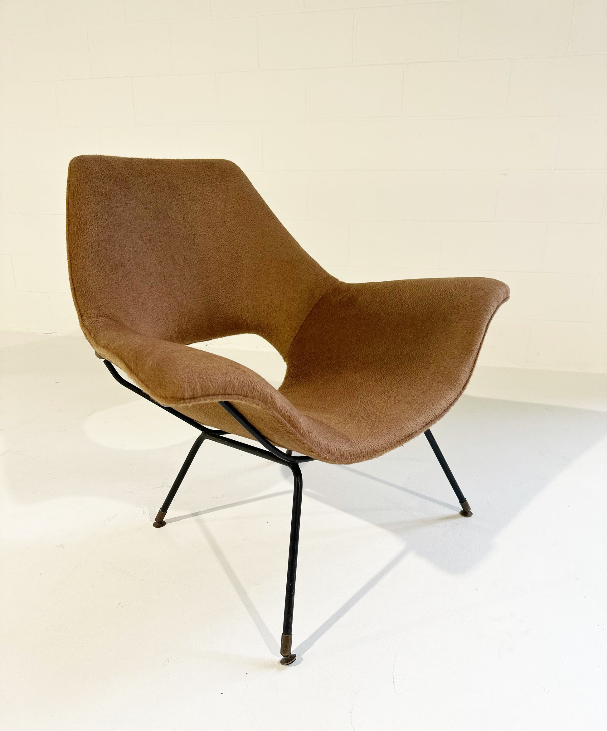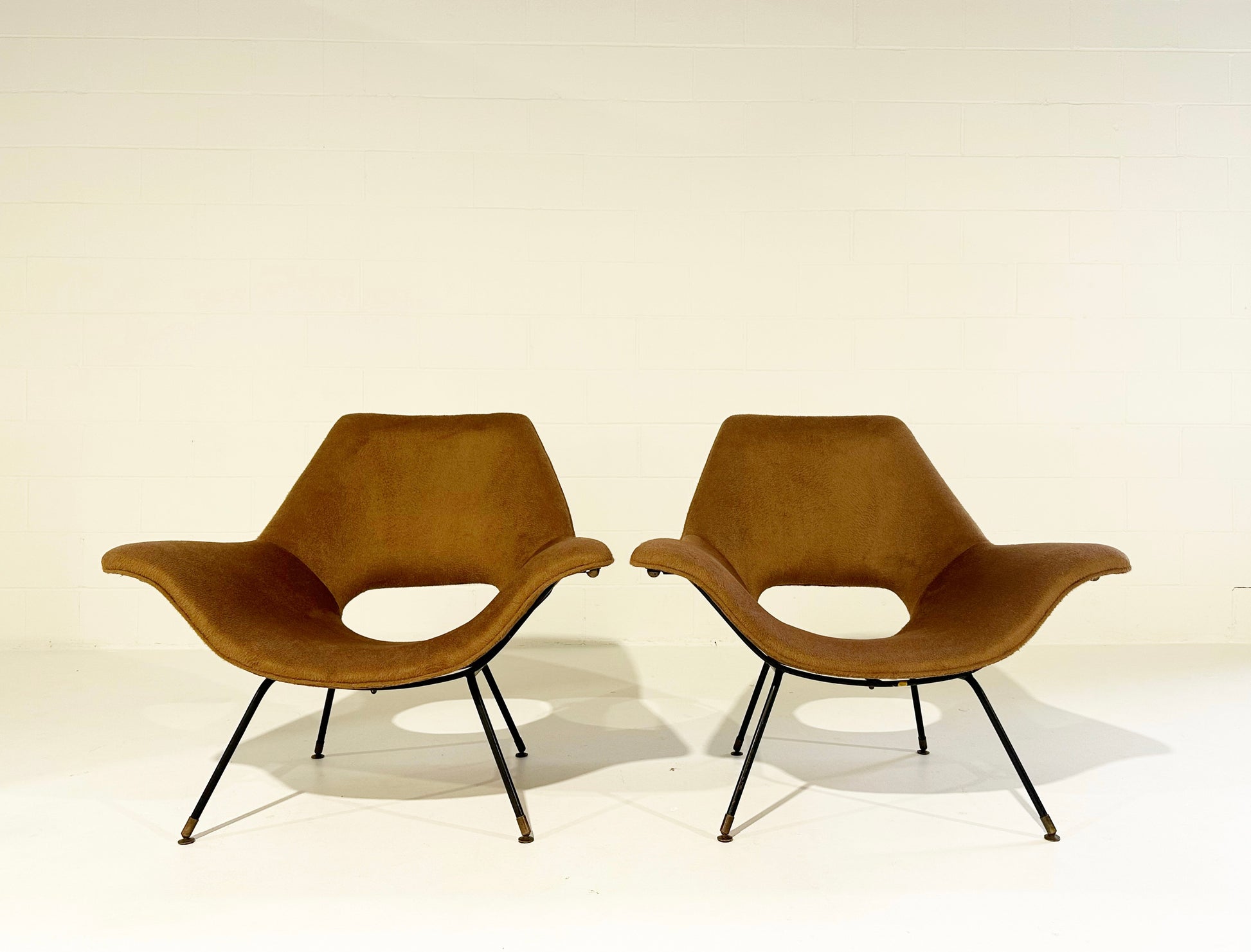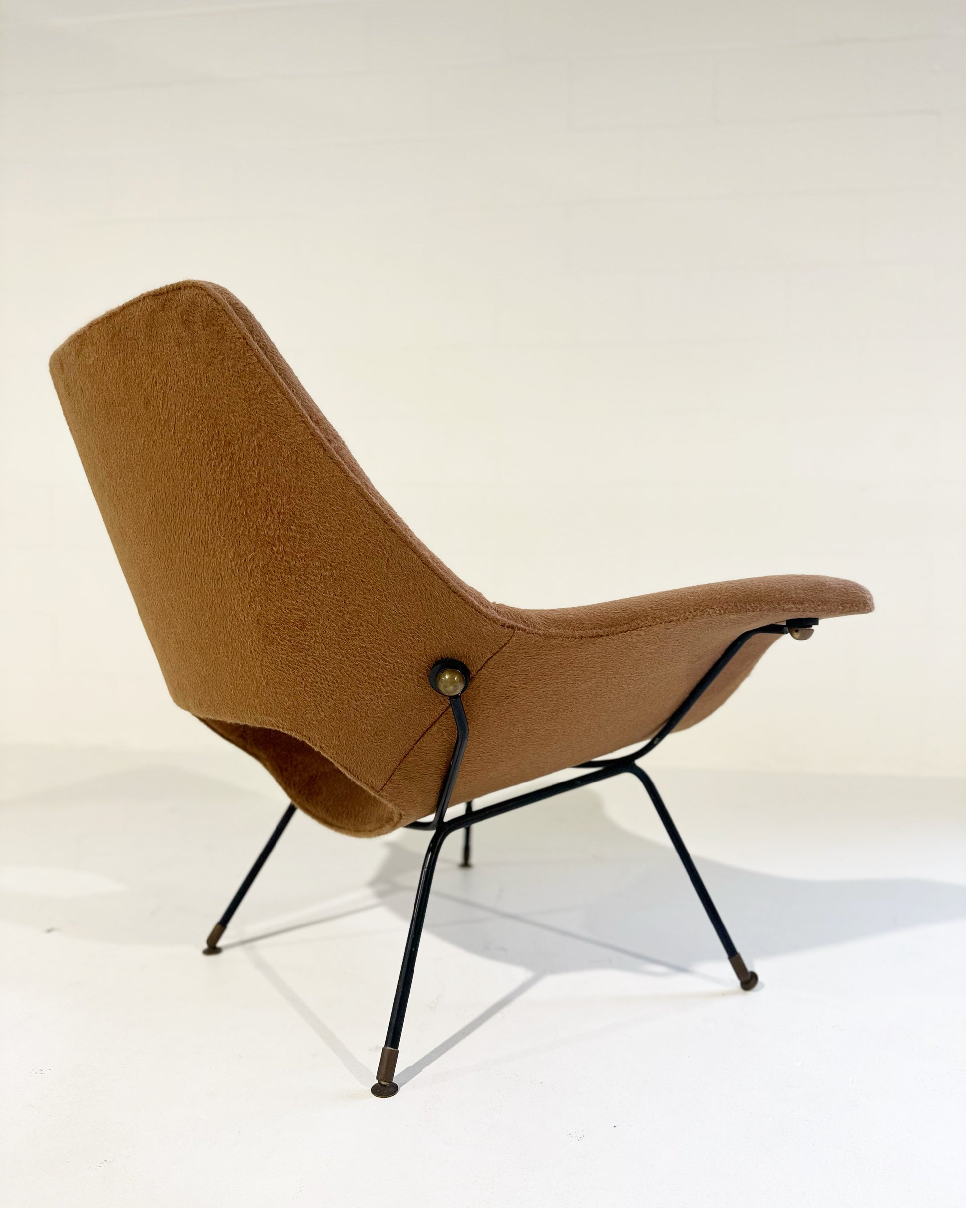 Augusto Bozzi was an Italian furniture designer, working closely with manufacturer, Saporiti. These amazing lounge chairs have a such a cool winged shape. They have been masterfully upholstered in a soft and luxurious baby alpaca fabric by French label, Inata. The Boga fabric in Camel colorway is effortlessly chic.