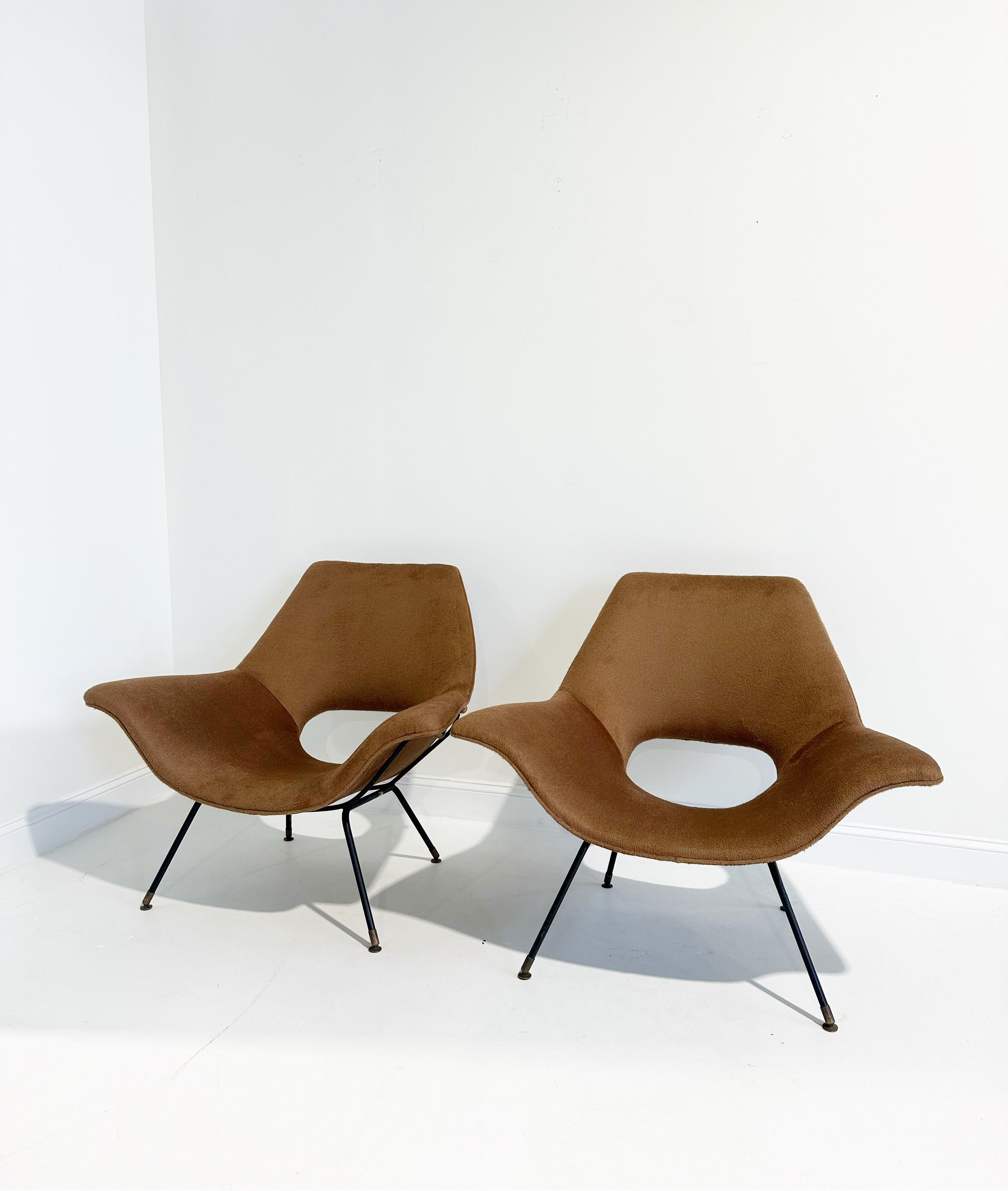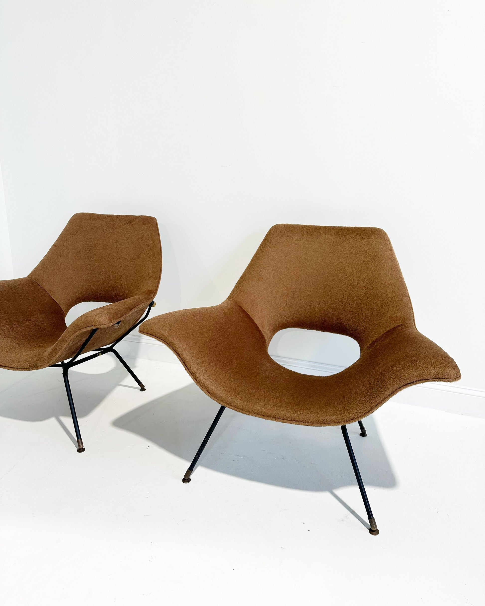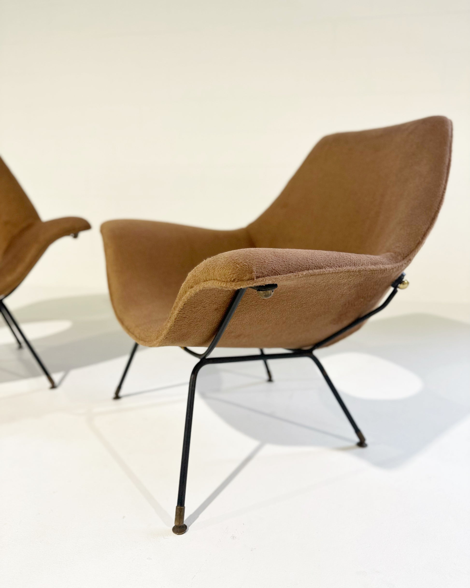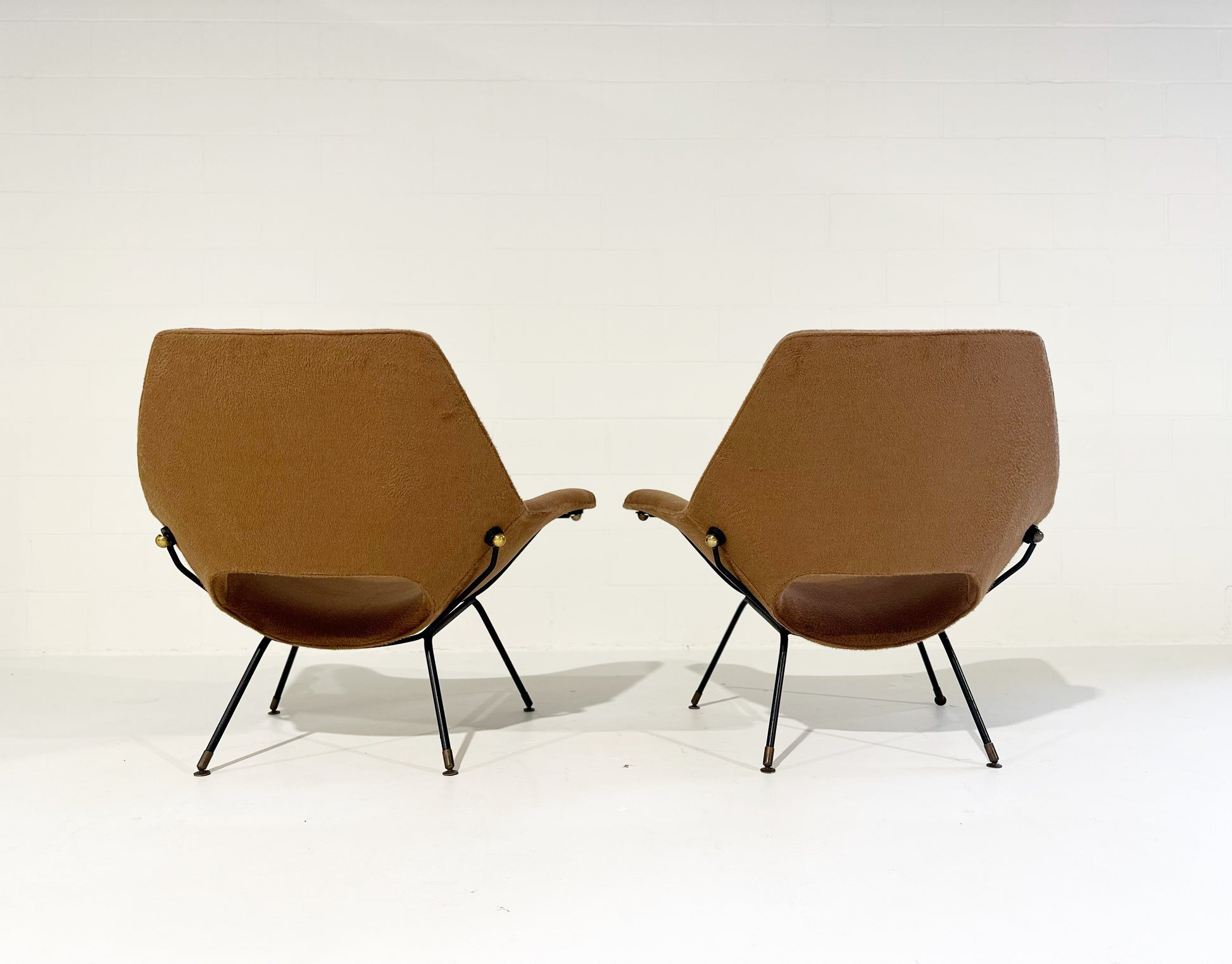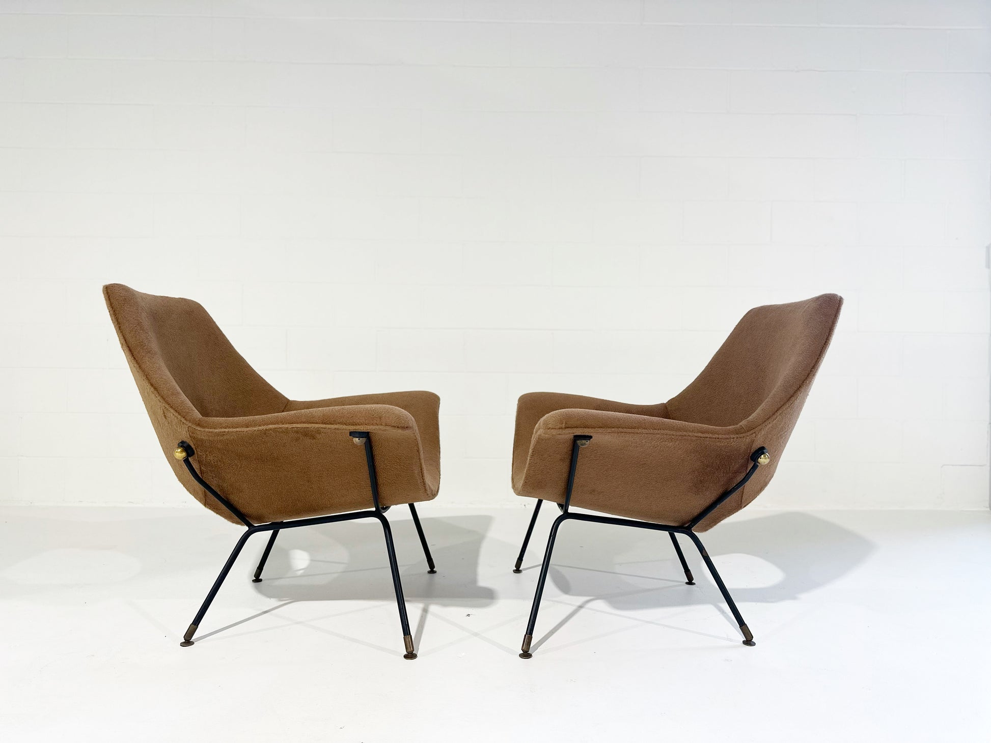 Augusto Bozzi was an Italian furniture designer, working closely with manufacturer, Saporiti. These amazing lounge chairs have a such a cool winged shape. They have been masterfully upholstered in a soft and luxurious baby alpaca fabric by French label, Inata. The Boga fabric in Camel colorway is effortlessly chic.