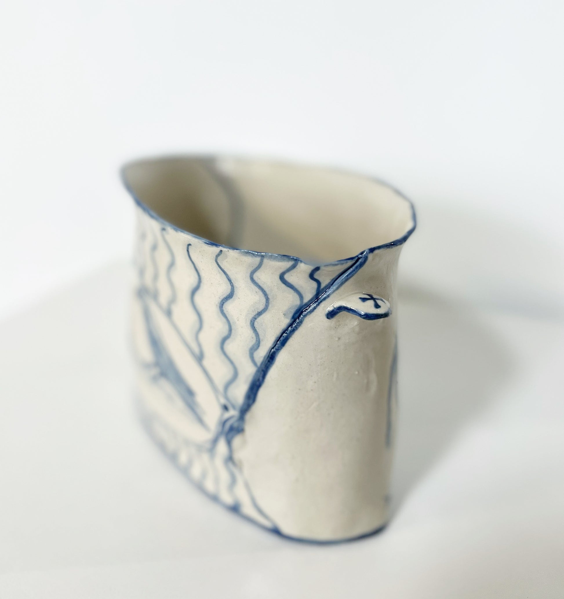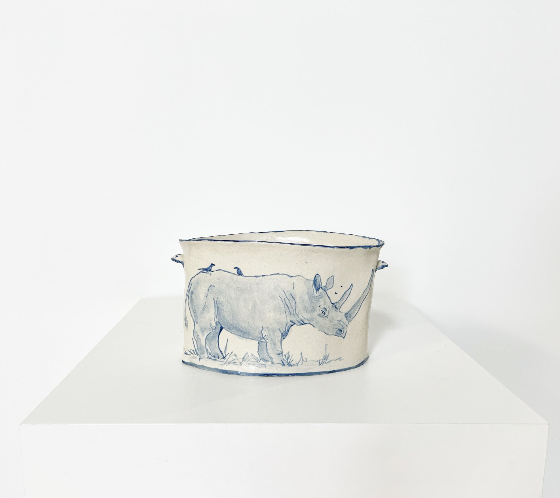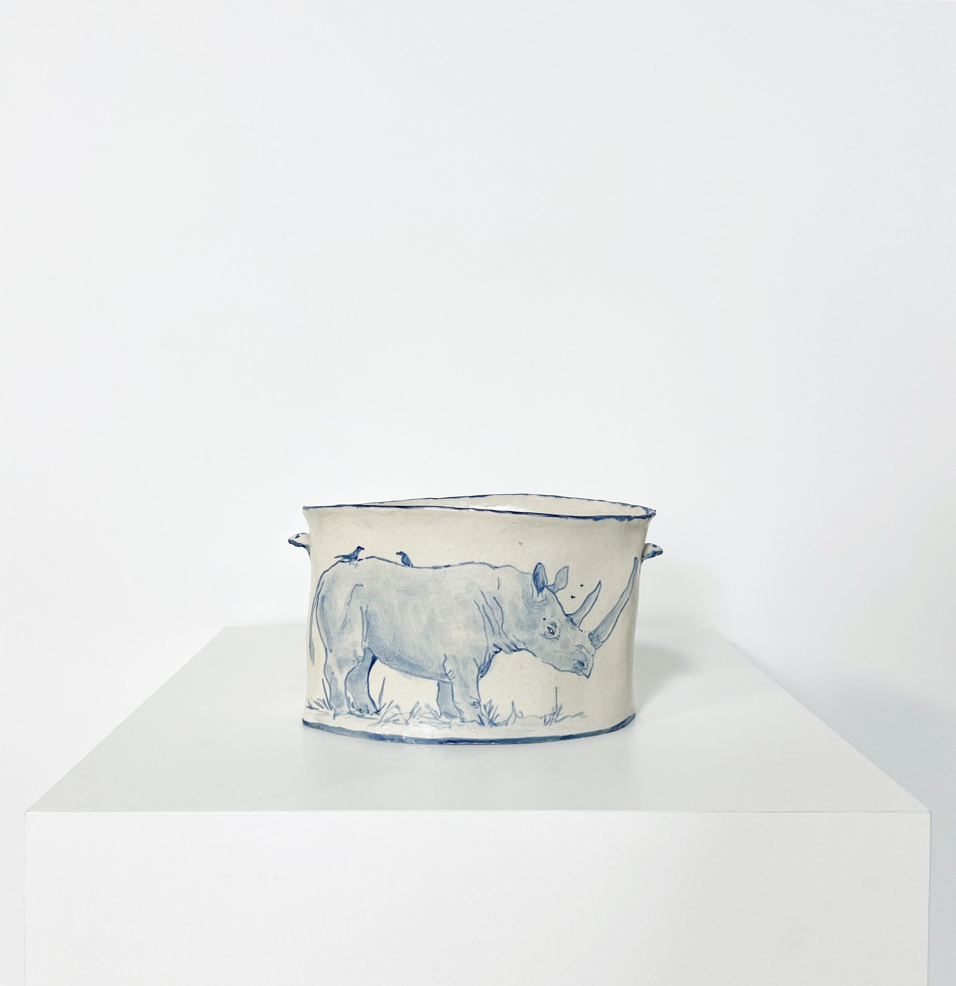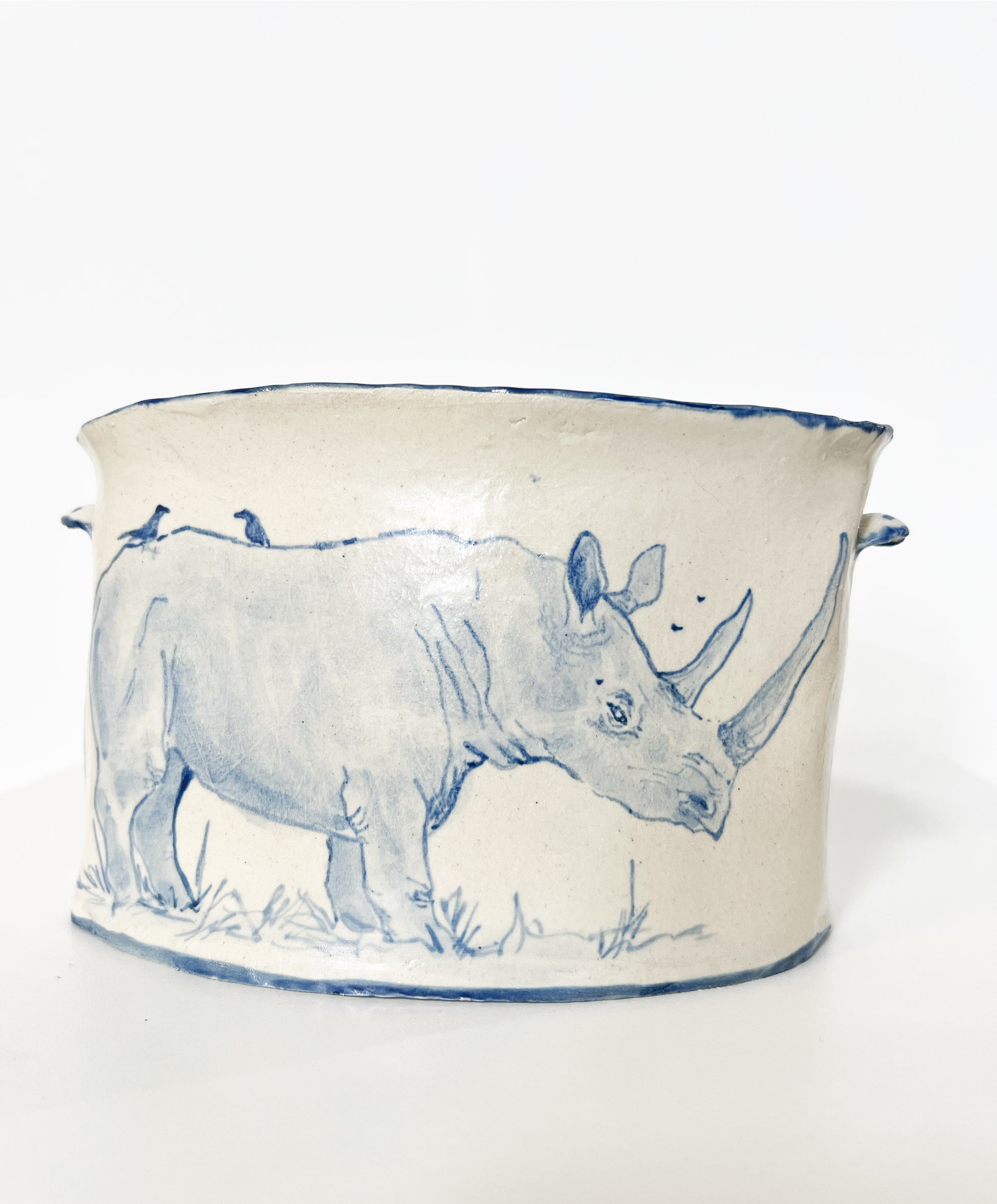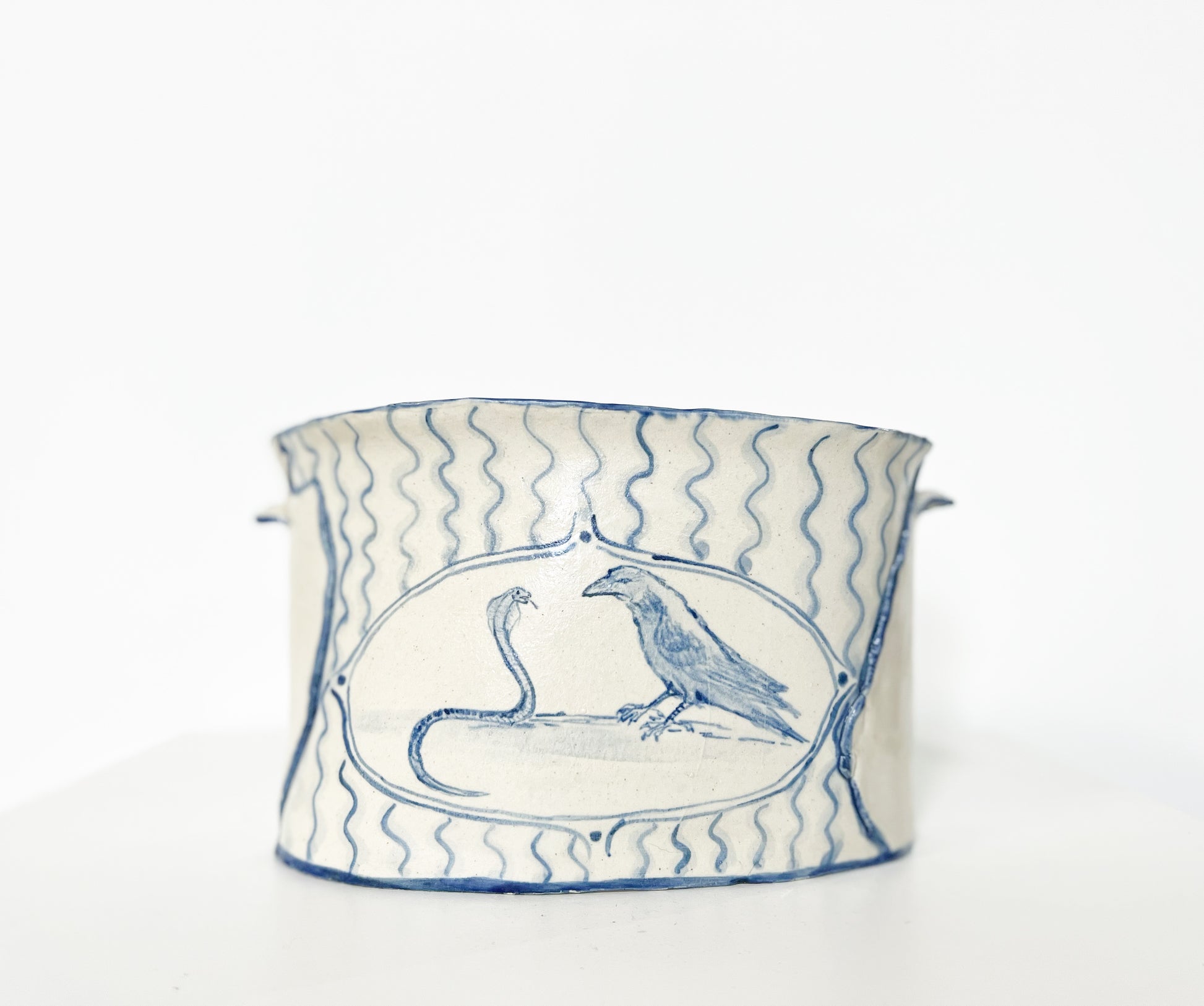 The Country Gentleman Collection by artist Maggie Robertson is a beautiful series of one-of-a-kind stoneware vessels. Each unique piece embraces the seams and irregularities of her hand-built technique complemented by intricate, hand-painted scenes of the English countryside in classic blue and white. The vessels are water tight and food safe, microwaveable and dishwasher safe; however, as they are art pieces and fragile, we would recommend hand washing.