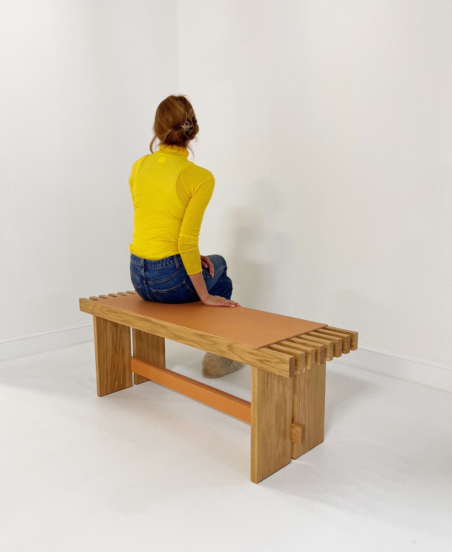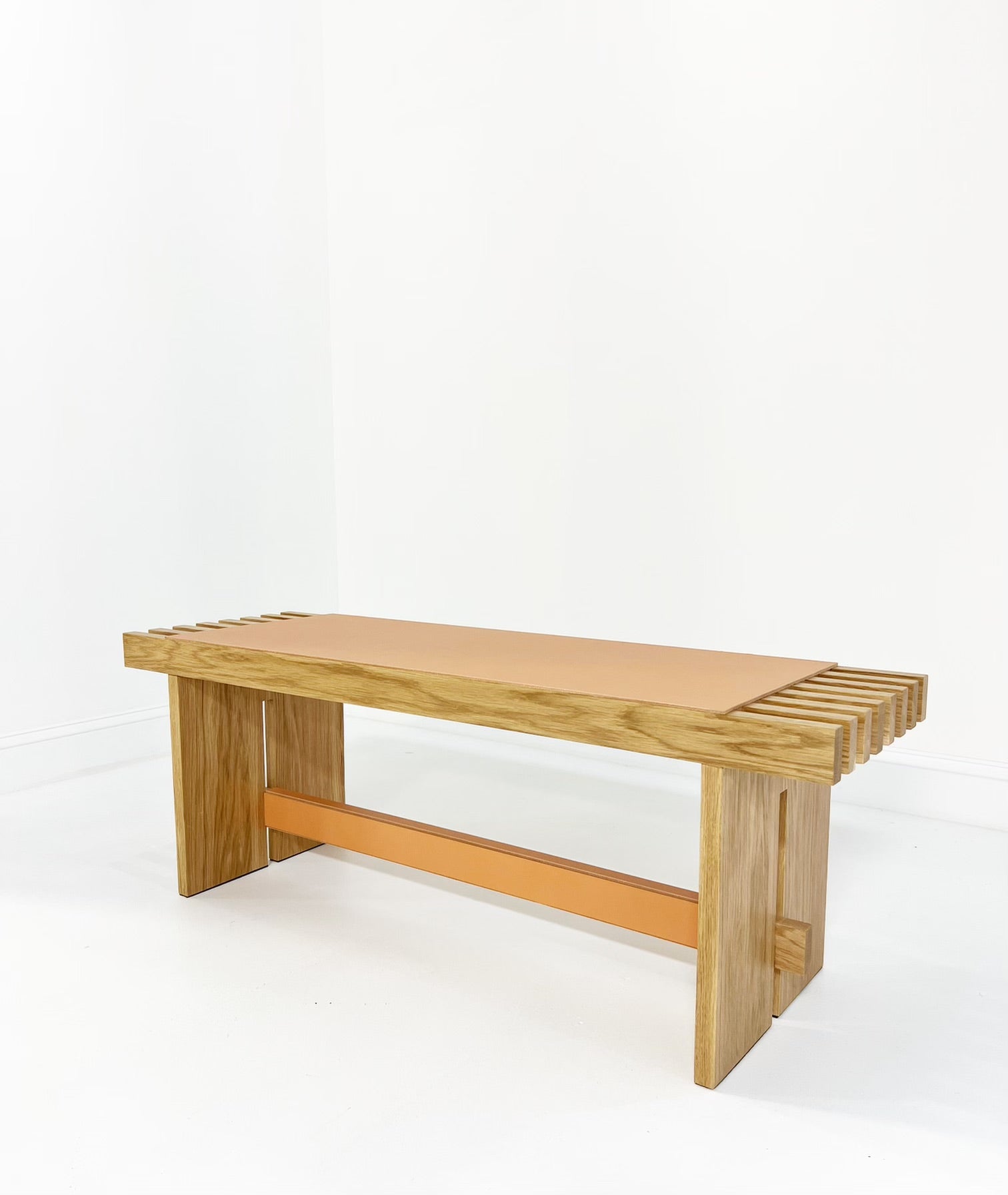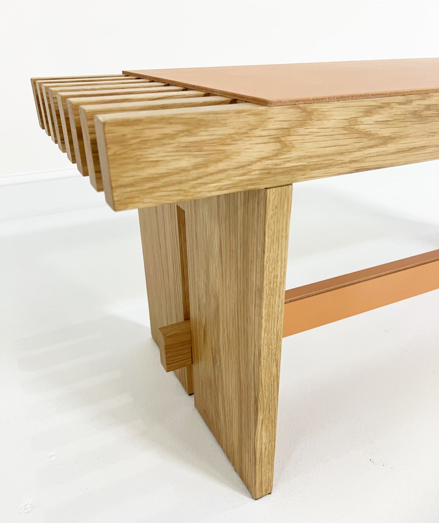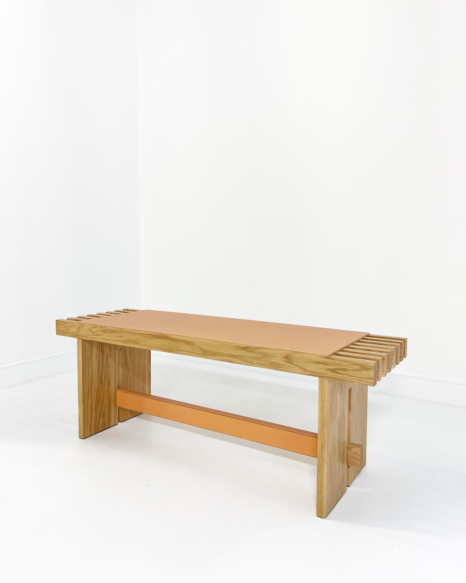 The Yuga Bench, designed by Simone Fanciullacci, is solid ashwood is topped with a saddle leather seat. Its expert and refined detailing enhances the preciousness of the materials.