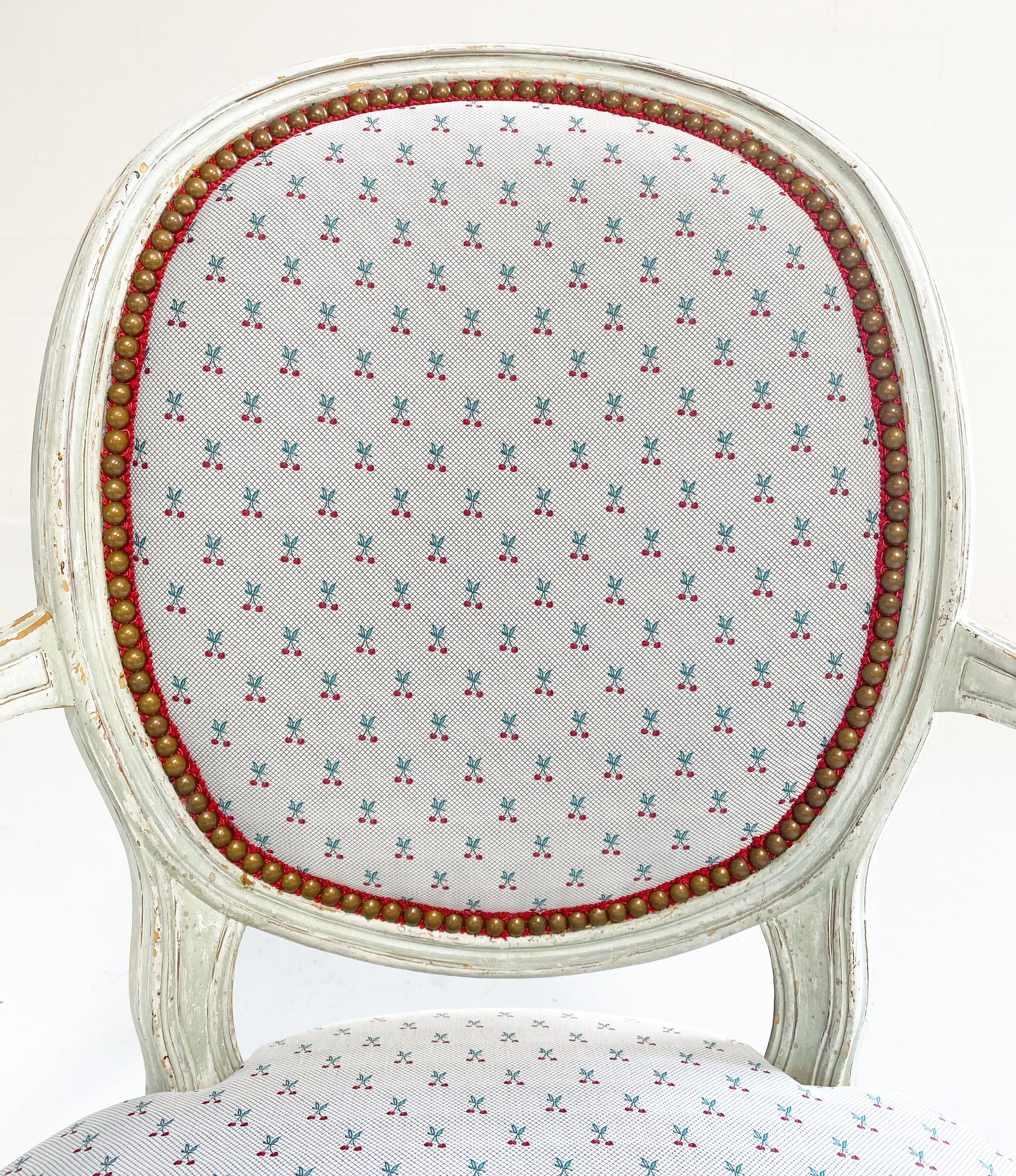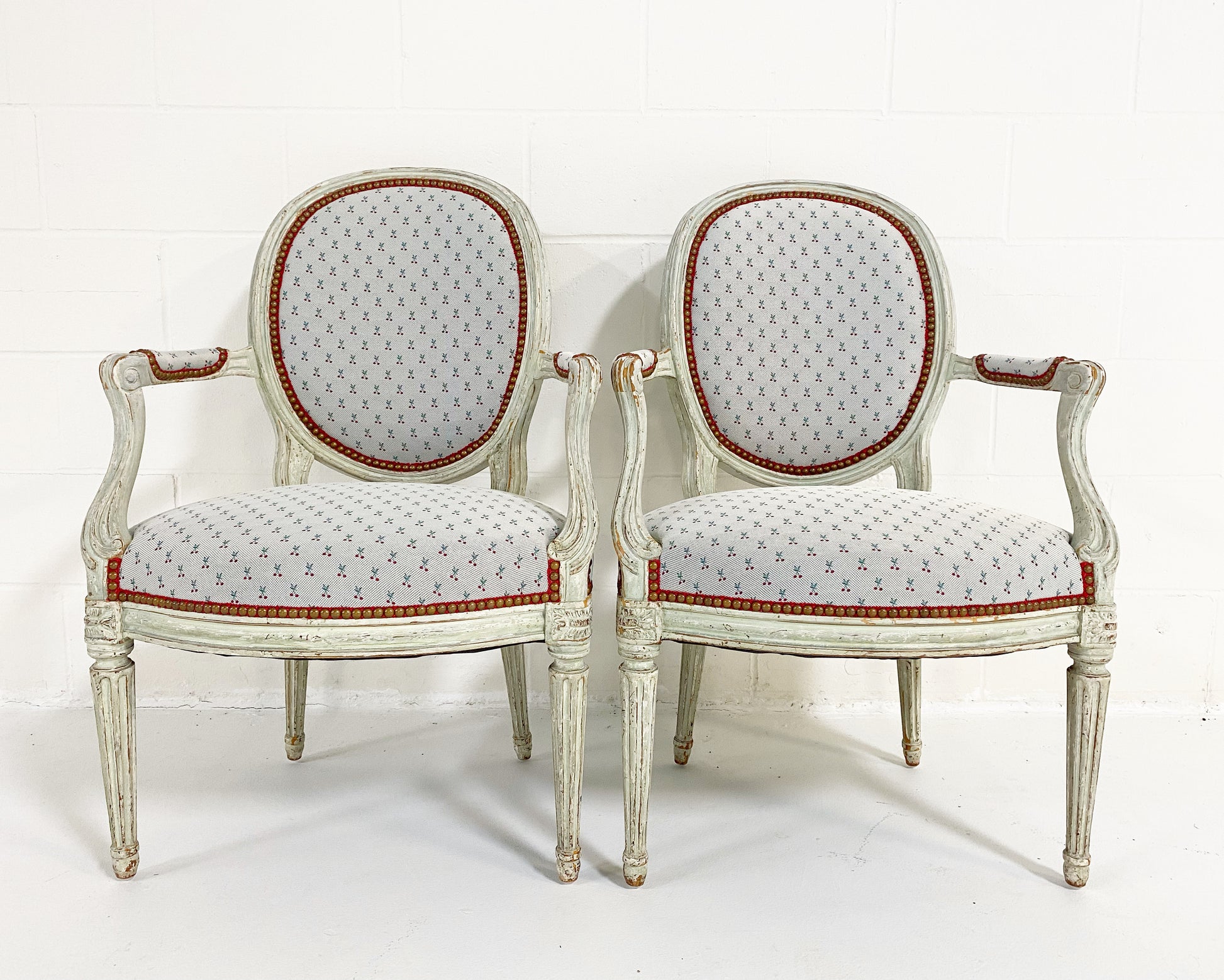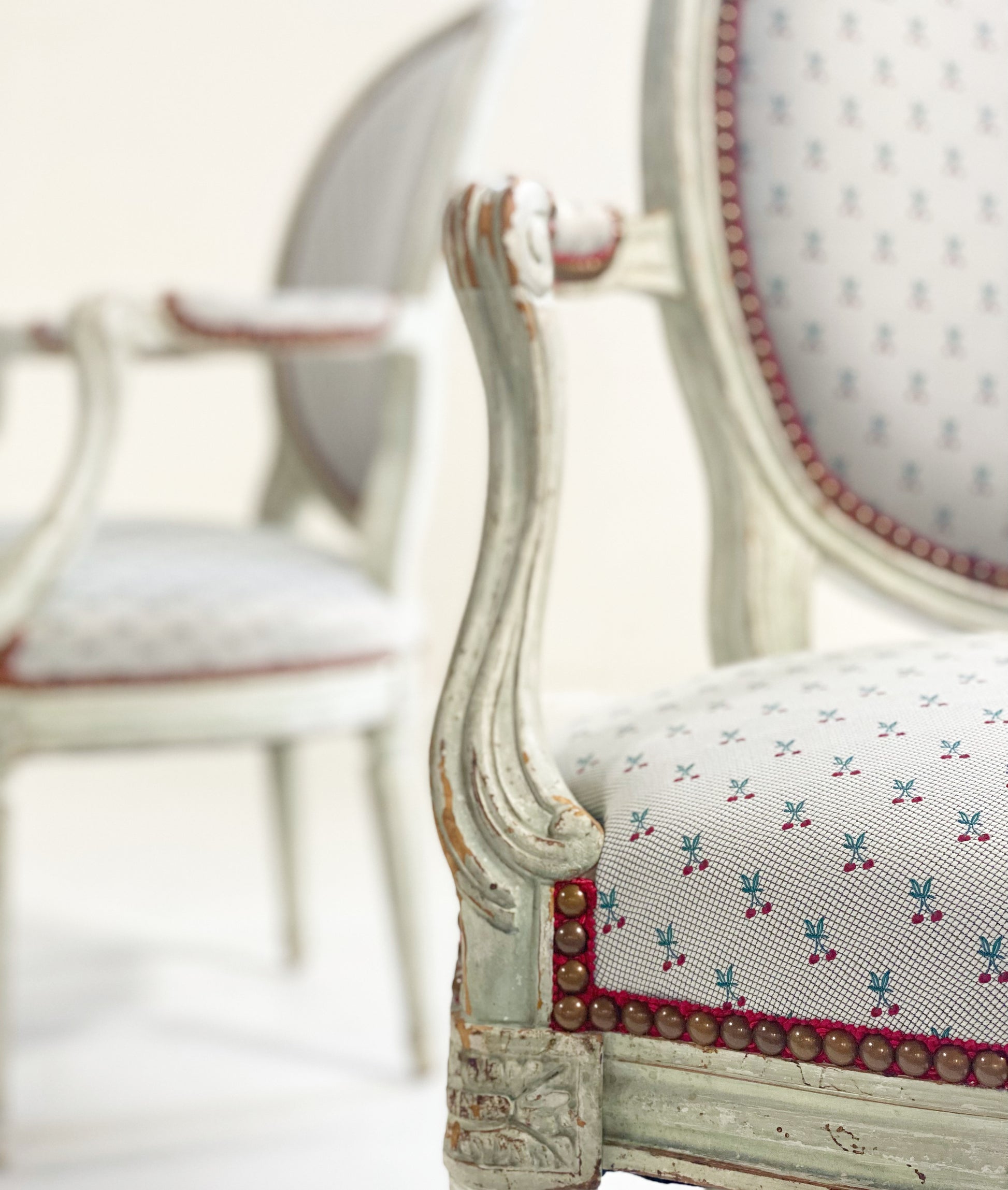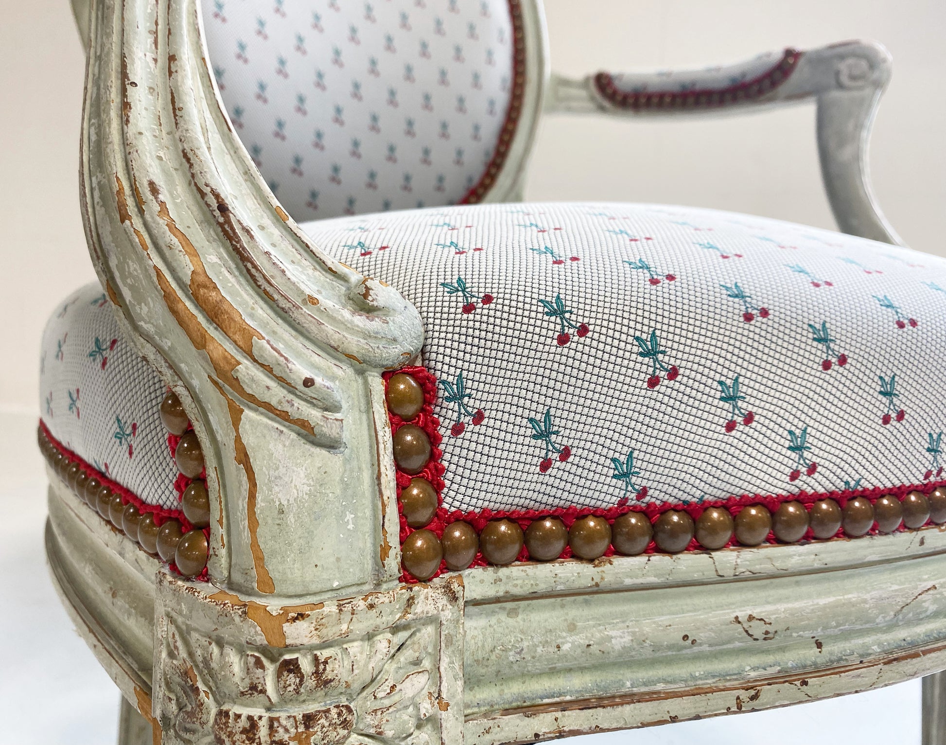 We love the frame of a Louis chair. It's perfect for luxurious and fun fabrics like Dedar's Cherry Oh. The fabric looks especially nice with the frames of these chairs. They are a perfectly patinaed light light sagey green. The seats and back have been completely rebuilt. The pair of chairs can also be separated.