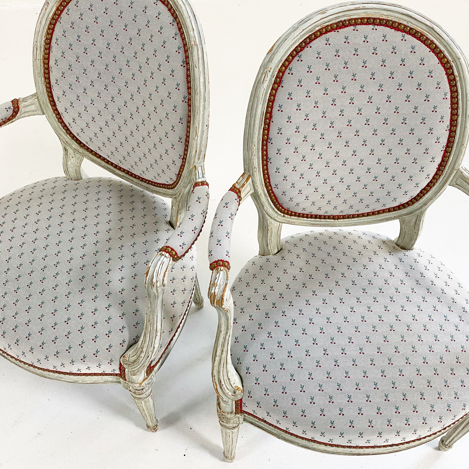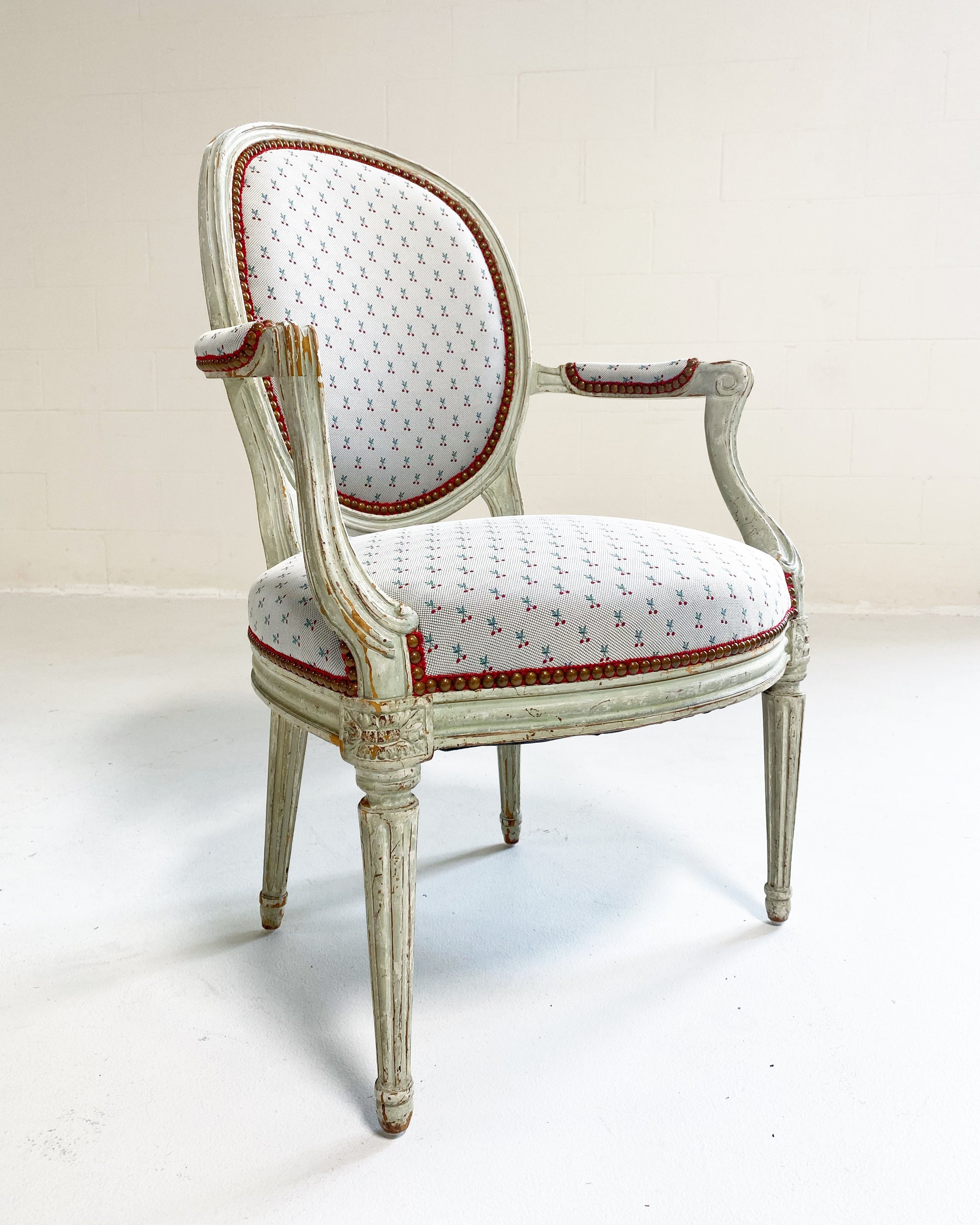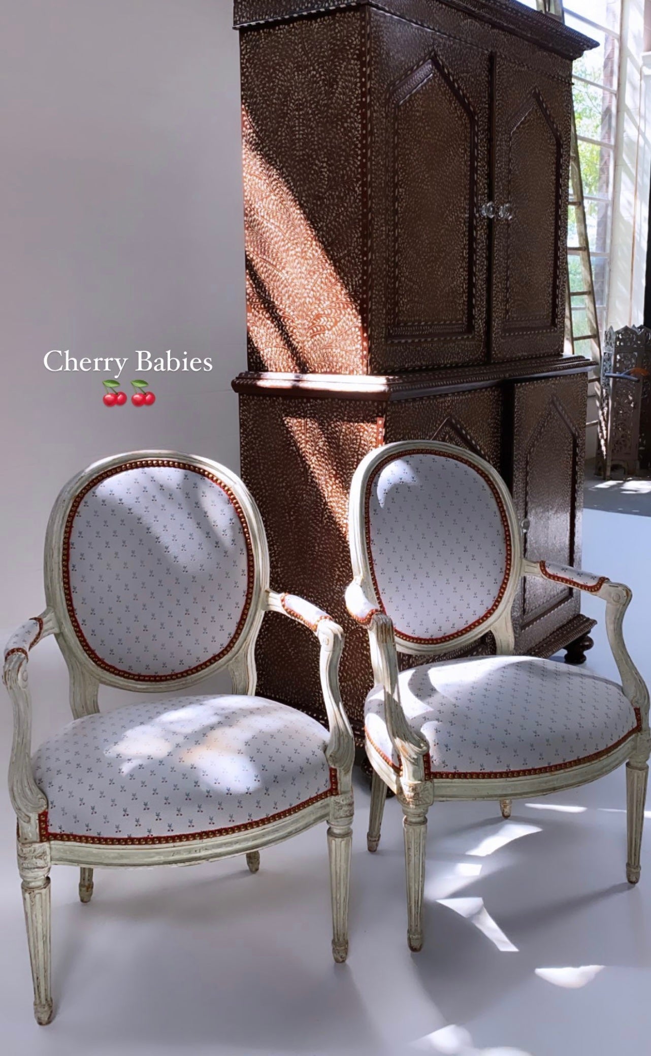 We love the frame of a Louis chair. It's perfect for luxurious and fun fabrics like Dedar's Cherry Oh. The fabric looks especially nice with the frames of these chairs. They are a perfectly patinaed light light sagey green. The seats and back have been completely rebuilt. The pair of chairs can also be separated.