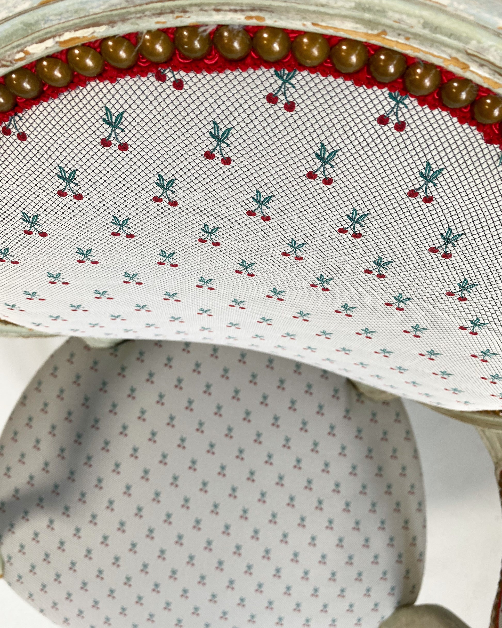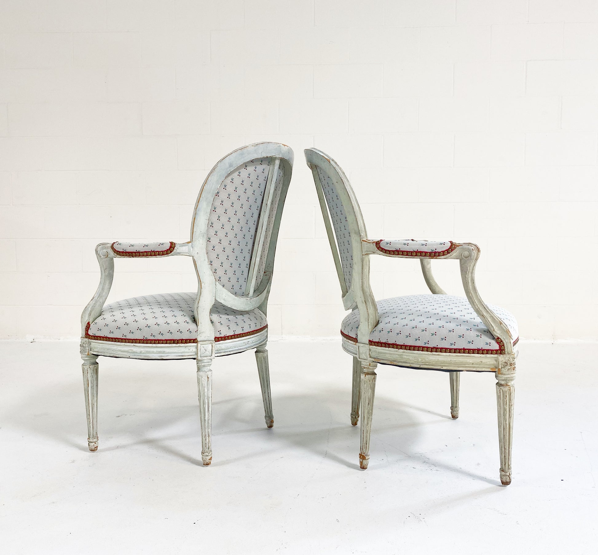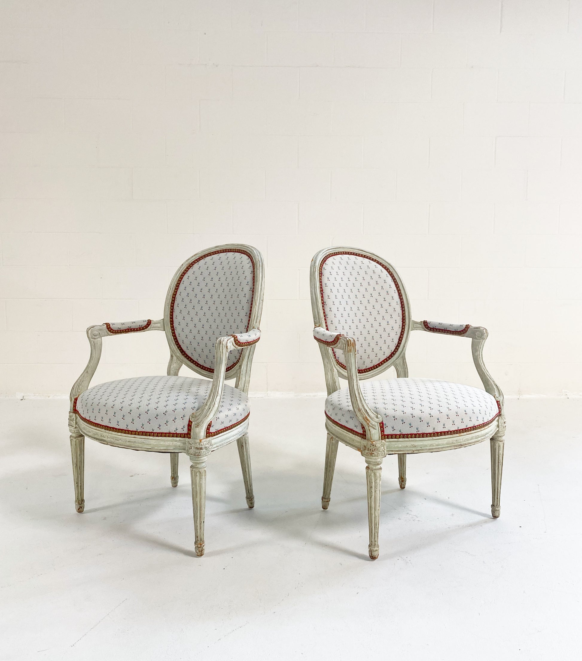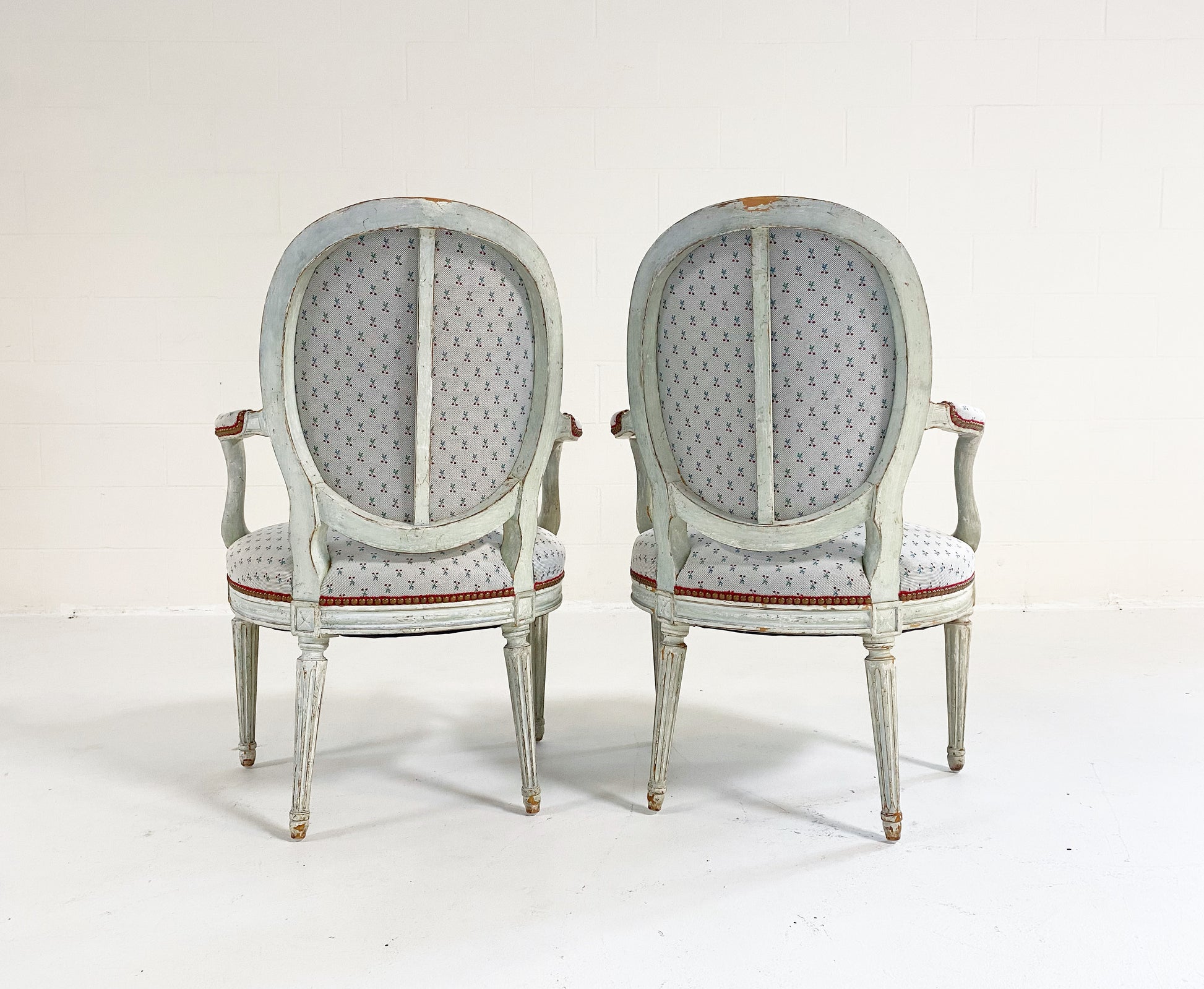 We love the frame of a Louis chair. It's perfect for luxurious and fun fabrics like Dedar's Cherry Oh. The fabric looks especially nice with the frames of these chairs. They are a perfectly patinaed light light sagey green. The seats and back have been completely rebuilt. The pair of chairs can also be separated.