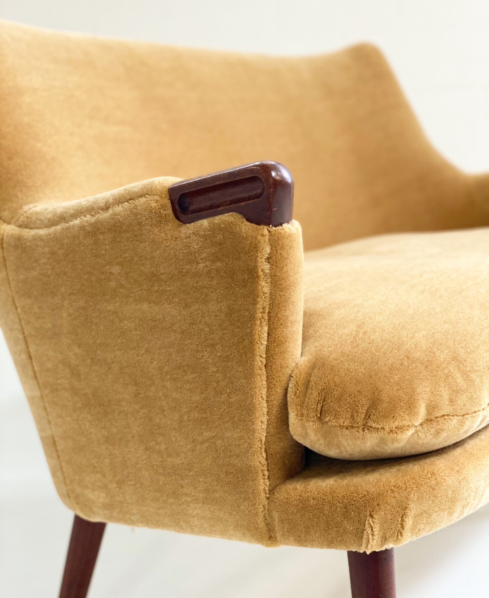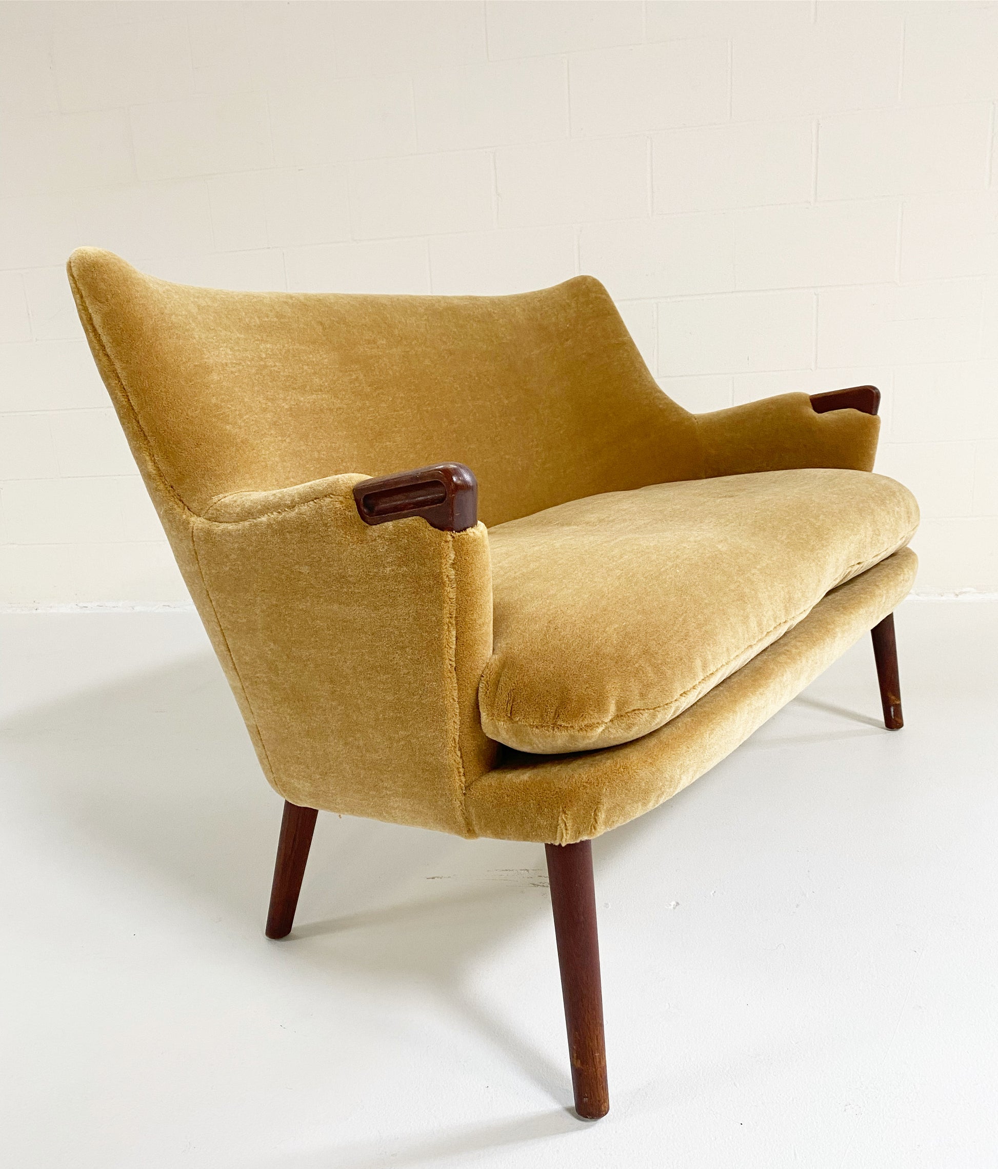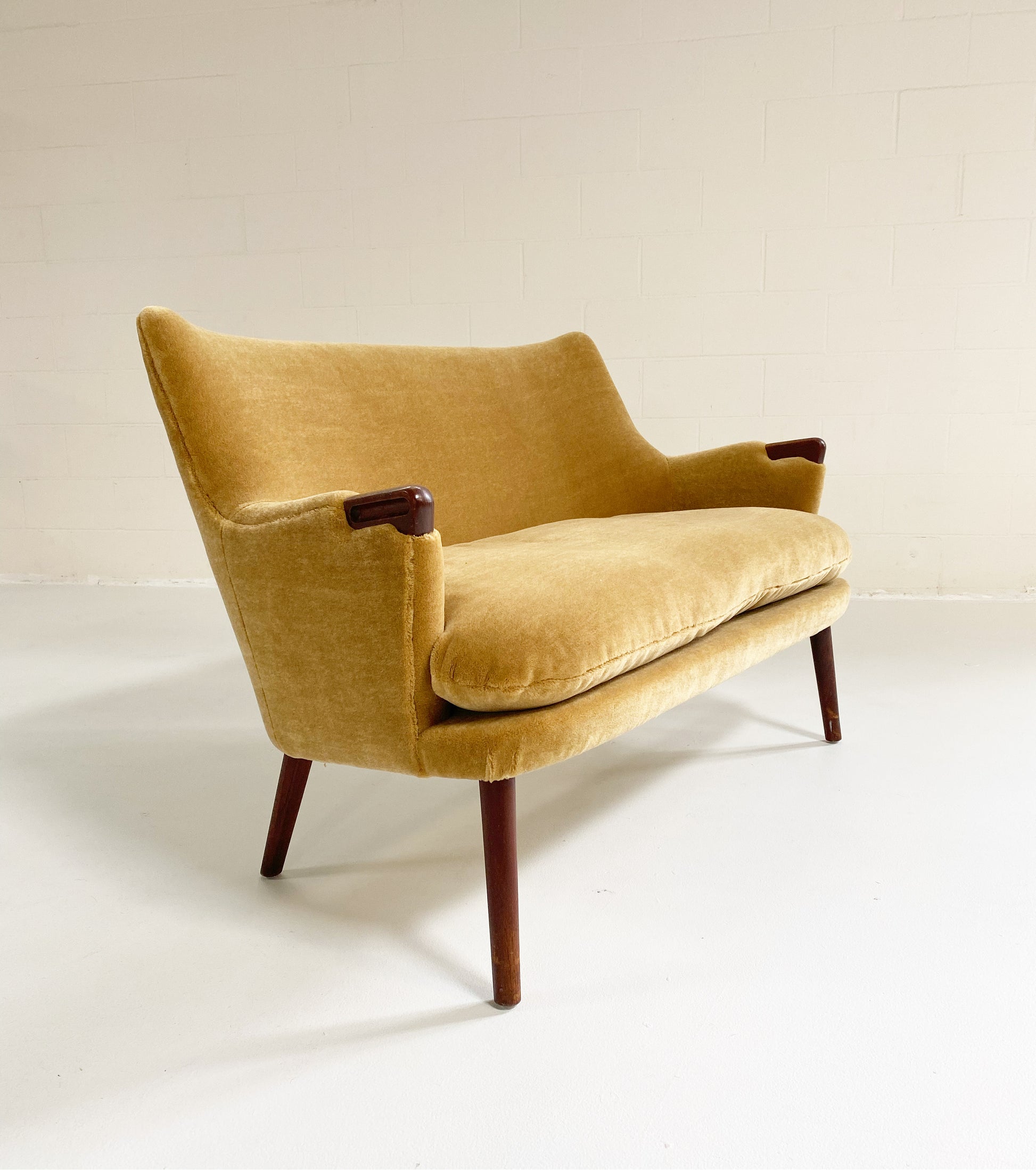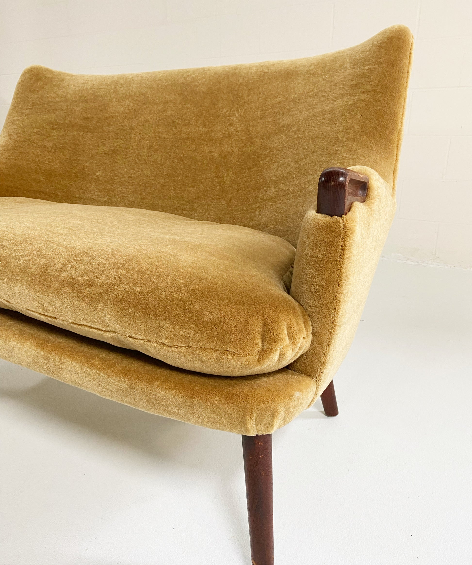 We love these pieces for their compact, yet refined aesthetic. The smooth finish, the tapered legs, the simple lines. We chose a luxurious Pierre Frey mohair in a deep honey color to complement the vintage patinaed wood. See our listing of the matching CH71 lounge chair and ottoman. Click Here. Together, it's a beautiful set.
