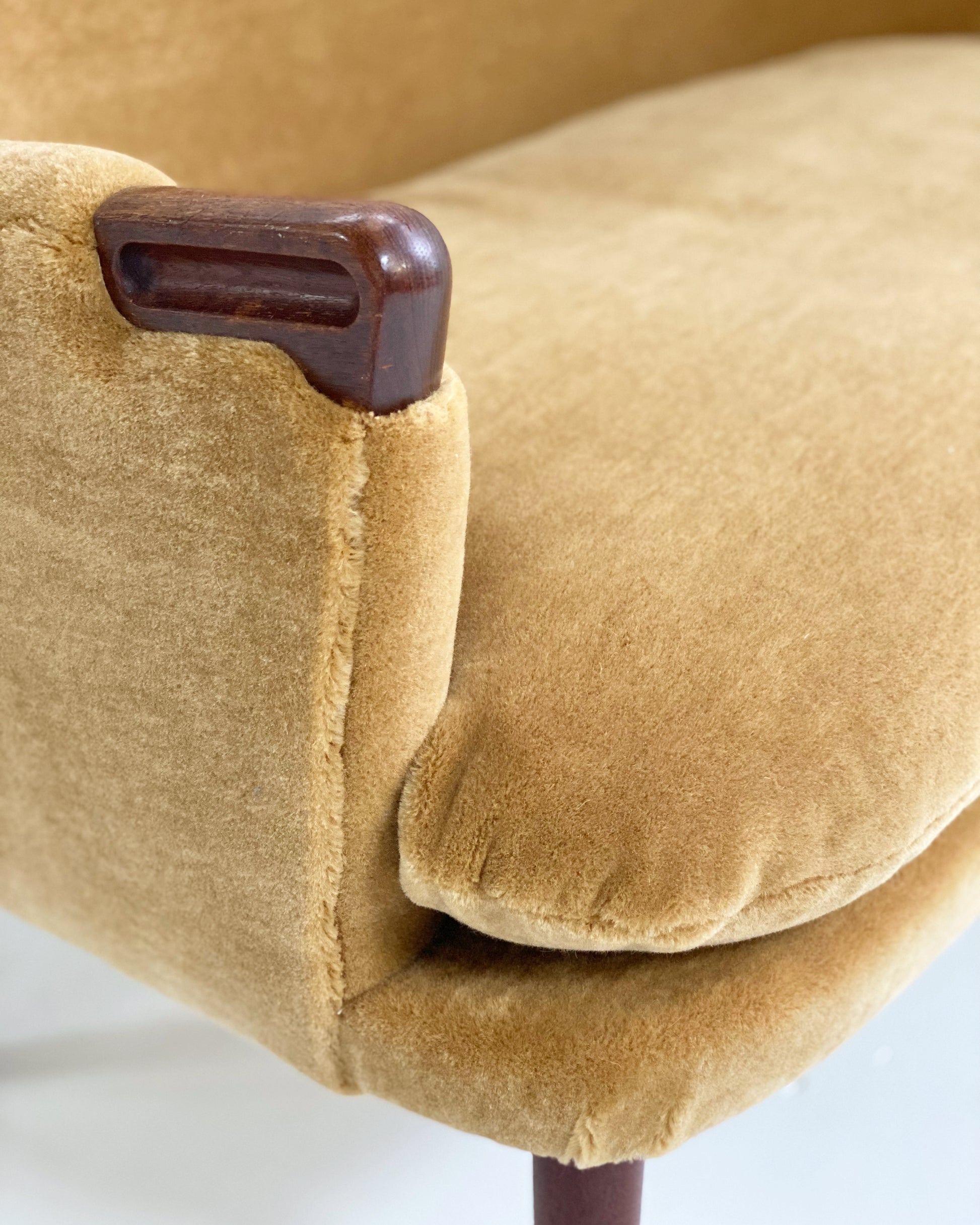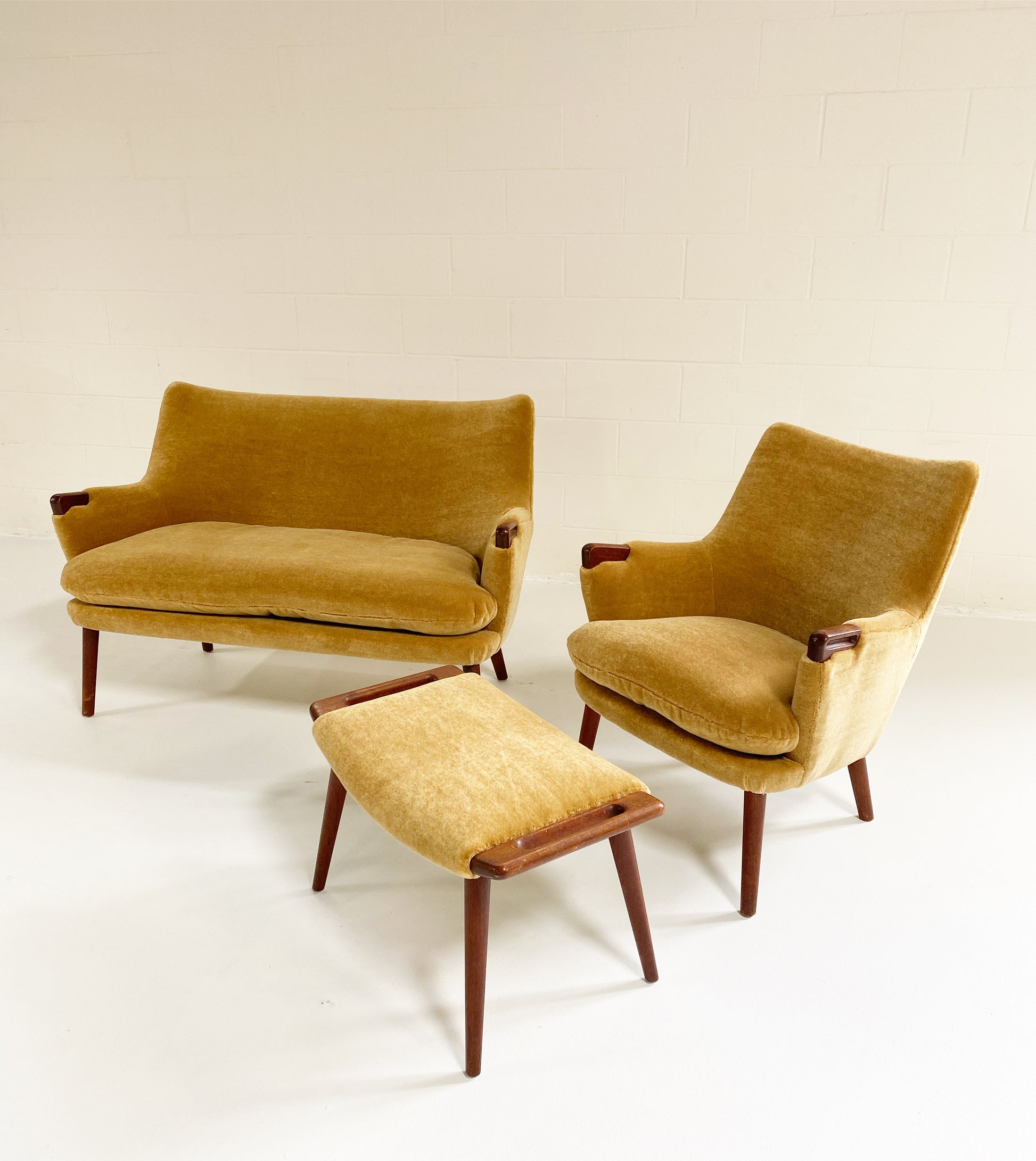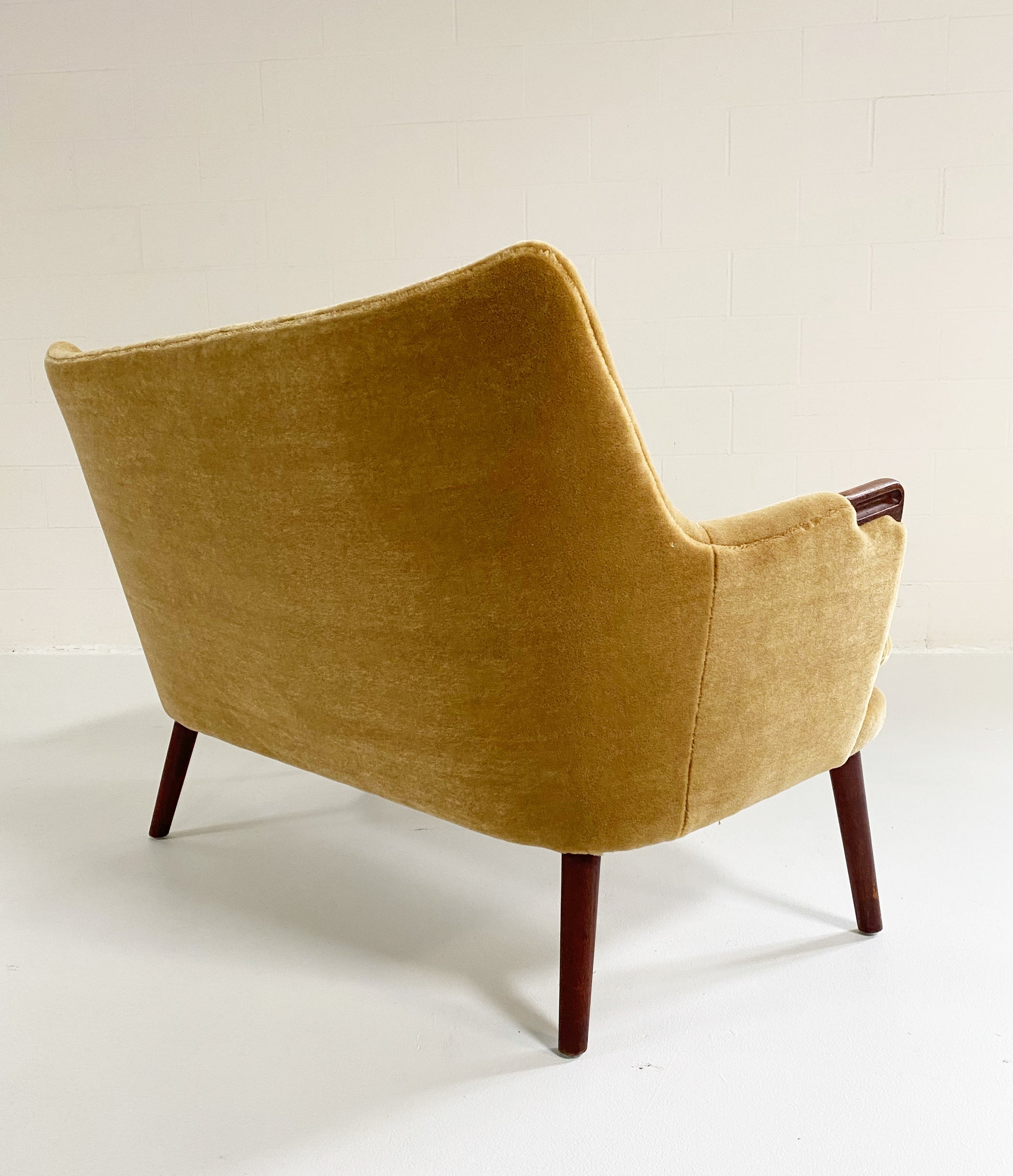 We love these pieces for their compact, yet refined aesthetic. The smooth finish, the tapered legs, the simple lines. We chose a luxurious Pierre Frey mohair in a deep honey color to complement the vintage patinaed wood. See our listing of the matching CH71 lounge chair and ottoman. Click Here. Together, it's a beautiful set.
