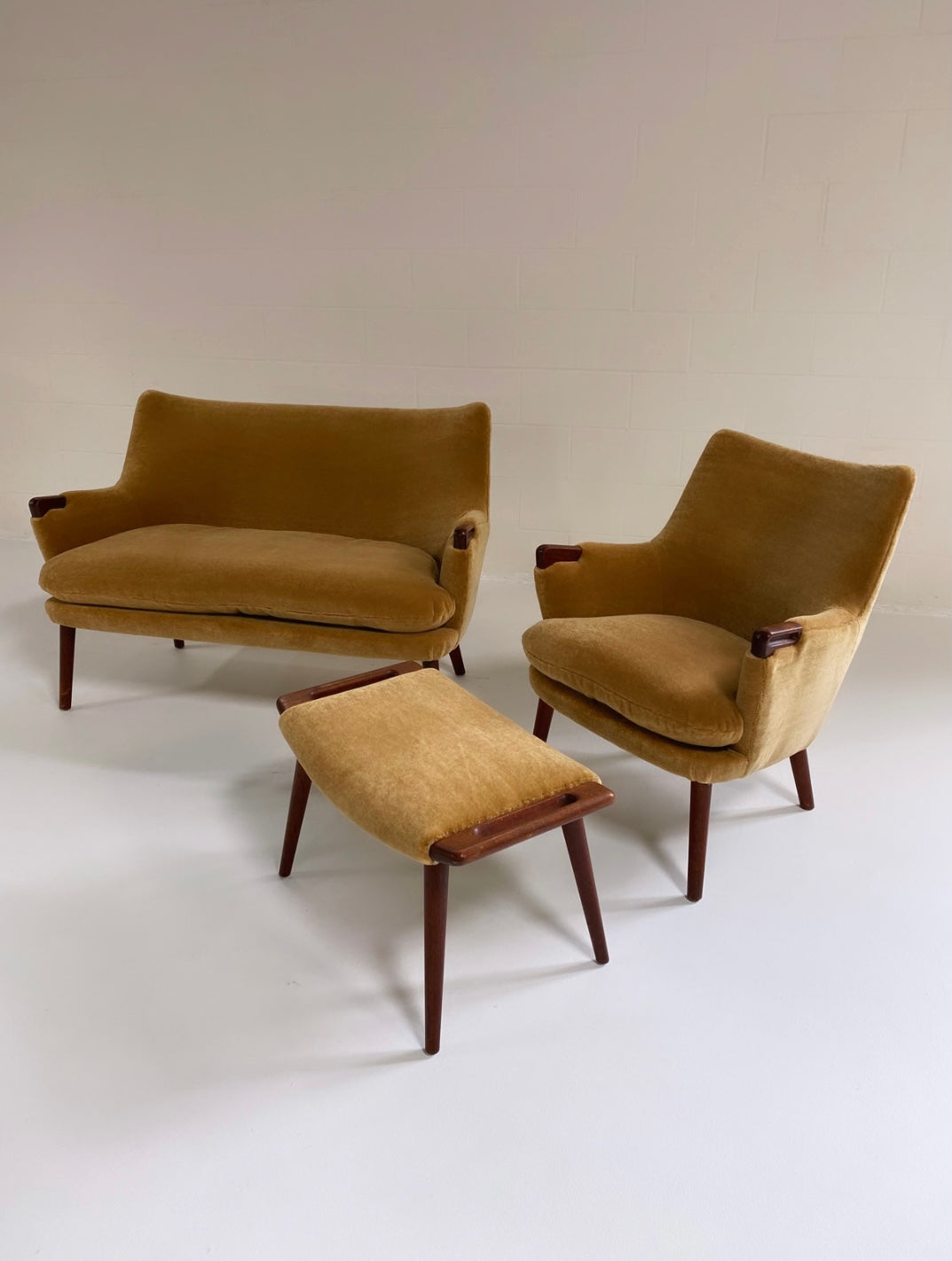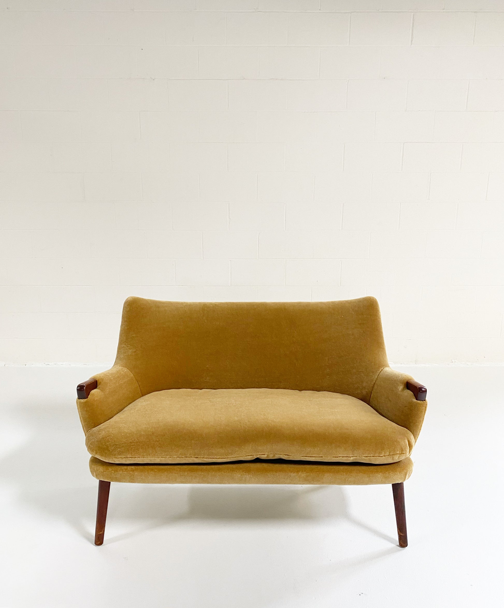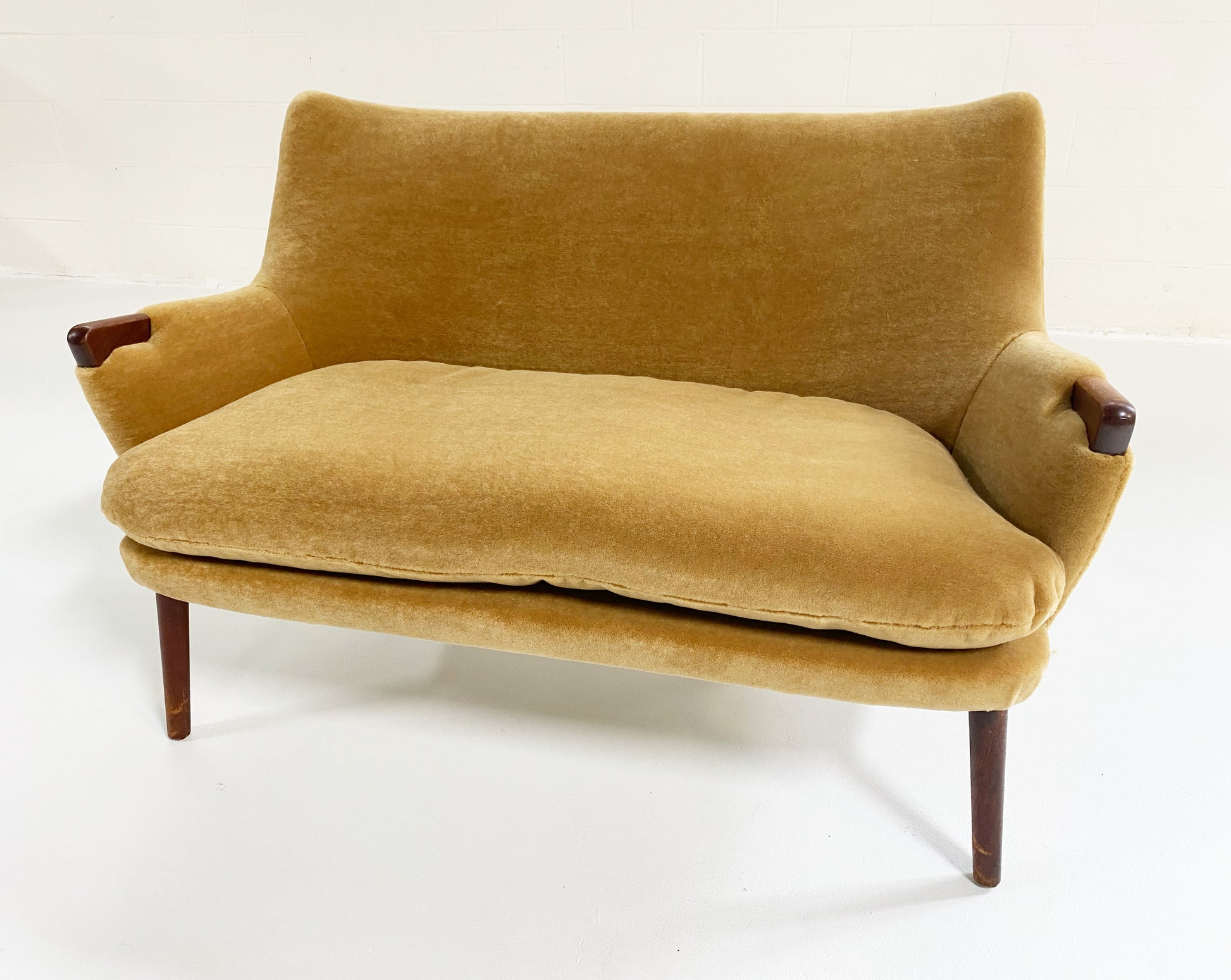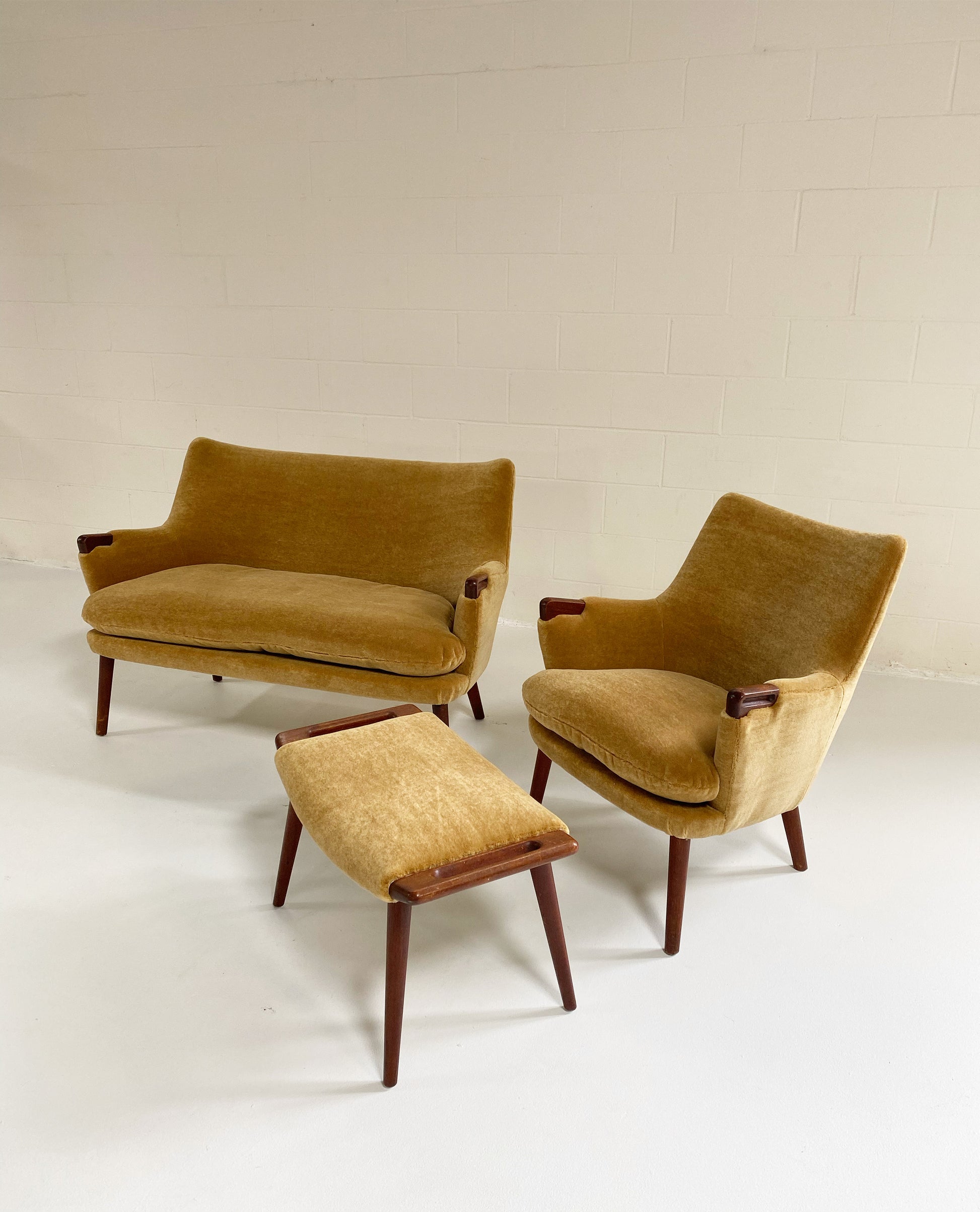 We love these pieces for their compact, yet refined aesthetic. The smooth finish, the tapered legs, the simple lines. We chose a luxurious Pierre Frey mohair in a deep honey color to complement the vintage patinaed wood. See our listing of the matching CH71 lounge chair and ottoman. Click Here. Together, it's a beautiful set.