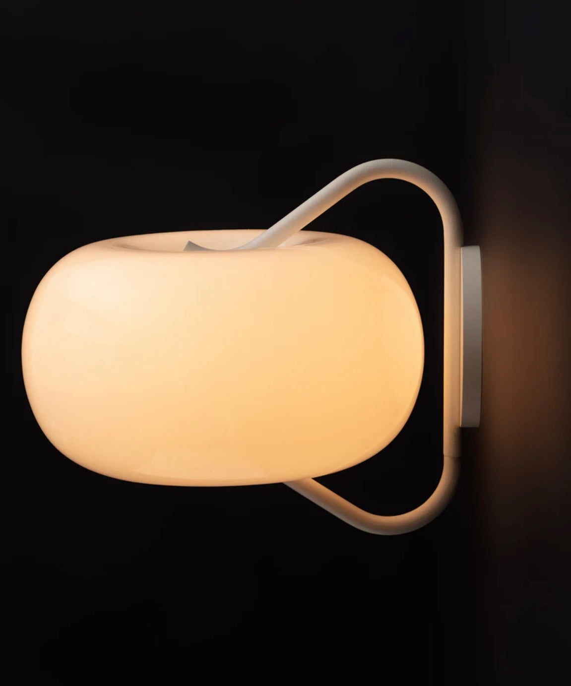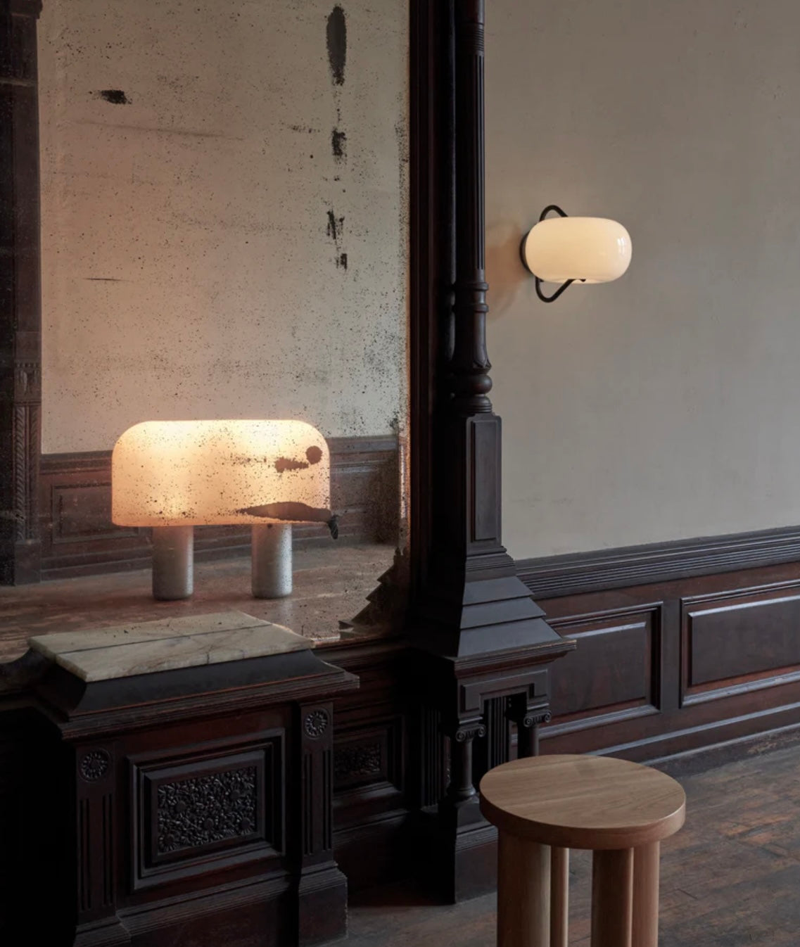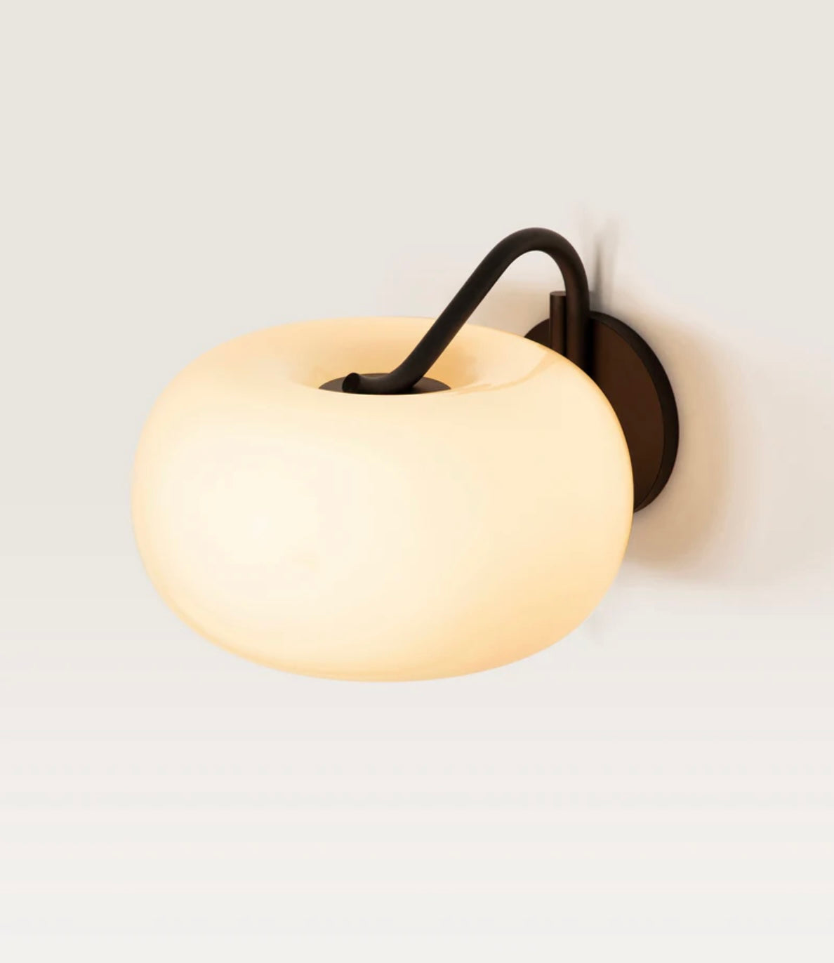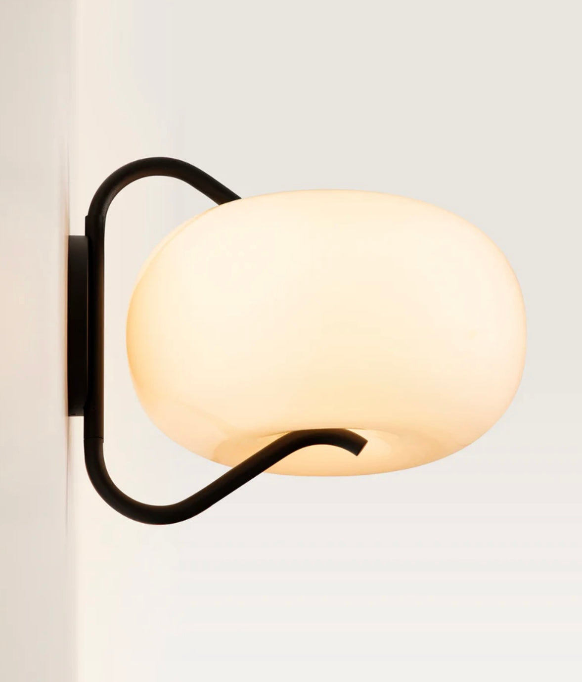 A sculptural grouping of lights, born from a series of experiments with balloons and wire, featuring a table lamp, floor lamp, and sconce made from blown glass pinched between a tubular steel frame.