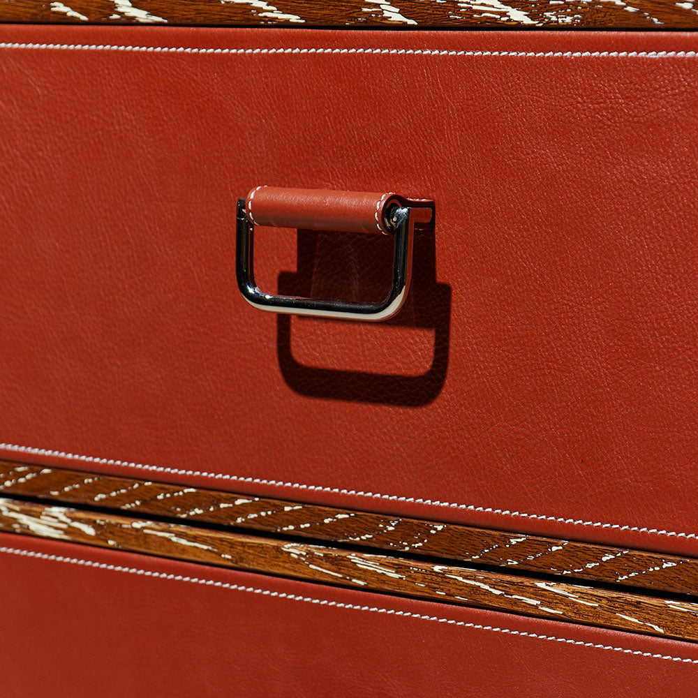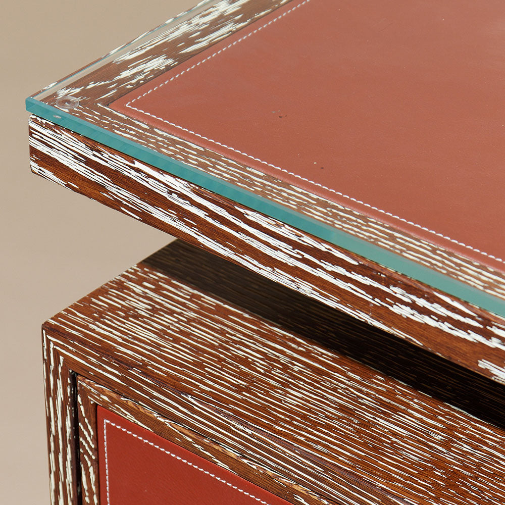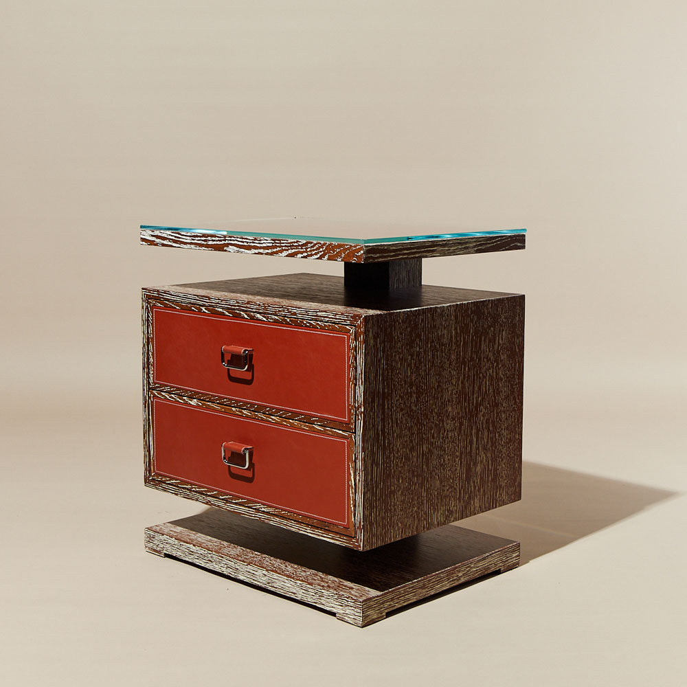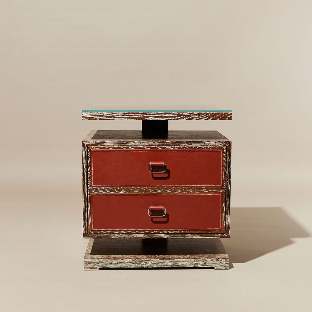 Emile is a side table in walnut structure, characterized by the use of leather both on the drawers and on the top. The distance between the top and the base from the main body interrupts its firmness and creates an alternation of solids and voids, that give the whole a sinuous shape.