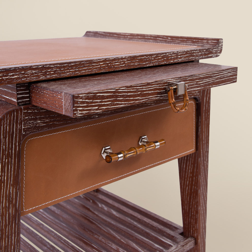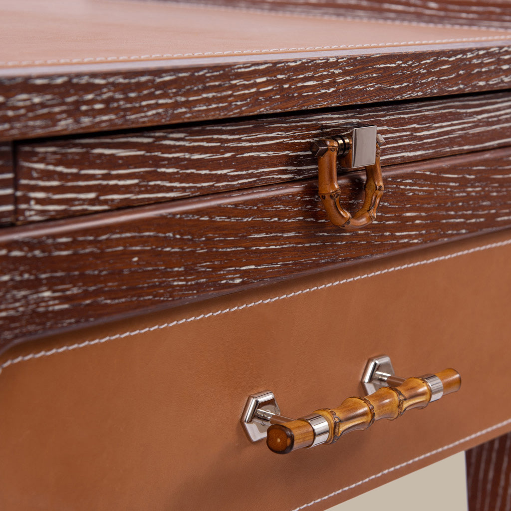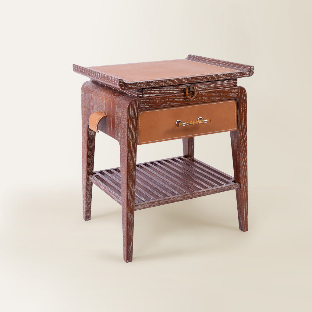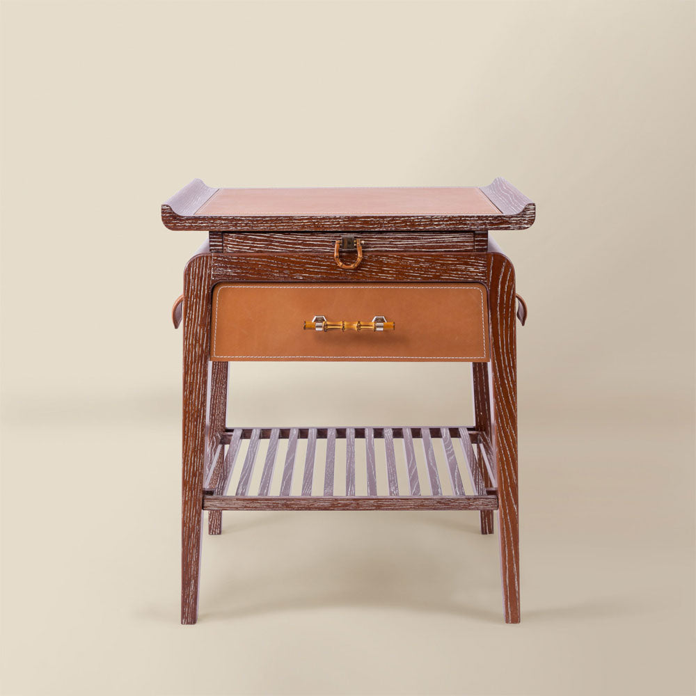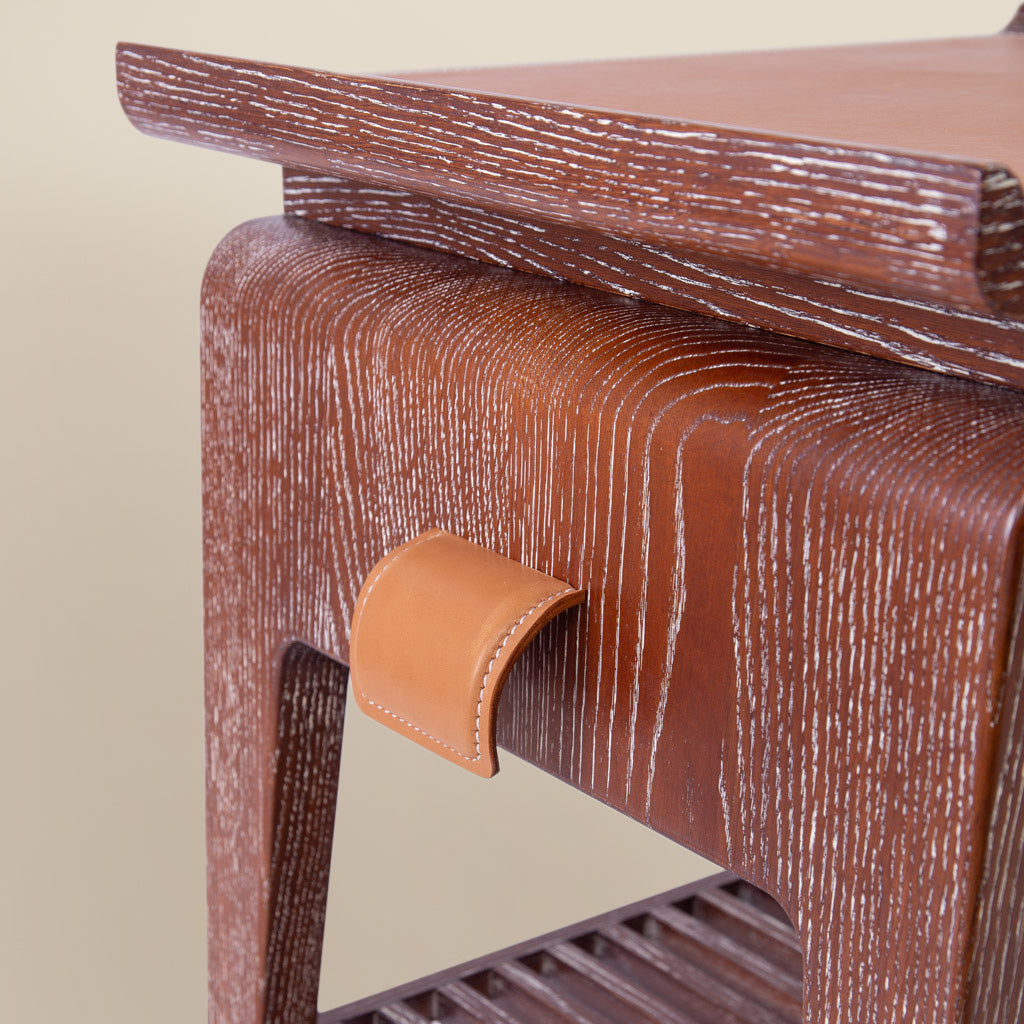 Side table in light padouk. The texture of the wood creates contrast in its dialogue with the softness of the leather upholstery.