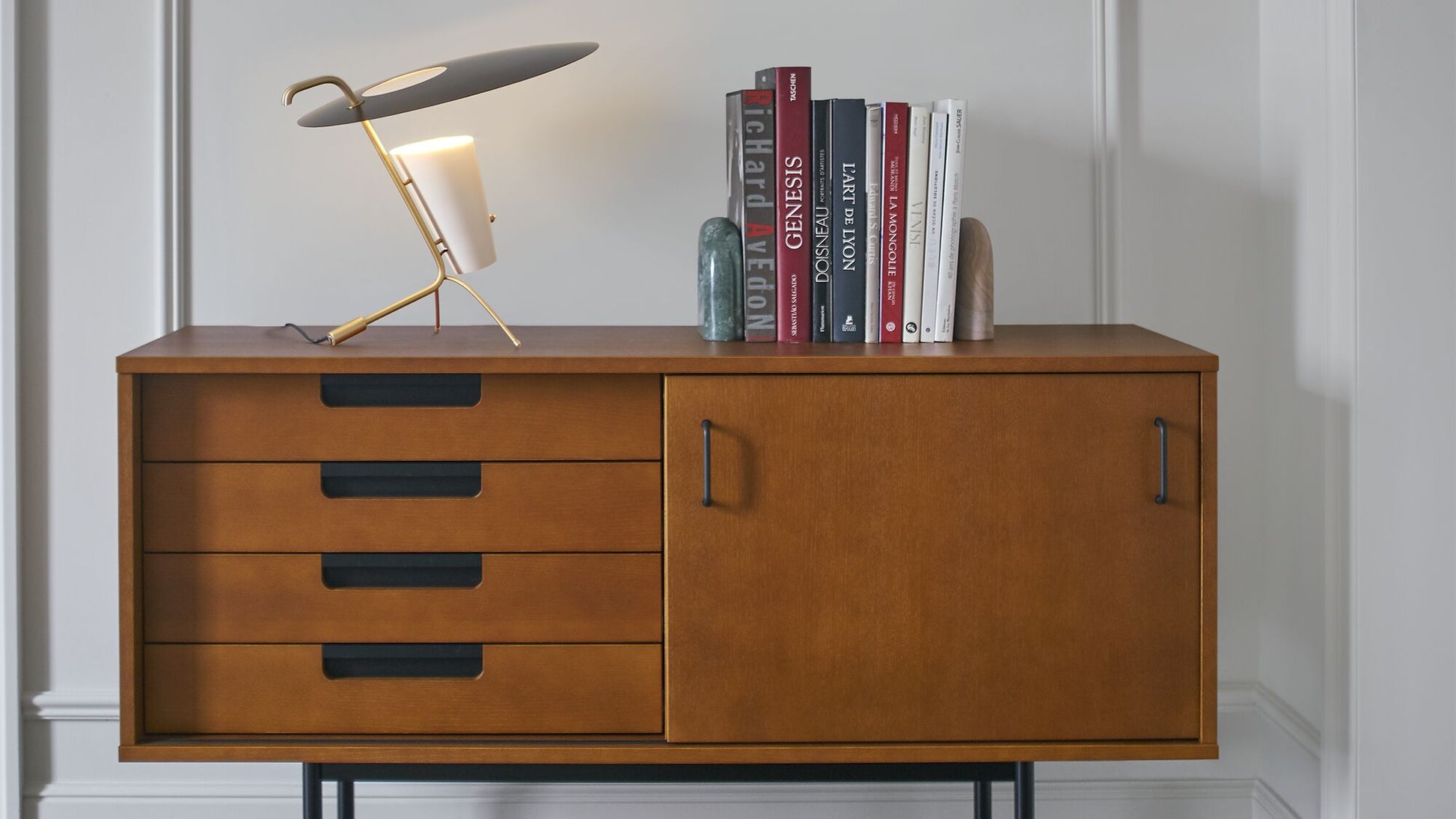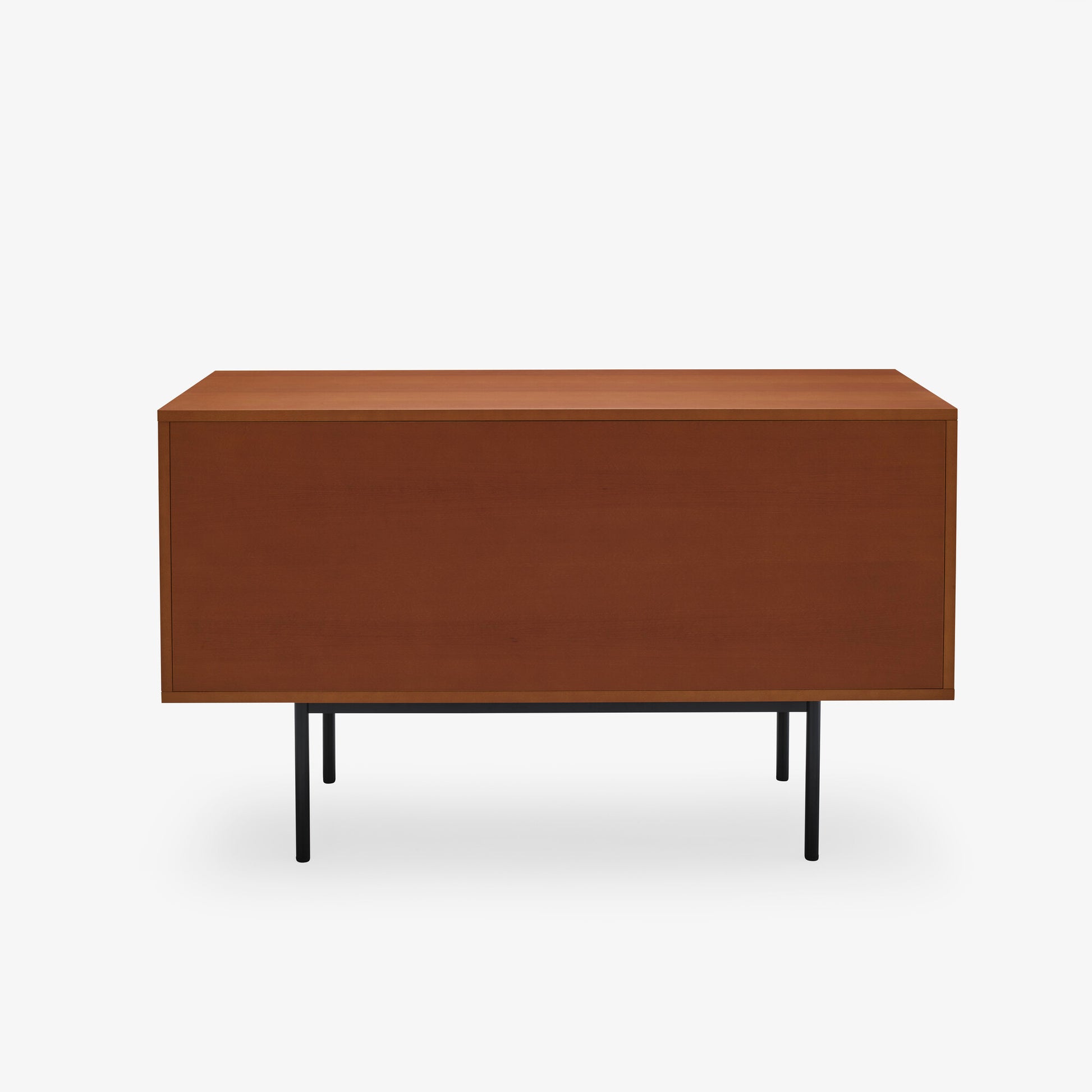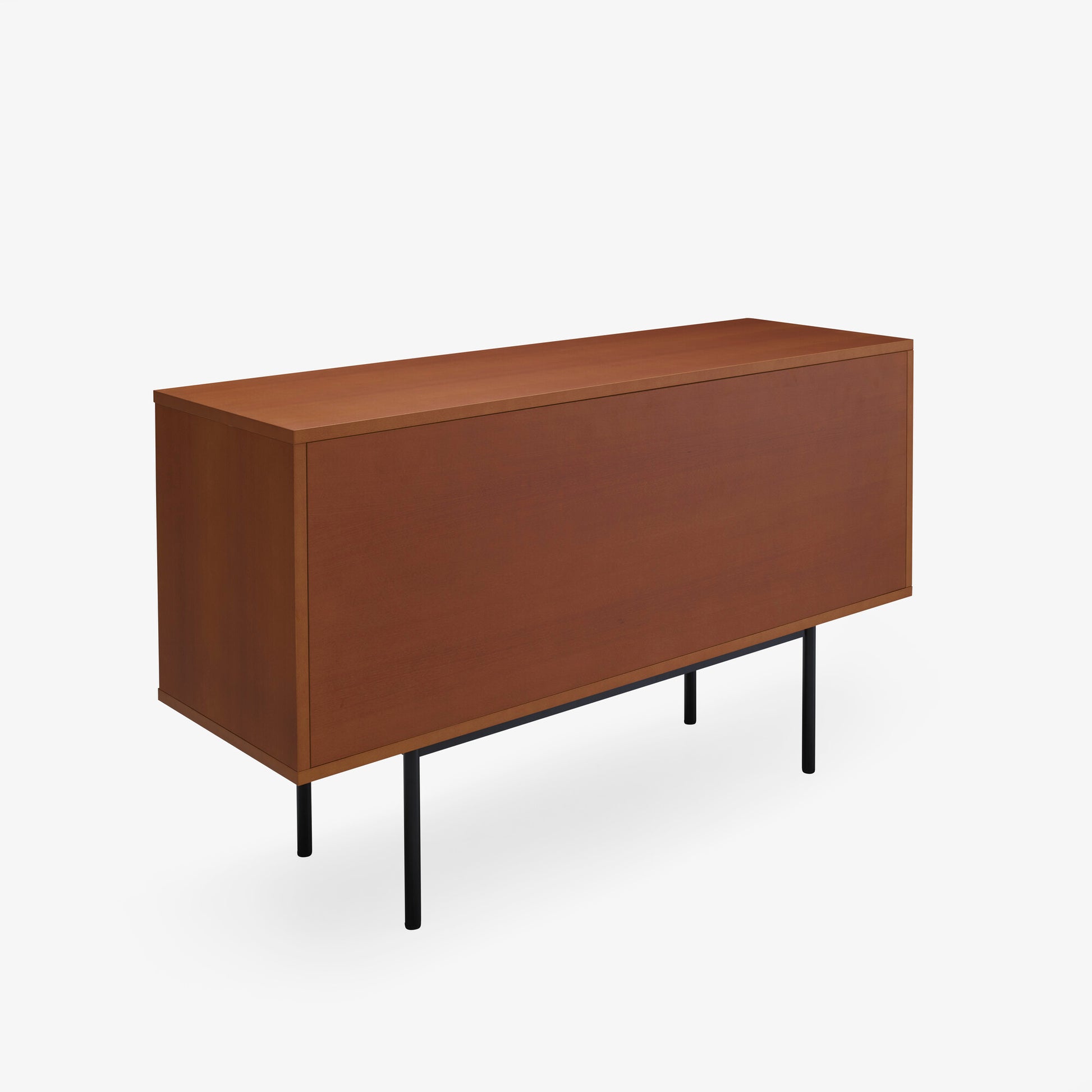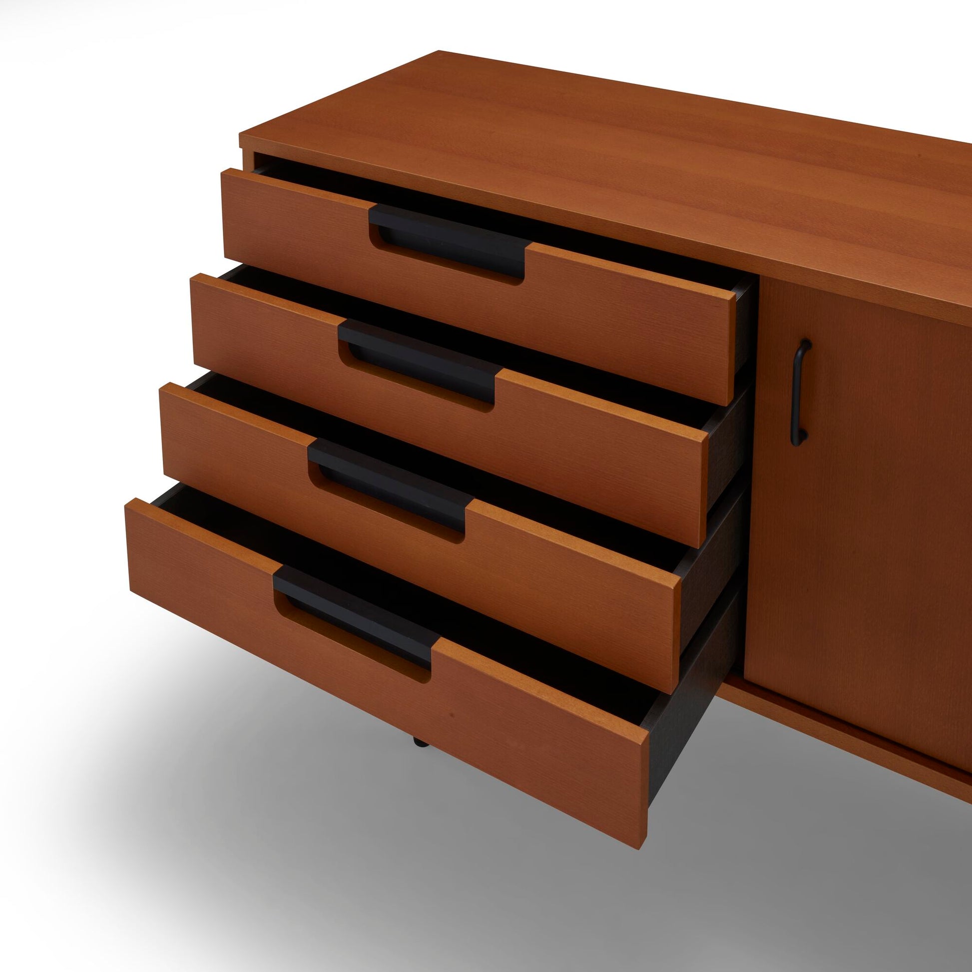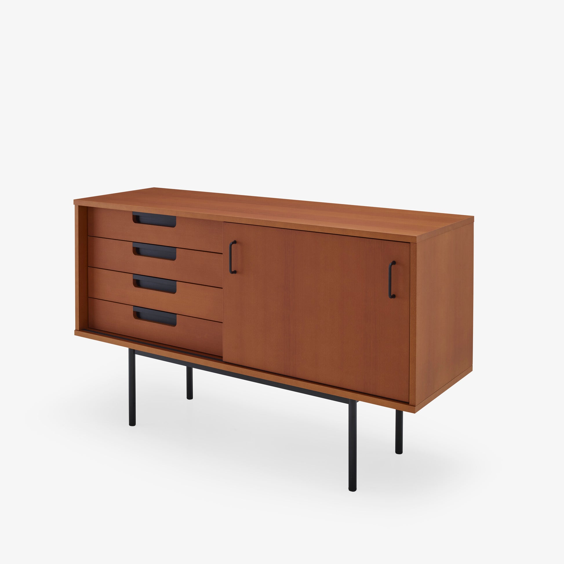 Made of a stained ash veneered wooden crate and a black lacquered metal base, this small sideboard is equipped with a row of 4 drawers on its left and a single sliding door on its right. The sideboard comprises four drawers and a sliding door. The 148 sideboard is made of stained ash veneered MDF, the drawer front is in stained solid ash. The handles and the base are in black lacquered metal.