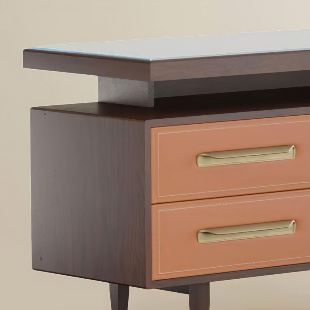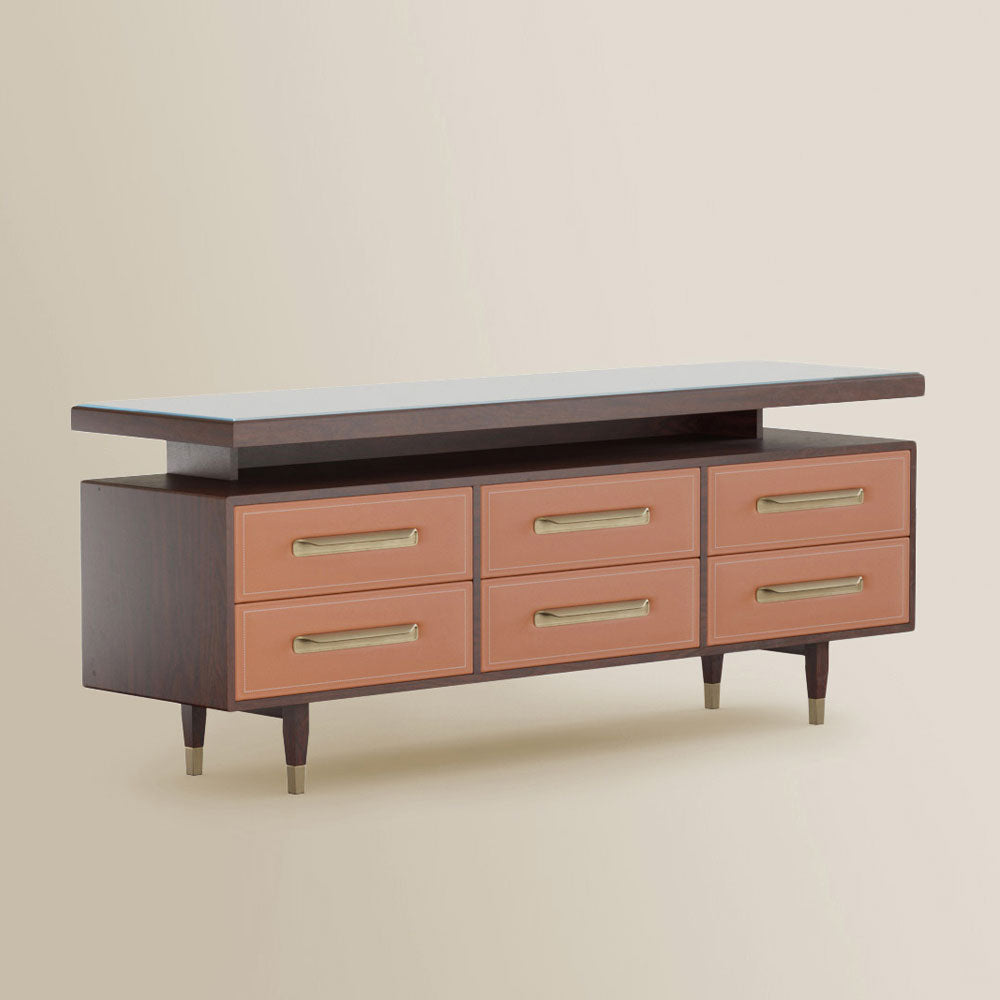 A sophisticated sideboard in which the proportions make the difference. The structure is made by finely worked walnut, that is well combined with the smoothest leather, in a graceful balance. The whole is supported by slim and elegant legs, and enriched by golden details.