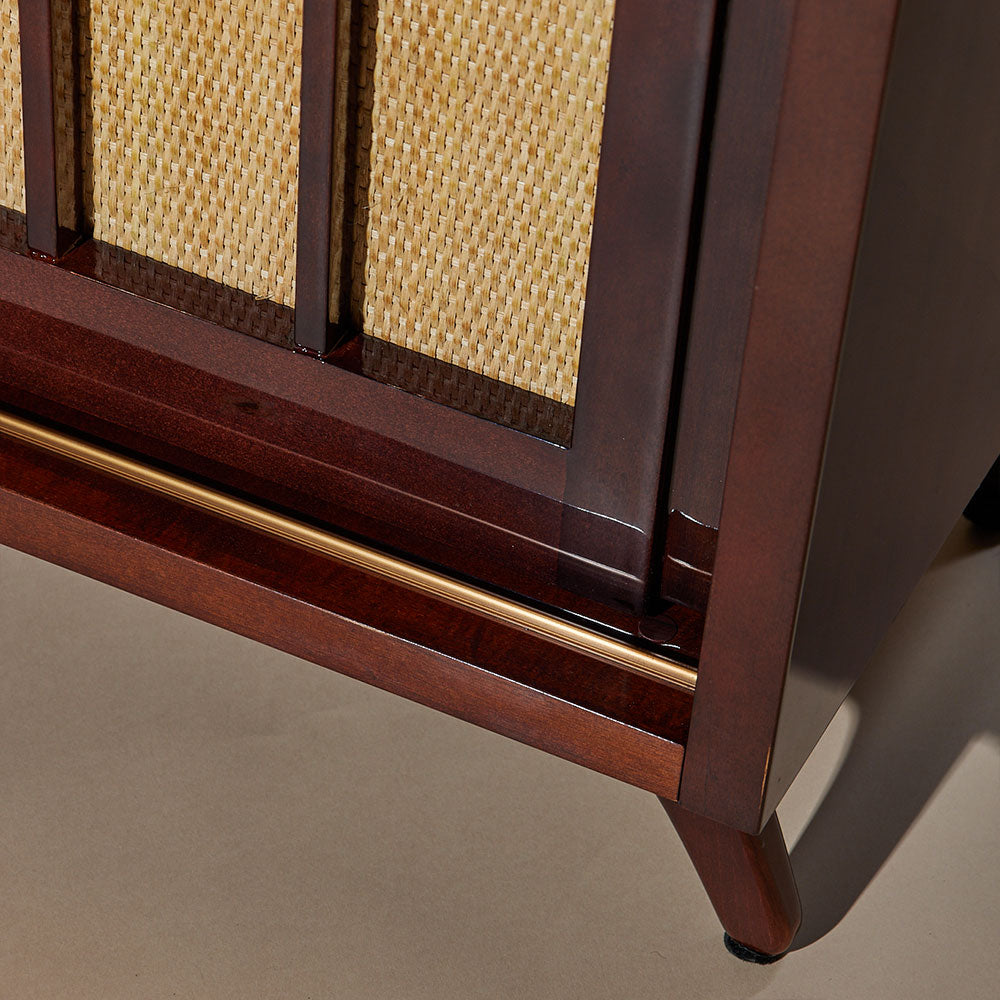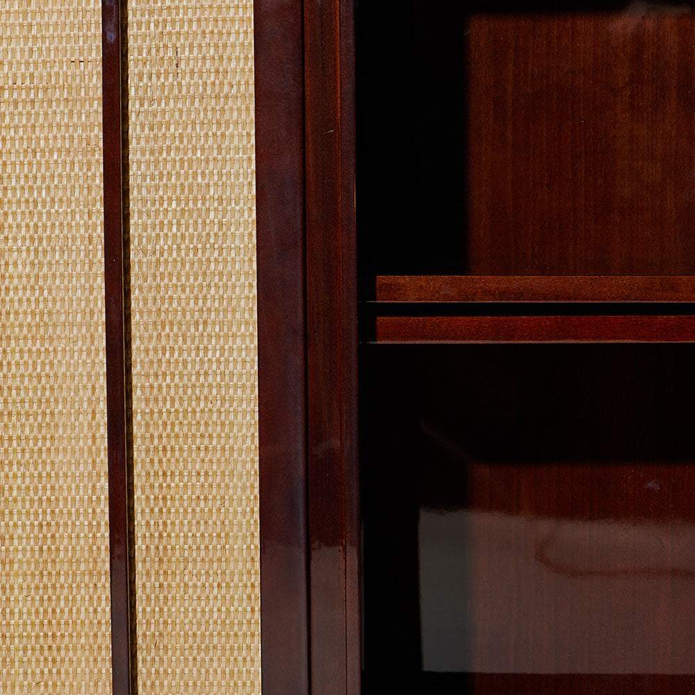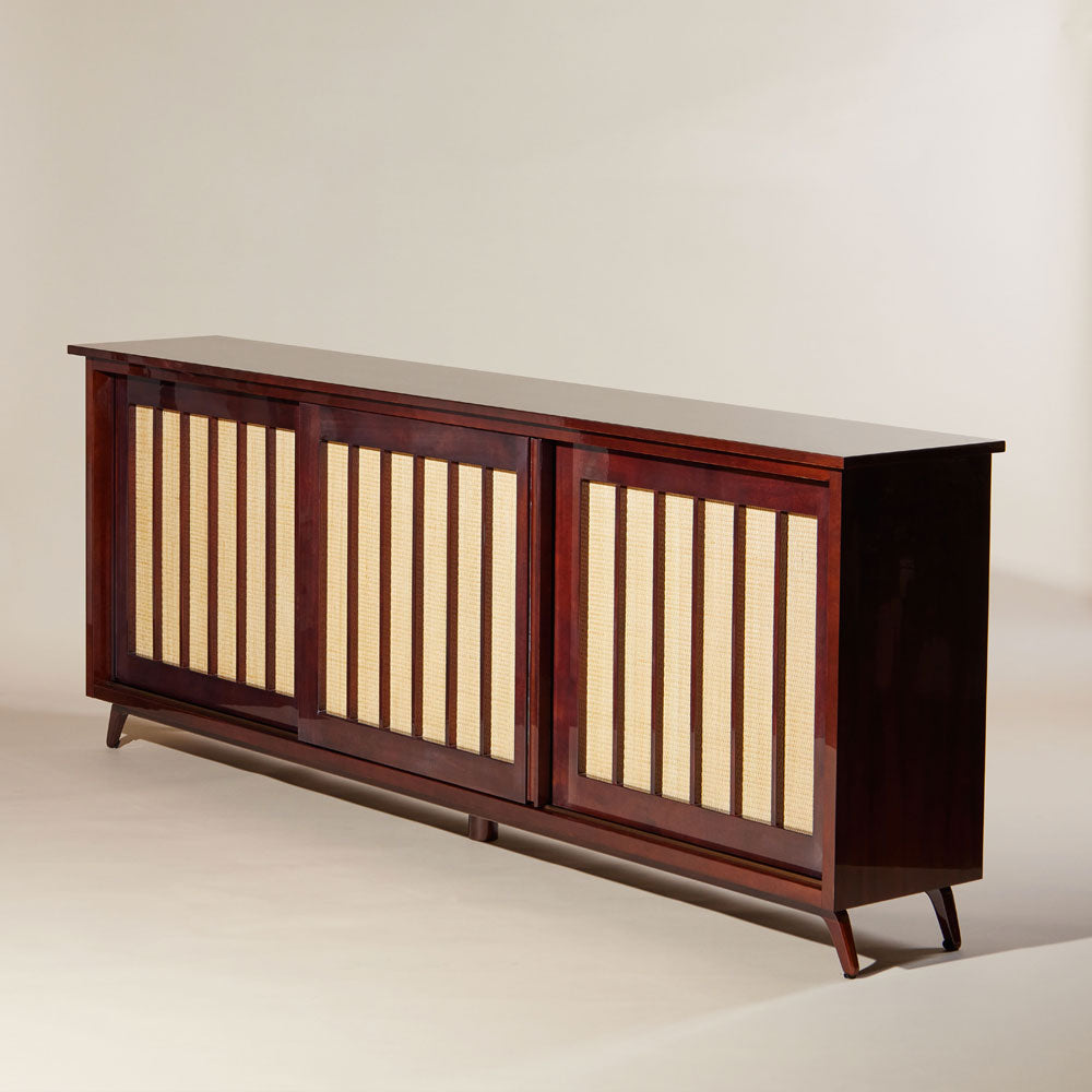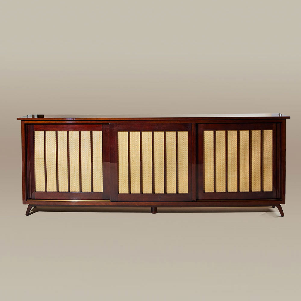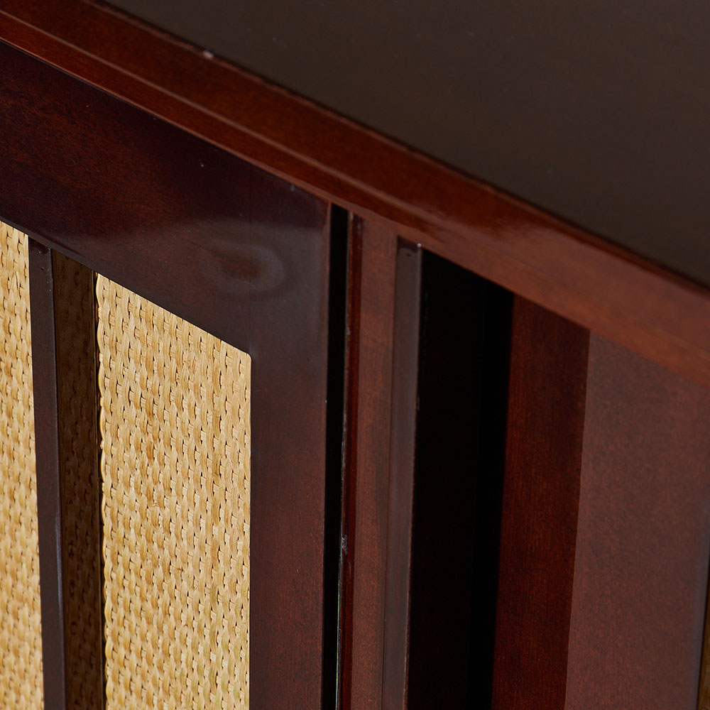 Elegant, Thai stands on small oblique feet. The sideboard has a walnut structure and sliding doors with raffia upholstery. The alternation between these two materials creates a play of contrasts and give an oriental look to the whole.