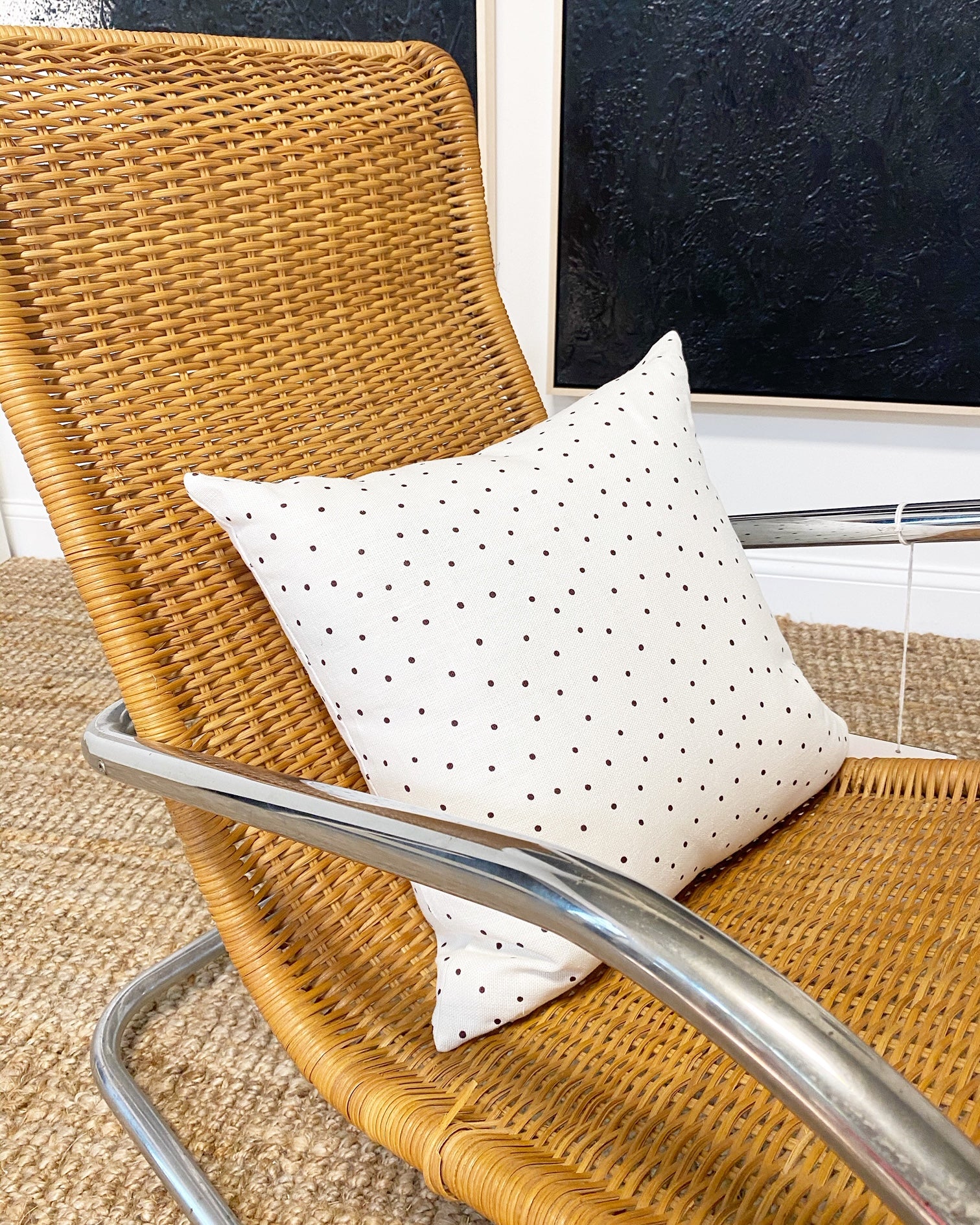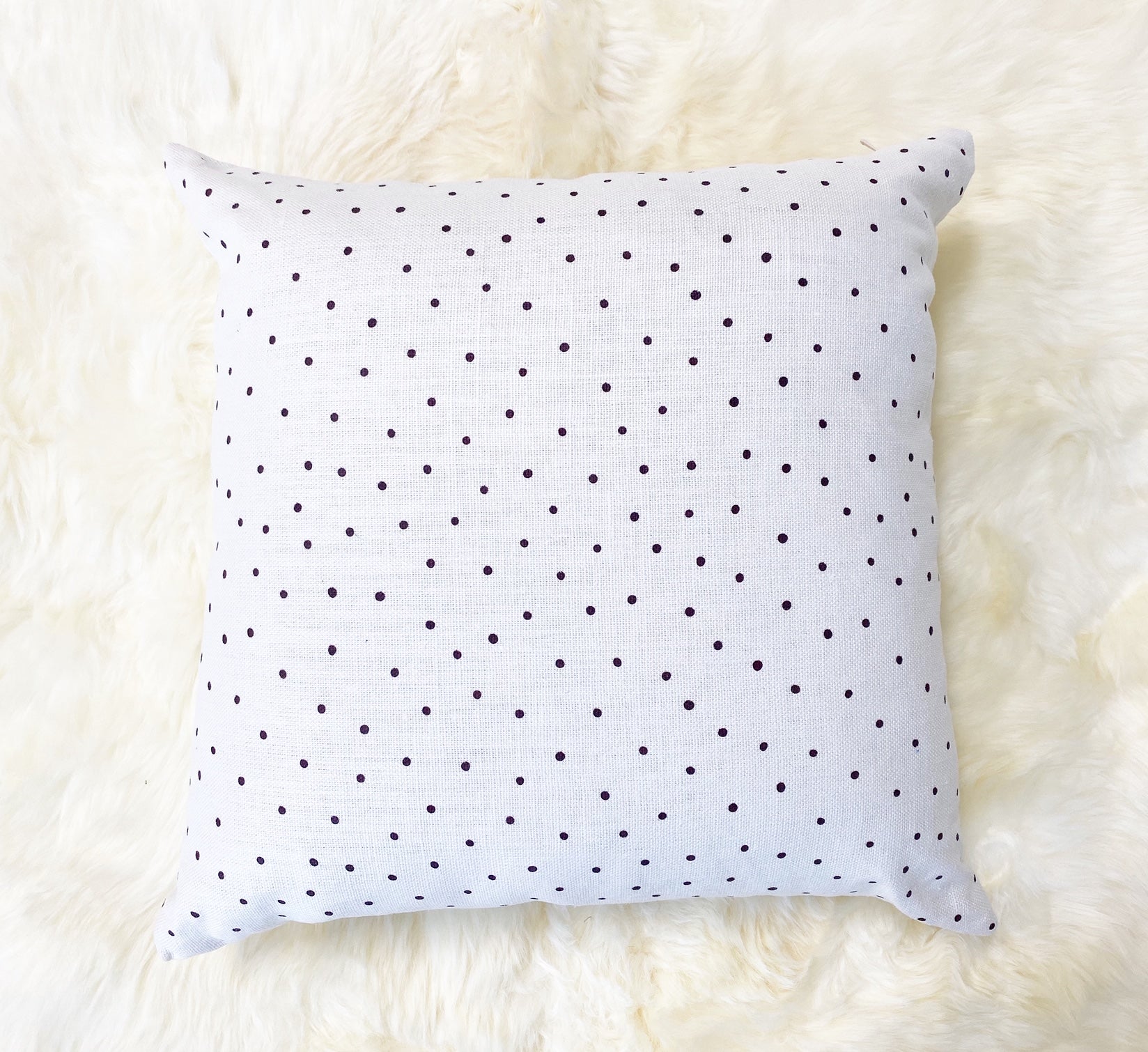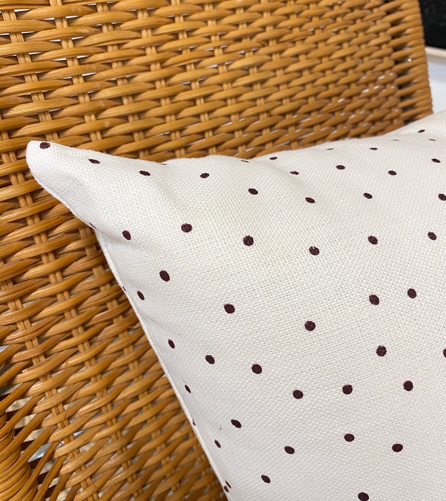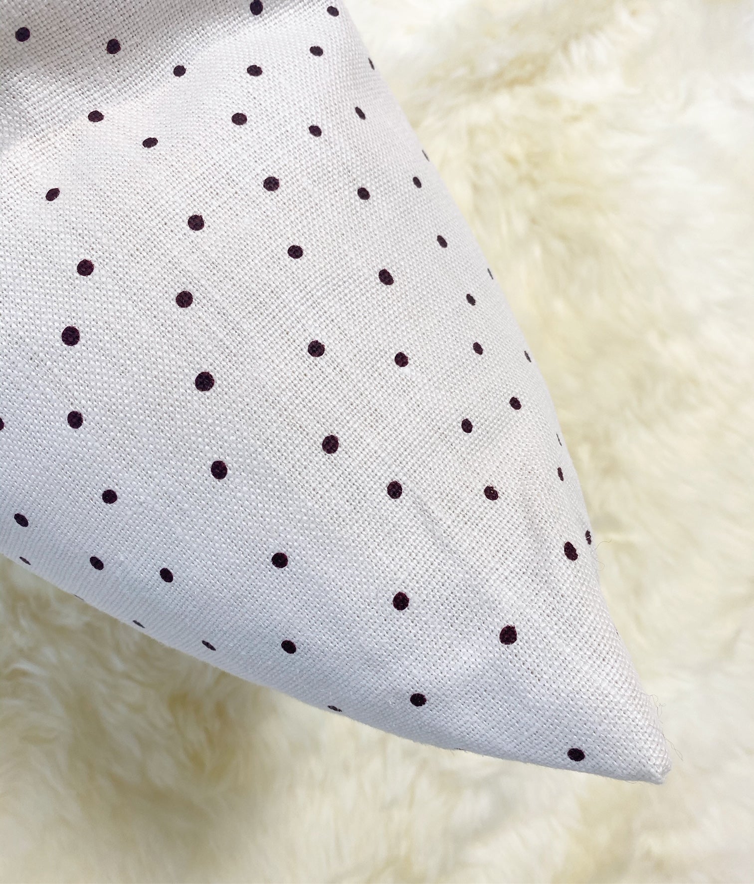 Beautiful pillow crafted in our Saint Louis studio. Rose Uniacke's line of fabrics is simple and sophisticated. We love this fabric. The deep burgundy almost black polka-dots are just so cute dotted across the milk colored linen. Seamless top. Down feather insert included. Hidden zipper.