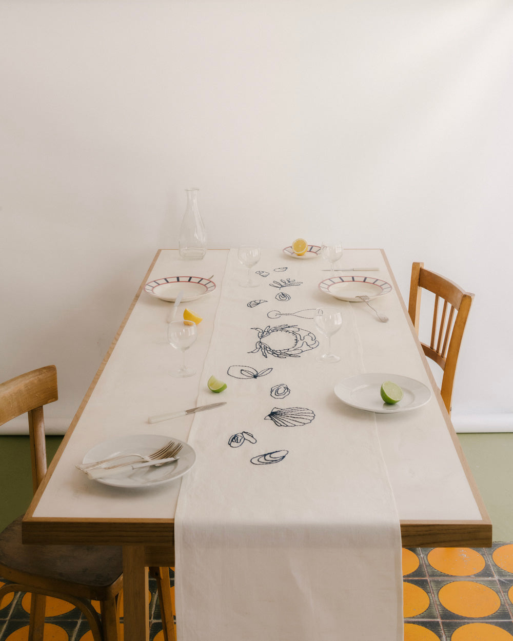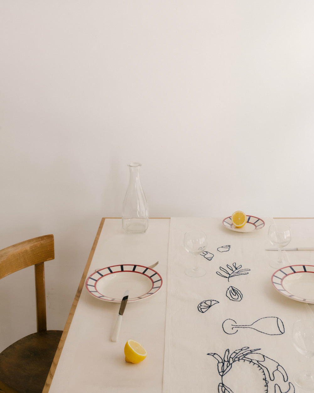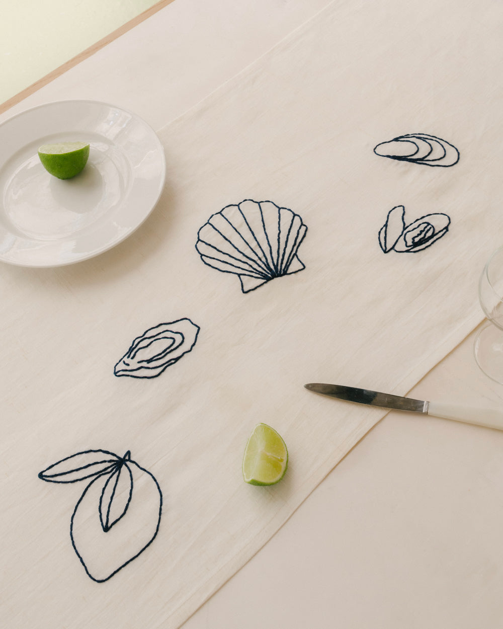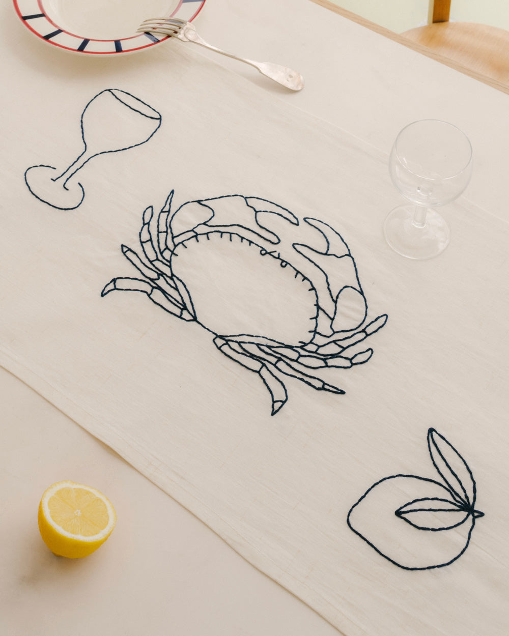 Antique French linen and cotton hand embroidered with navy blue cotton thread. The natural tone of the fabric can vary from ecru to cream.