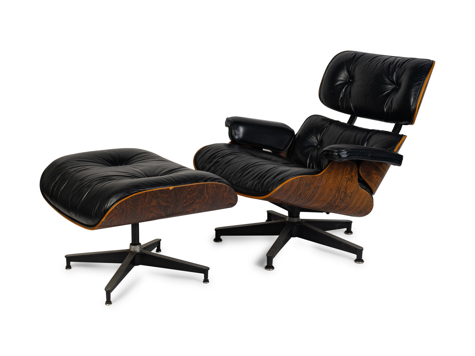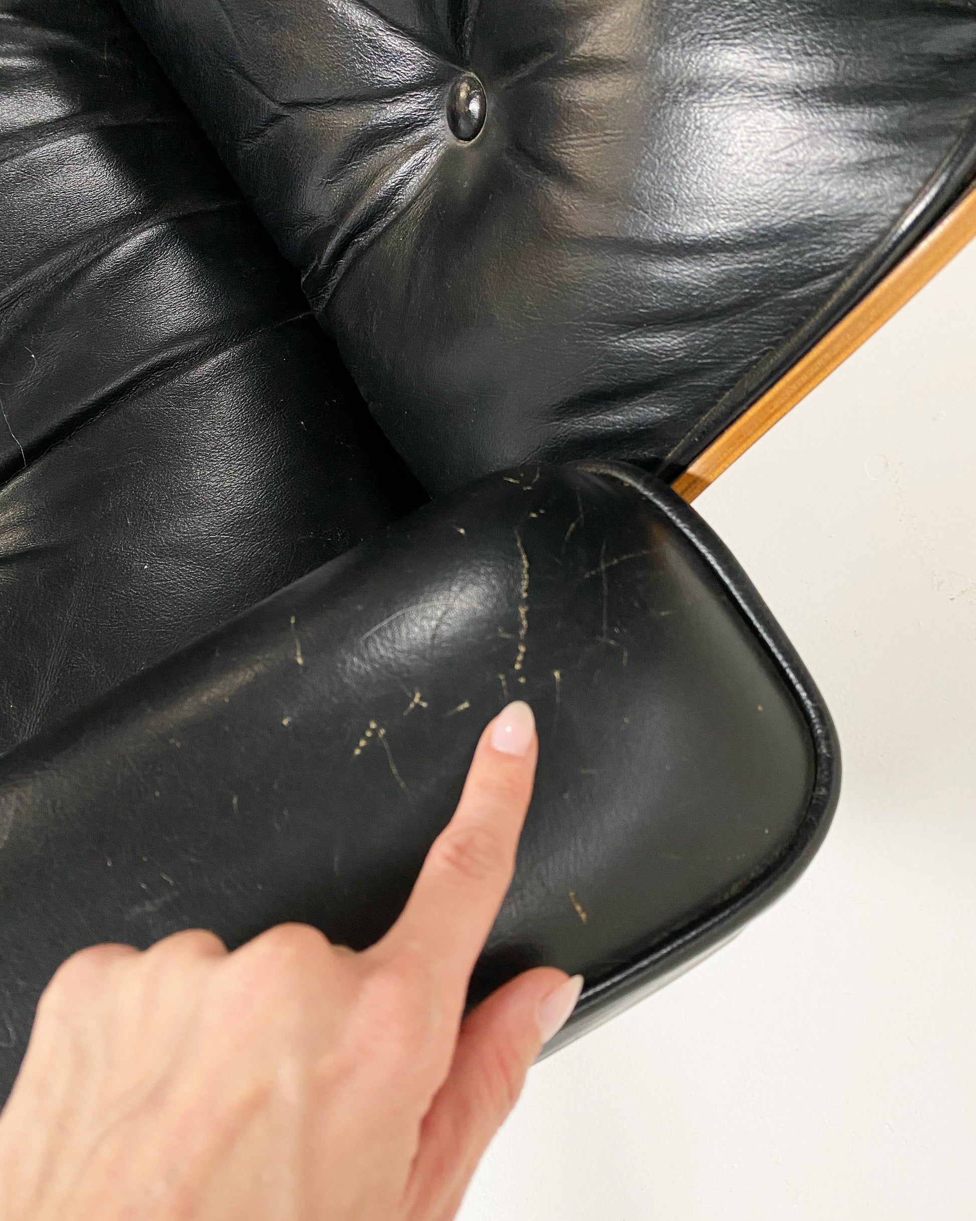 Overall fine and structurally sound, original condition. Finish is even and consistent throughout, showing scattered surface scuffs associated with age and use. Leather cushions are soft and usable, with light age-appropriate dryness, creasing, and scratches (most noticeable to armrests). Internal foam and down is still soft and plush. All foot glides are present. 1/2-inch loss to wood on ottoman. See photos.