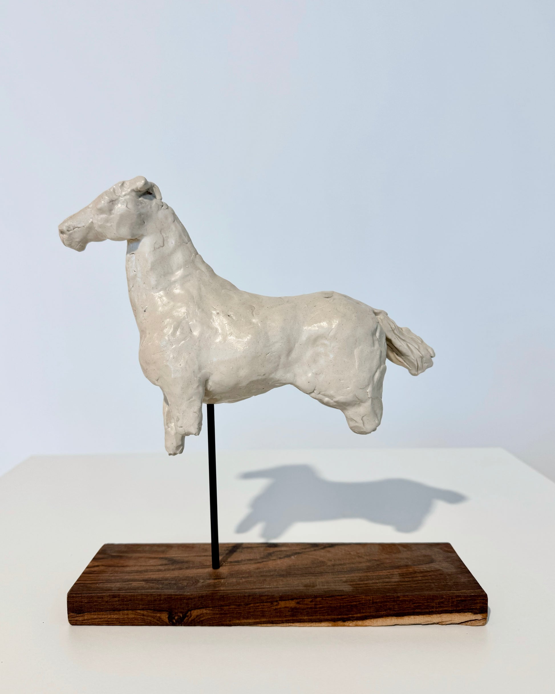The Talisman sculptures are stoneware ceramic and mounted with various hardwoods. They evoke the inexplicable connection man has always had to the beauty and power of horses and through Maggie's gestural style of sculpture they remind us of the ancient equine artifacts. They almost look as if they were recently excavated.