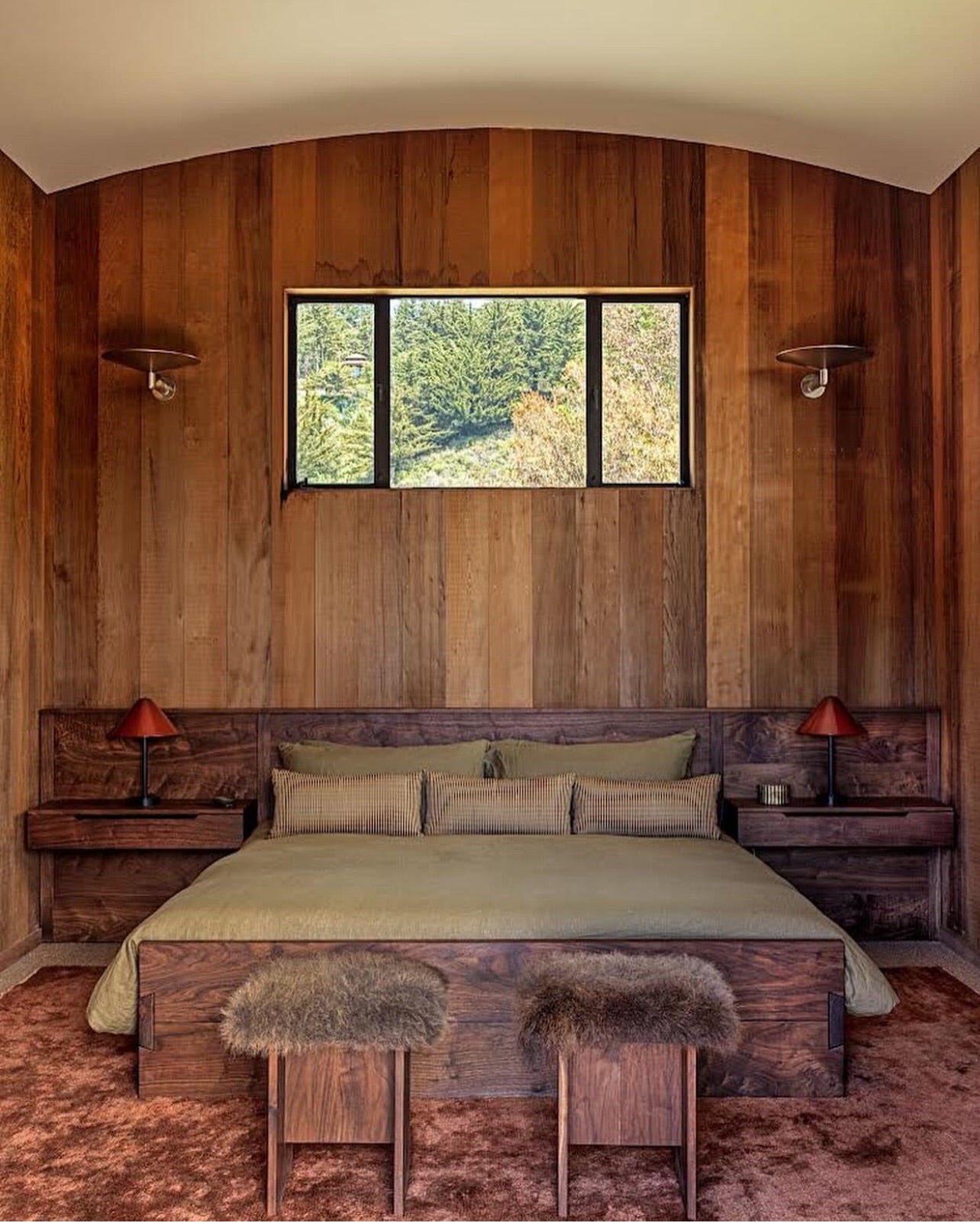 A beautiful story in Architectural Digest featuring the Big Sur home of Electric Bowery coprincipal Cayley Lambur. Sitting in the walnut clad bedroom are a pair of stools with custom bison hide cushions made by us. Read the Feature at Architectural Digest