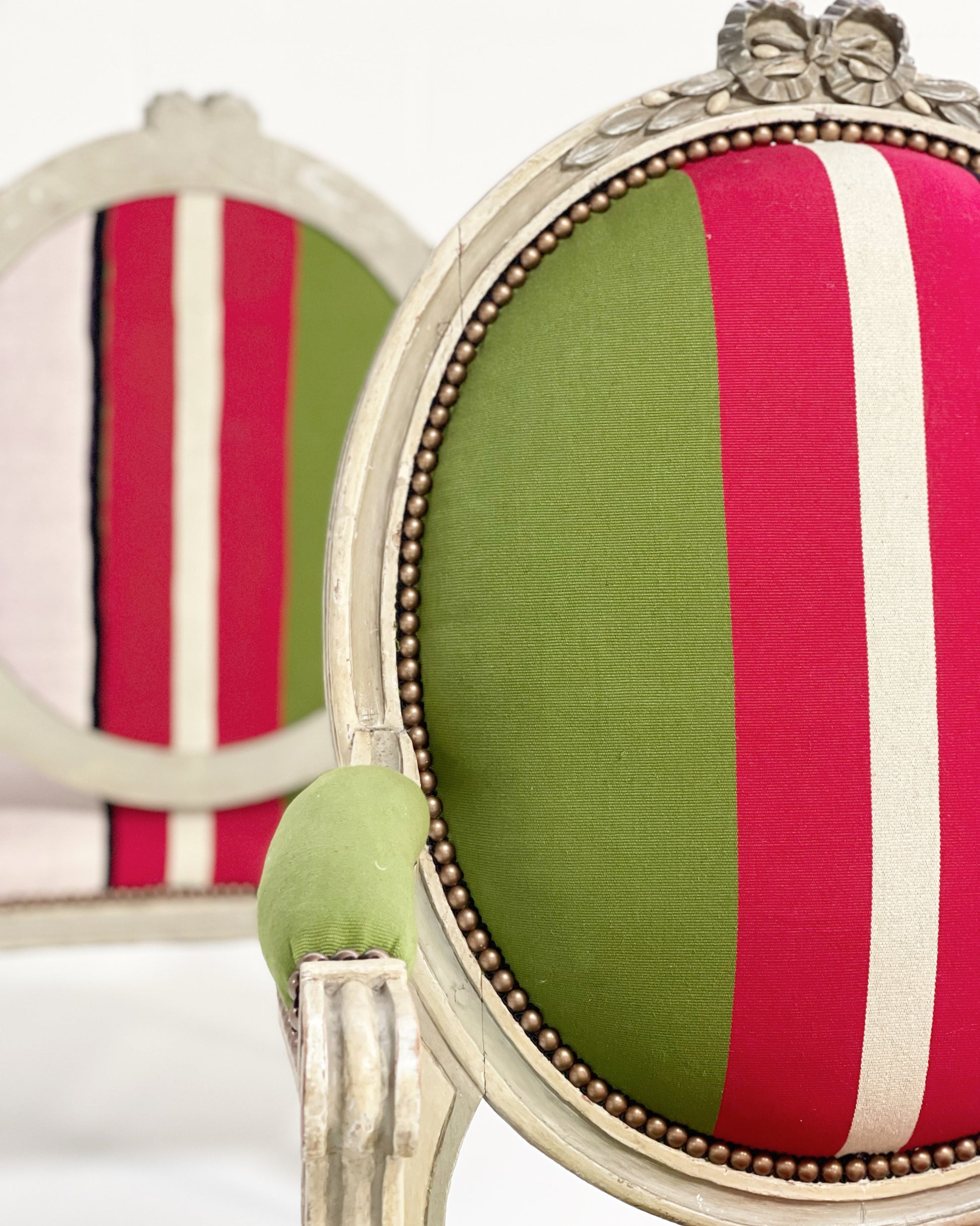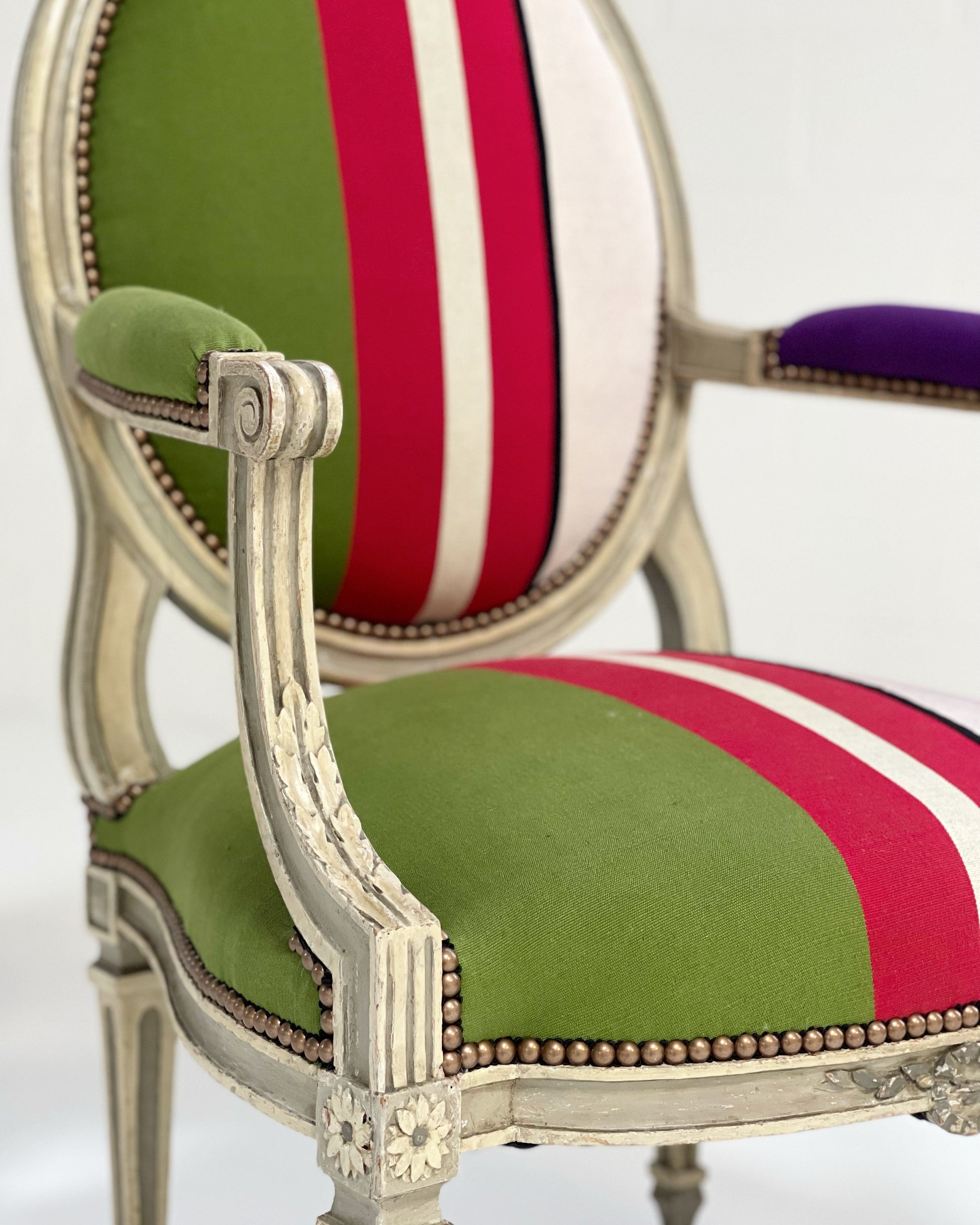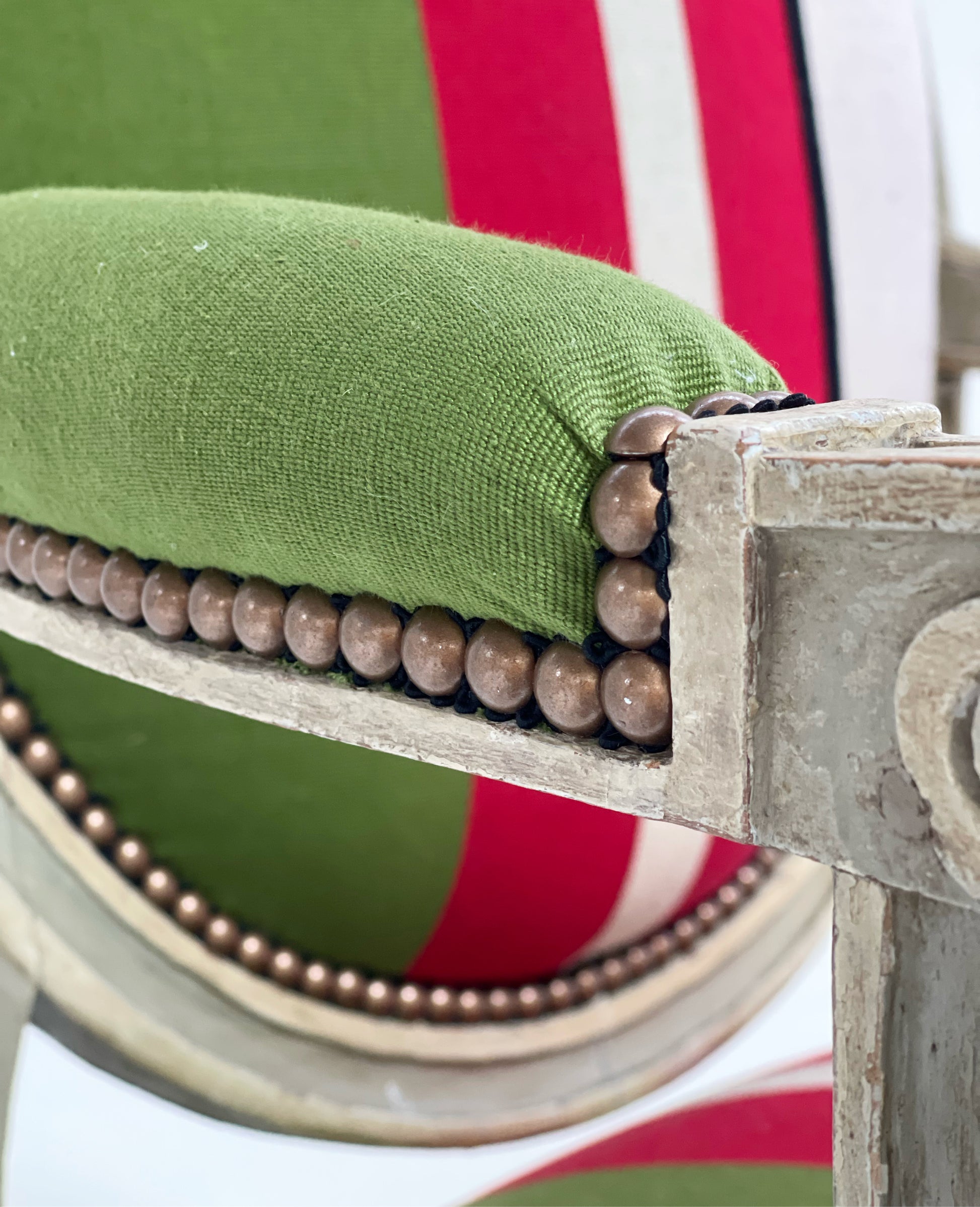 This beautiful pair is a show-stopper. During restoration, the chairs were completely rebuilt. For the finish, we chose the gorgeous Cristobal Throws by fashion brand, Colville. The vibrant colors and pattern create a modern piece destined for an incredible room. Brass nail heads finish the upholstery.