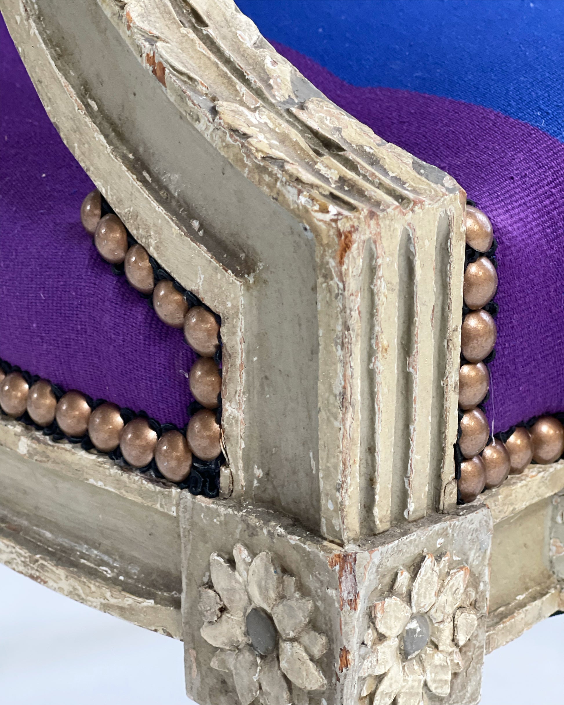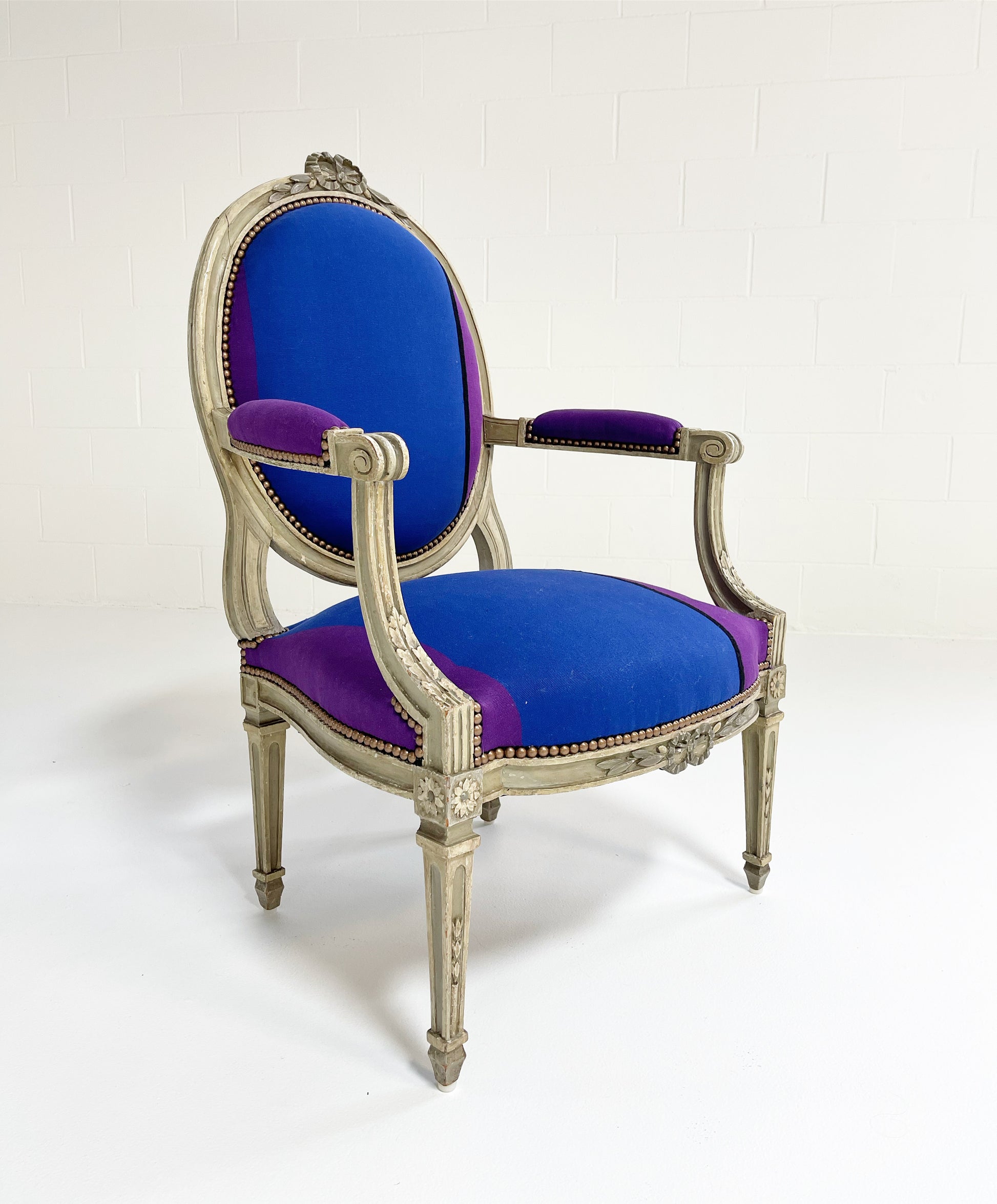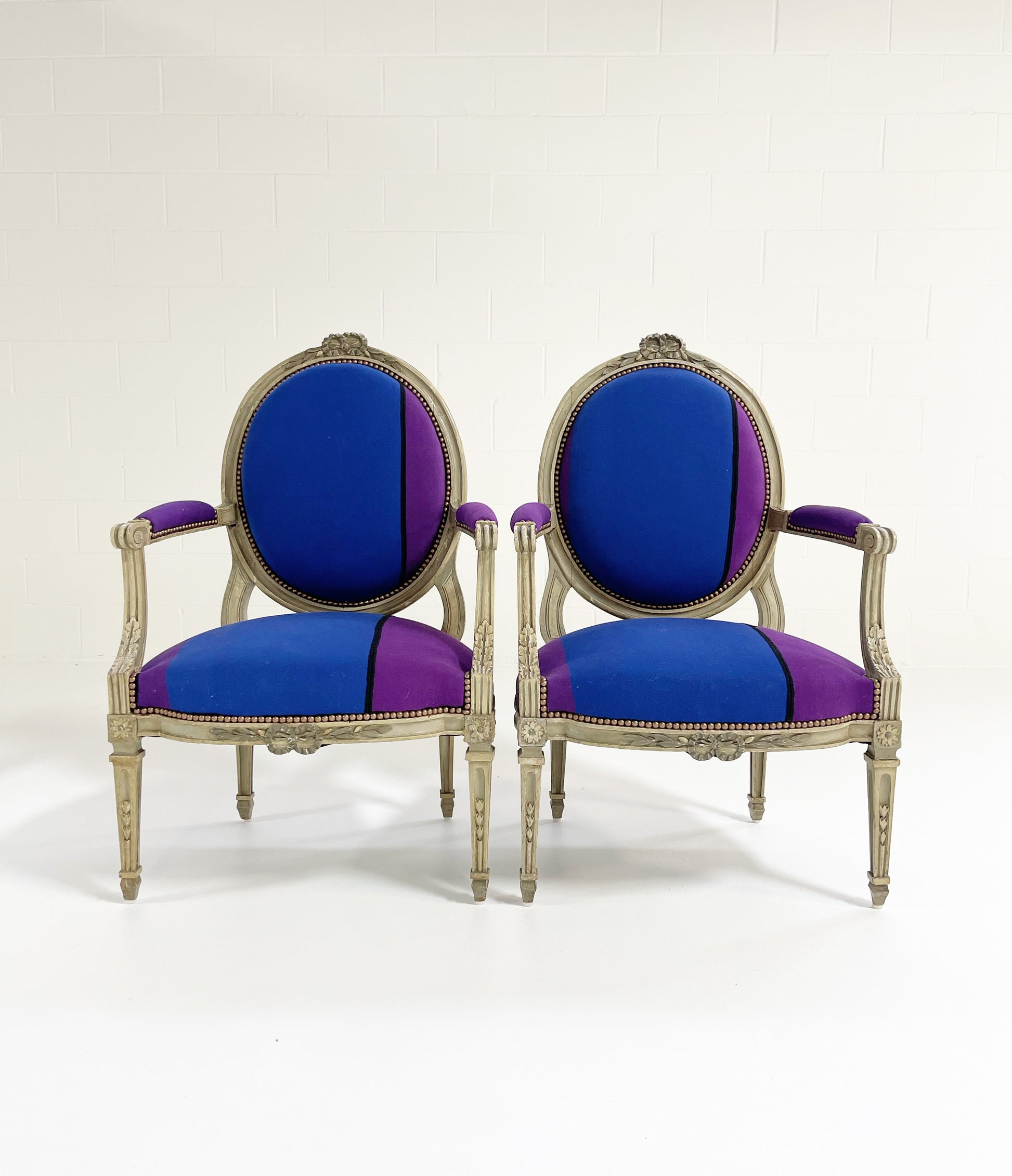 This beautiful pair is a show-stopper. During restoration, the chairs were completely rebuilt. For the finish, we chose the gorgeous Cristobal Throws by fashion brand, Colville. The vibrant colors and pattern create a modern piece destined for an incredible room. Brass nail heads finish the upholstery.