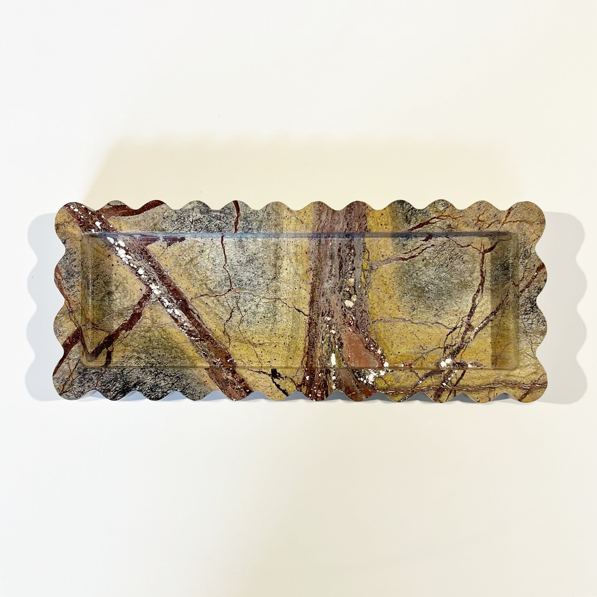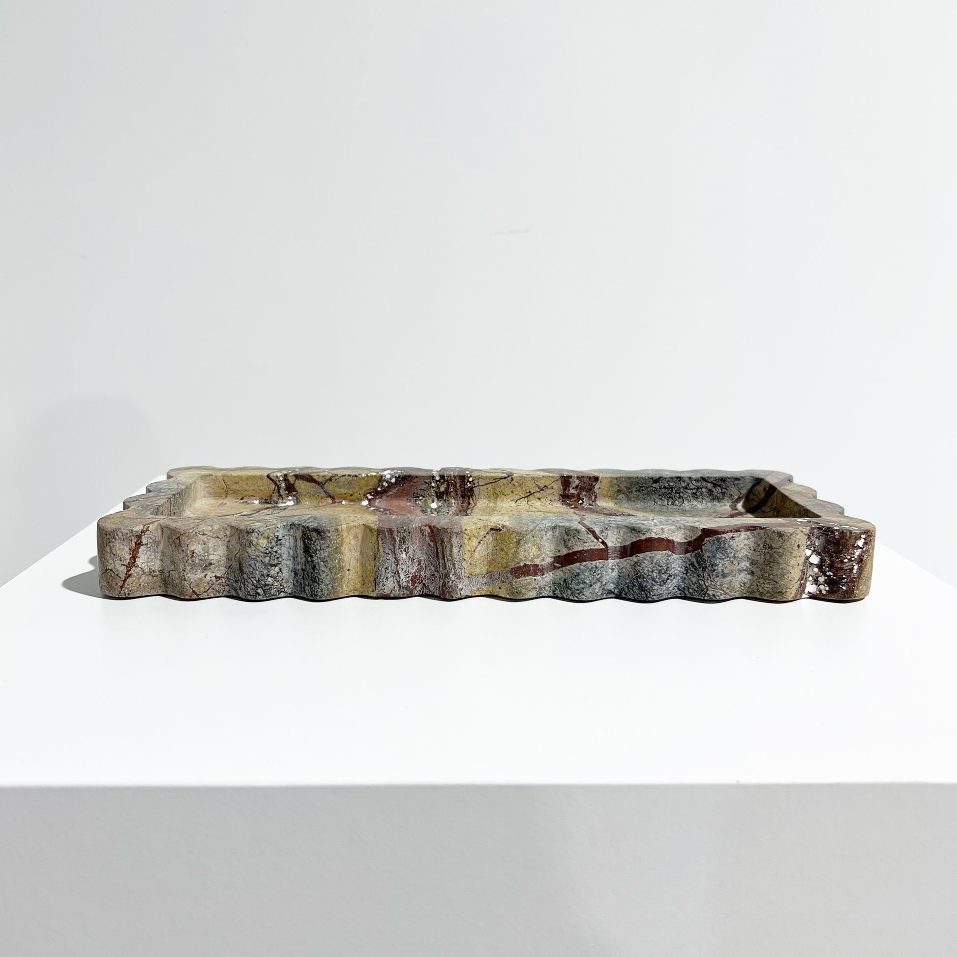 The 512 Tray is a limited production, functional object d'art. The Box is a sculptural five by twelve inch tray cut from a single piece of solid marble or stone with scalloped edges, hand-finished by artisans in a growing stone atelier in Rajasthan, India. Arrives in luxe, gift-ready packaging with felt protective pads.