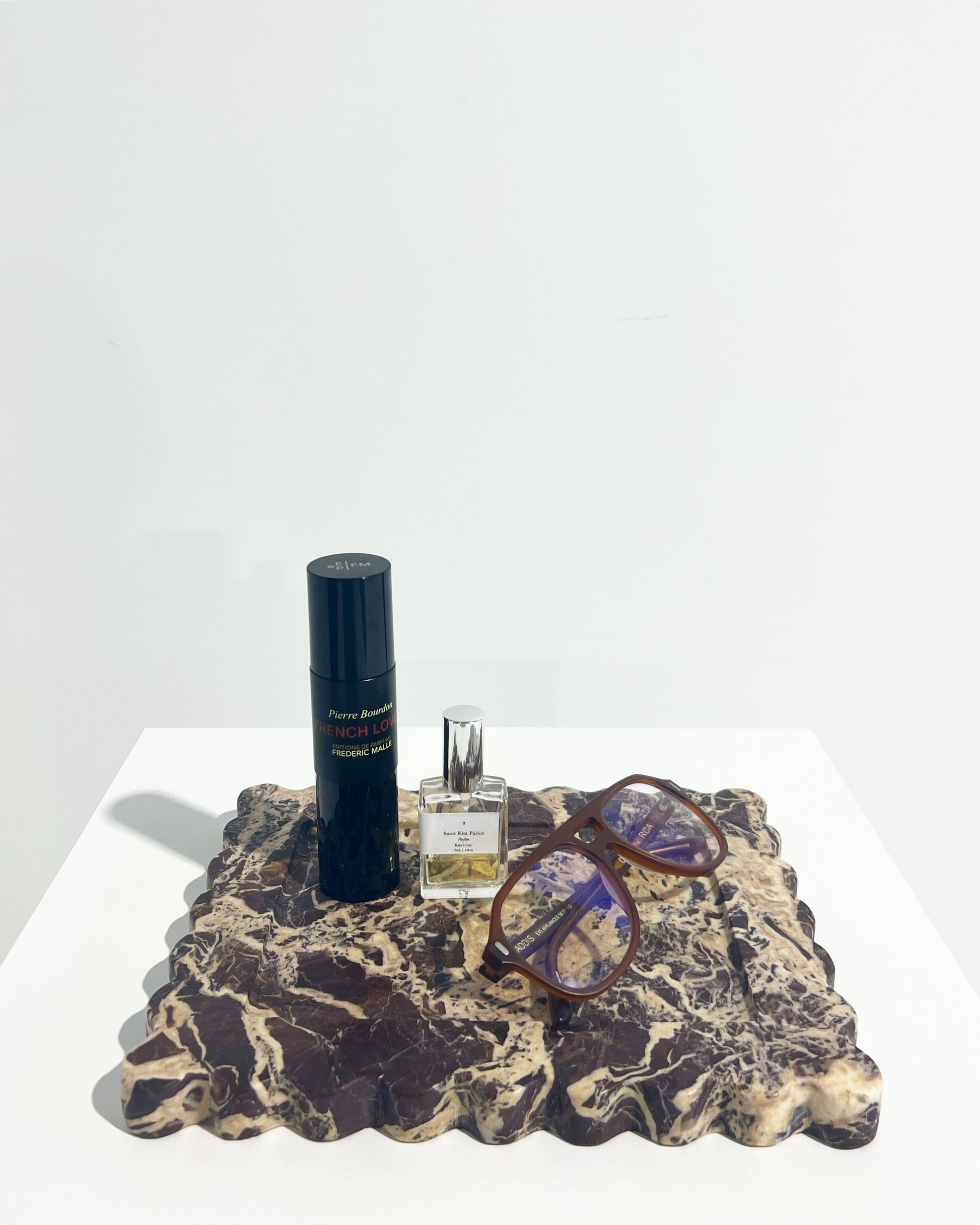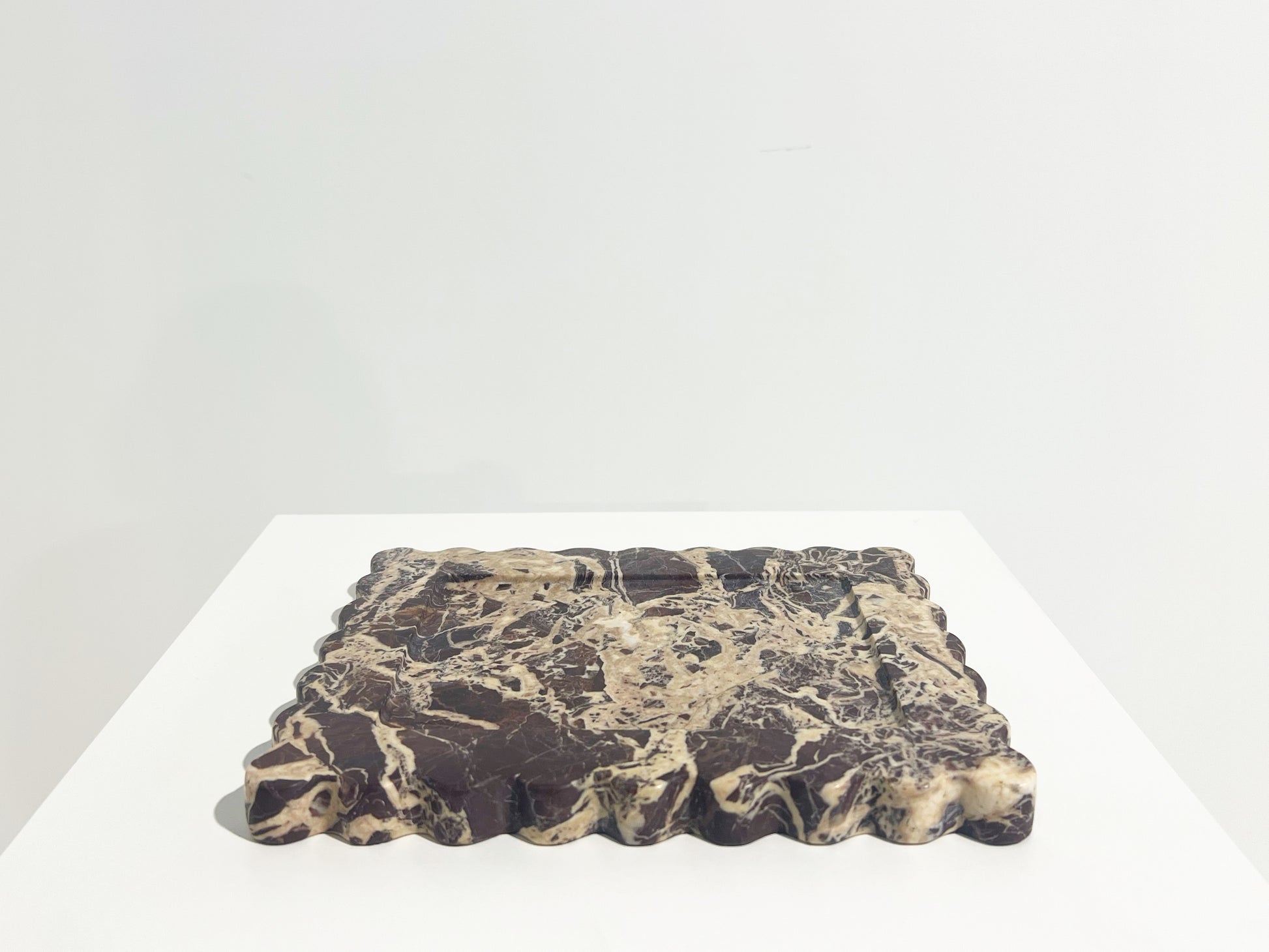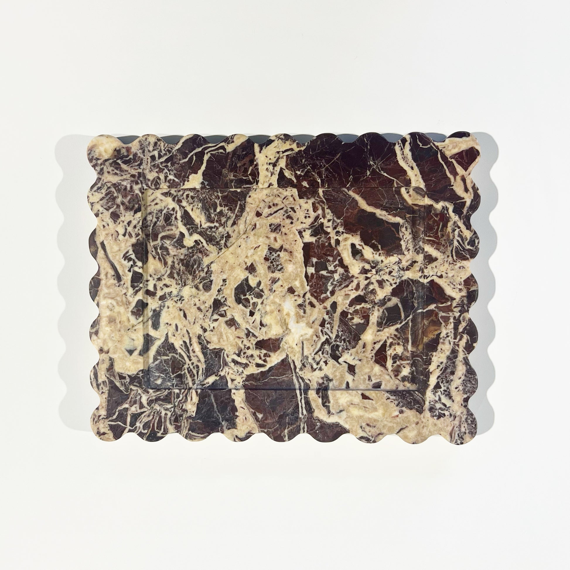 The 810 Tray is a limited production, functional object d'art. It is a sculptural 8 x 10 inch tray cut from a single piece of solid marble or stone with scalloped edges, hand-finished by artisans in a growing stone atelier in Rajasthan, India. Arrives in luxe, gift-ready packaging with felt protective pads.