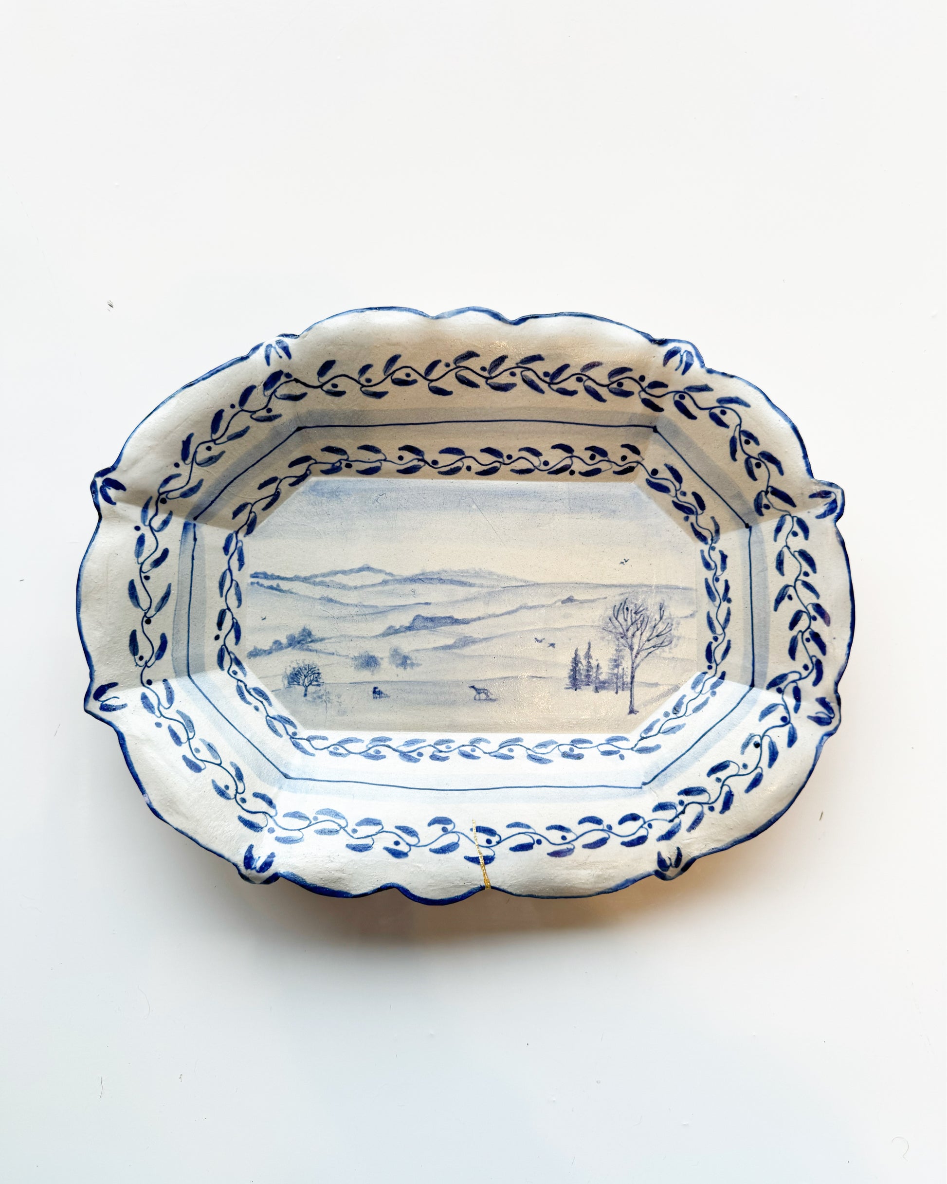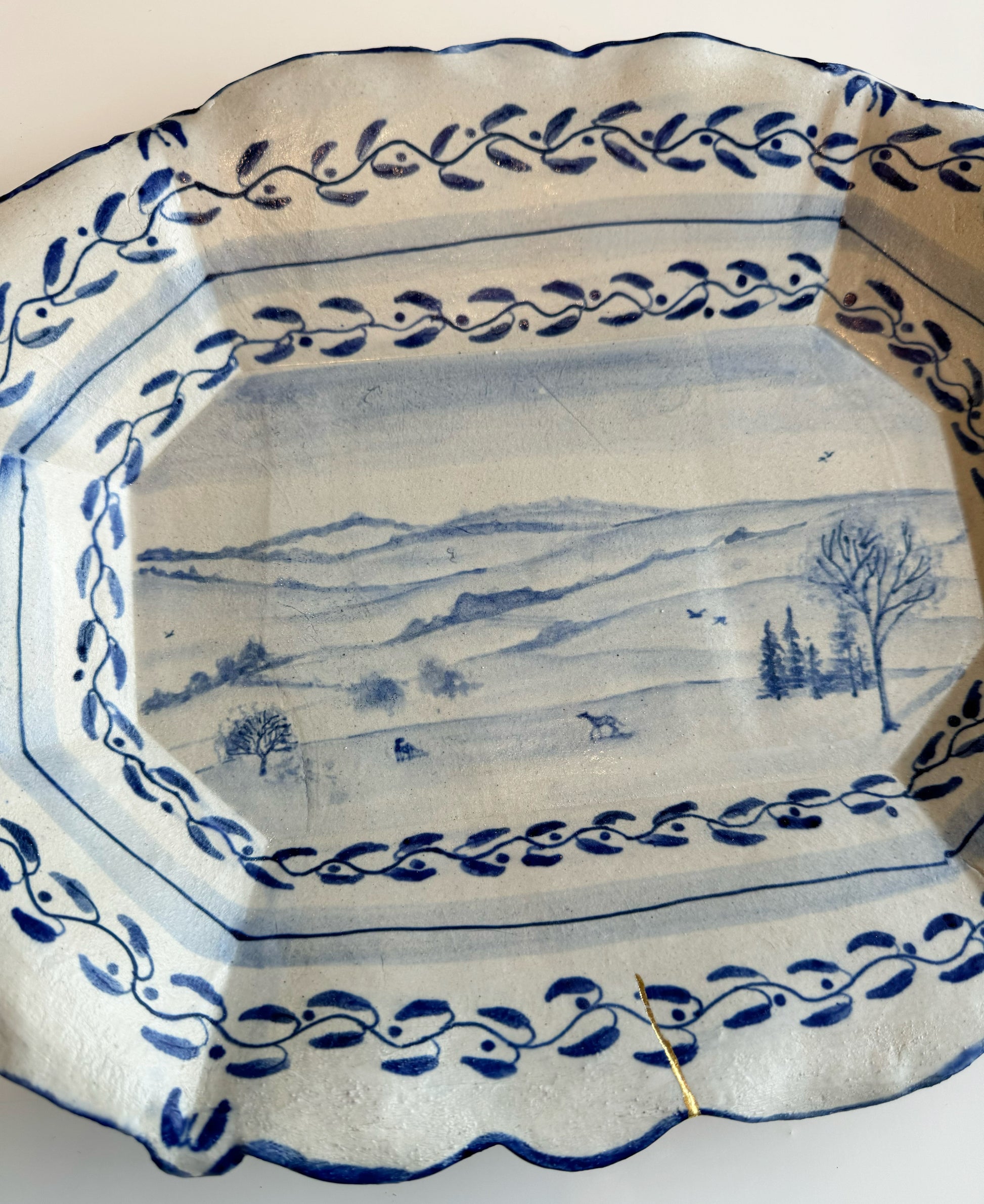 The Country Gentleman Collection by artist Maggie Robertson is a beautiful series of one-of-a-kind stoneware vessels. Each unique piece embraces the seams and irregularities of her hand-built technique complemented by intricate, hand-painted scenes of the English countryside in classic blue and white. The vessels are water tight and food safe, microwaveable and dishwasher safe; however, as they are art pieces and fragile, we would recommend hand washing.