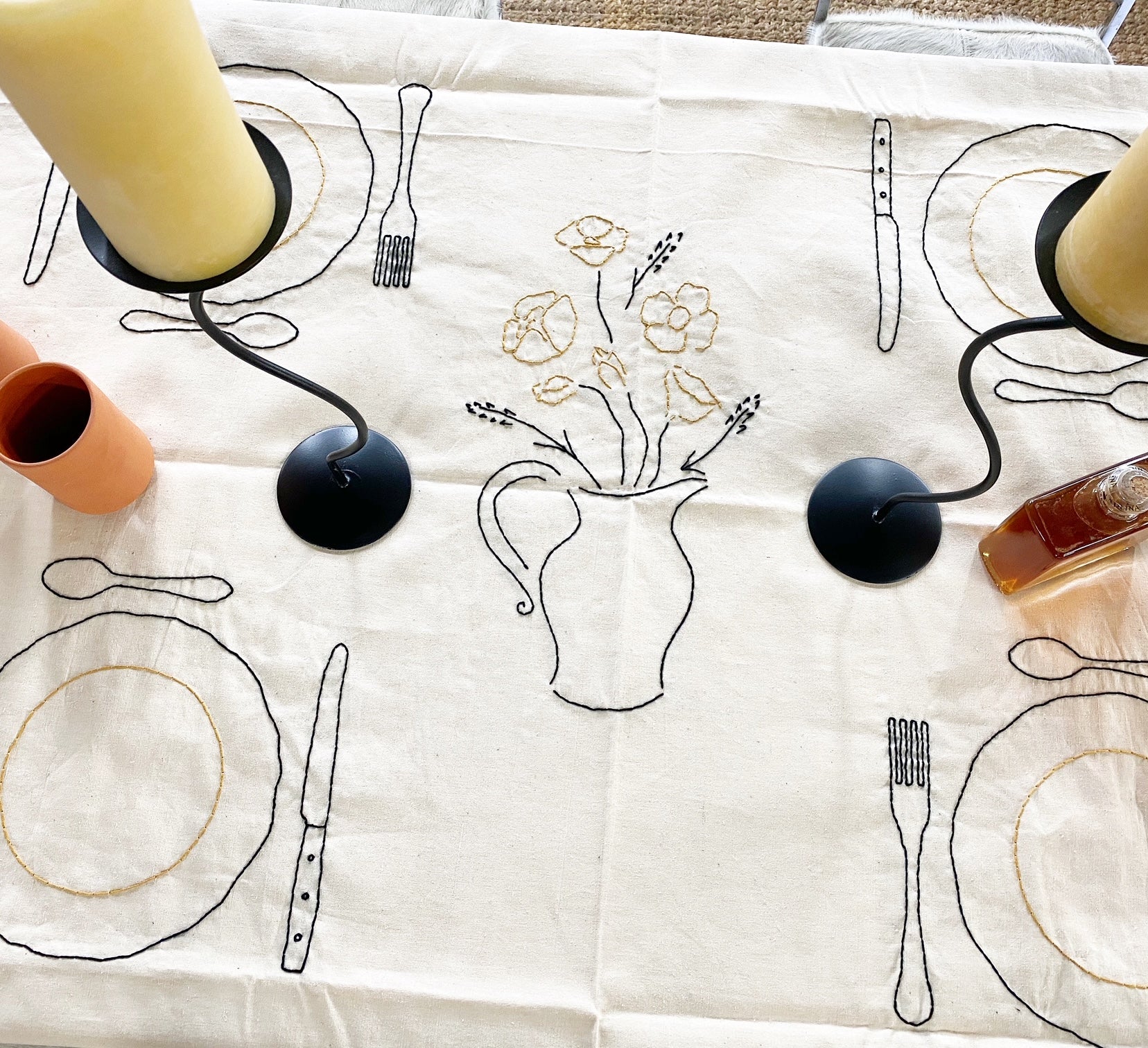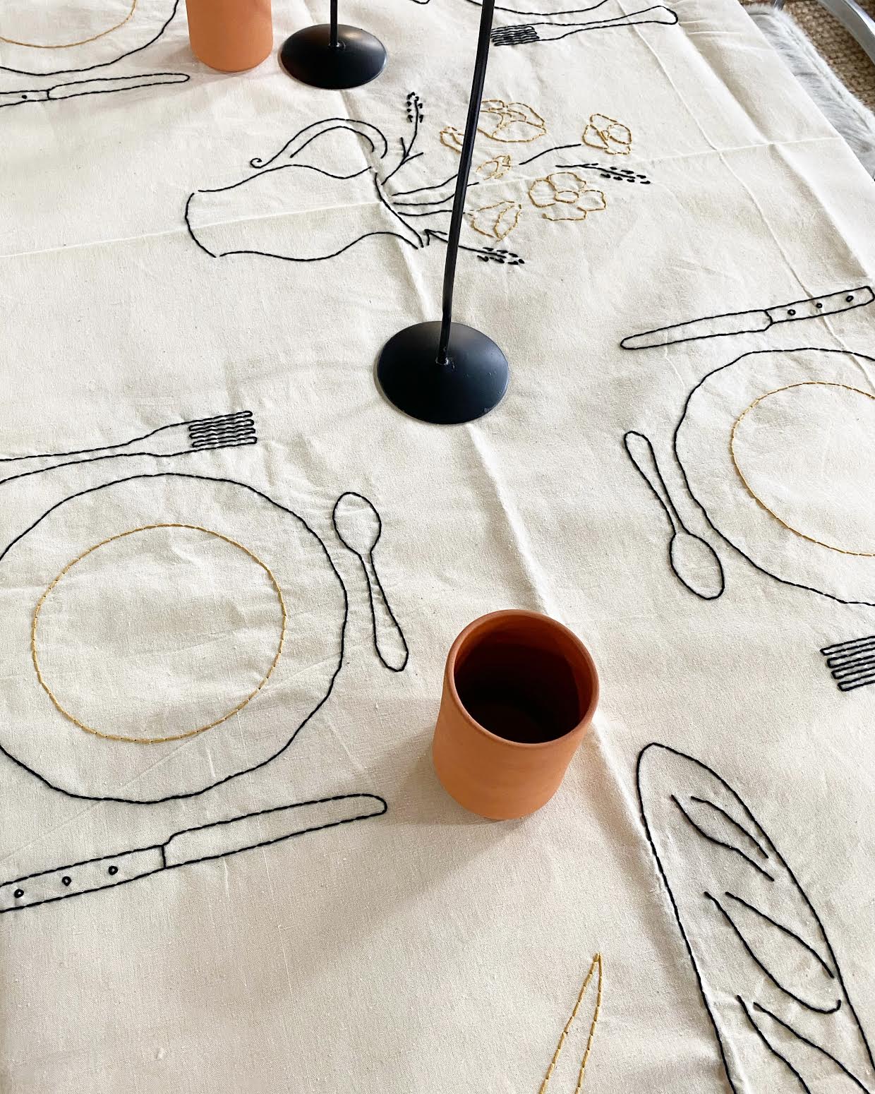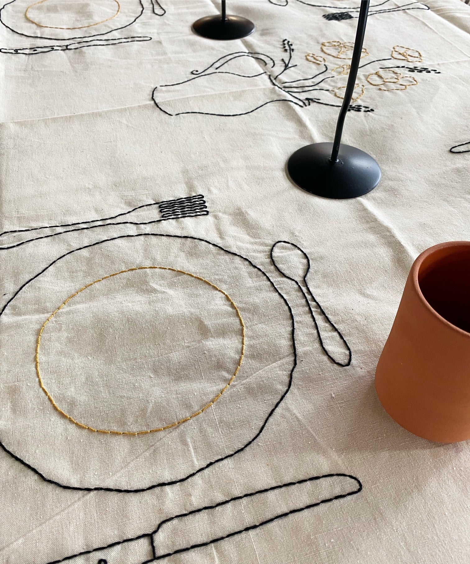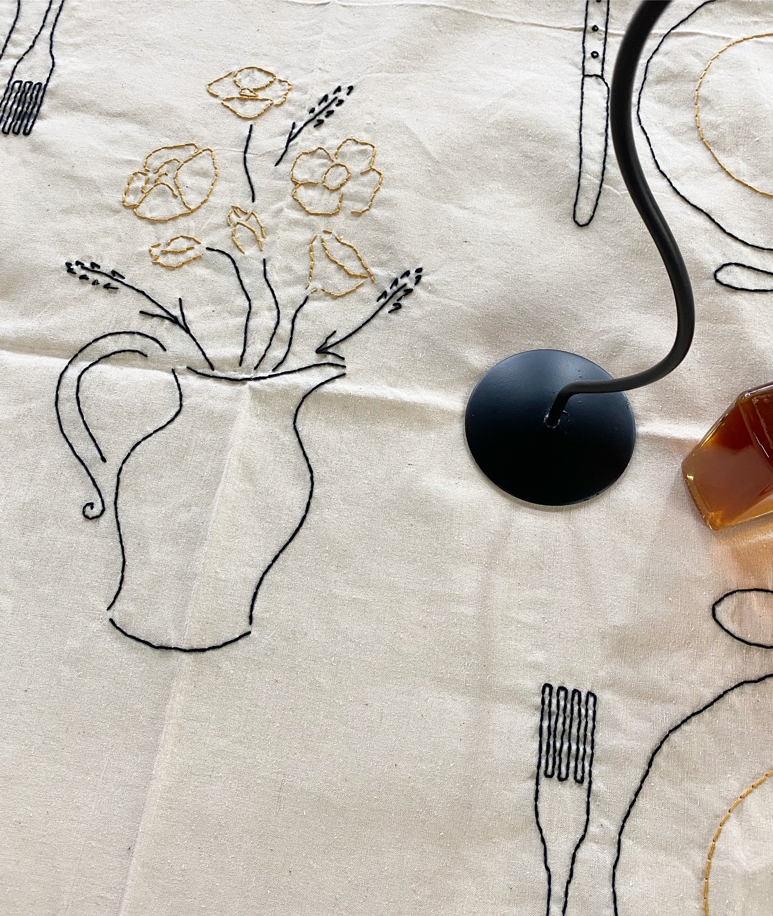 Hand embroidered antique linen tablecloth. Imagery and icons reminiscent of a country meal shared with family and friends. A bouquet of flowers, a baguette and knife, and more.