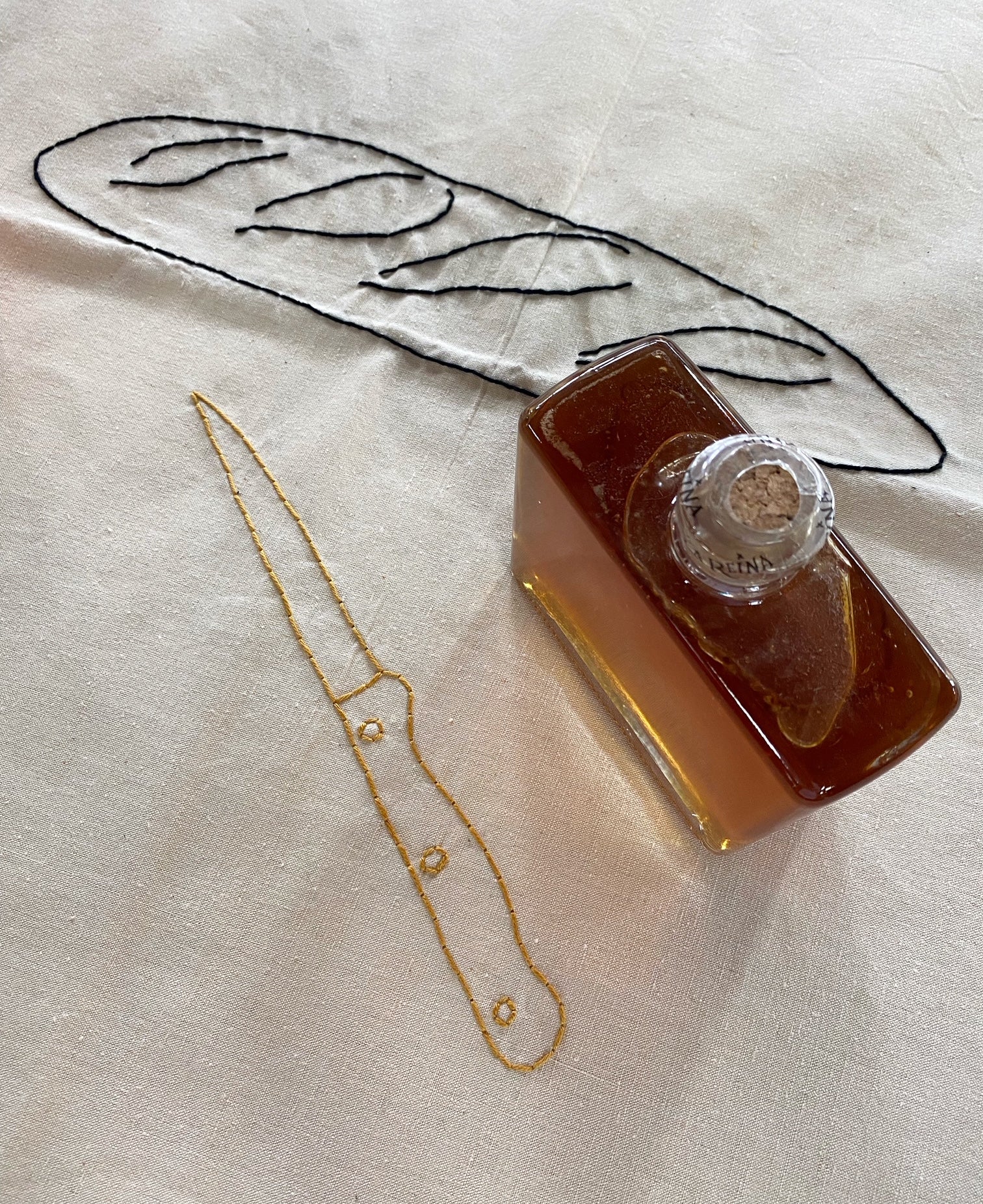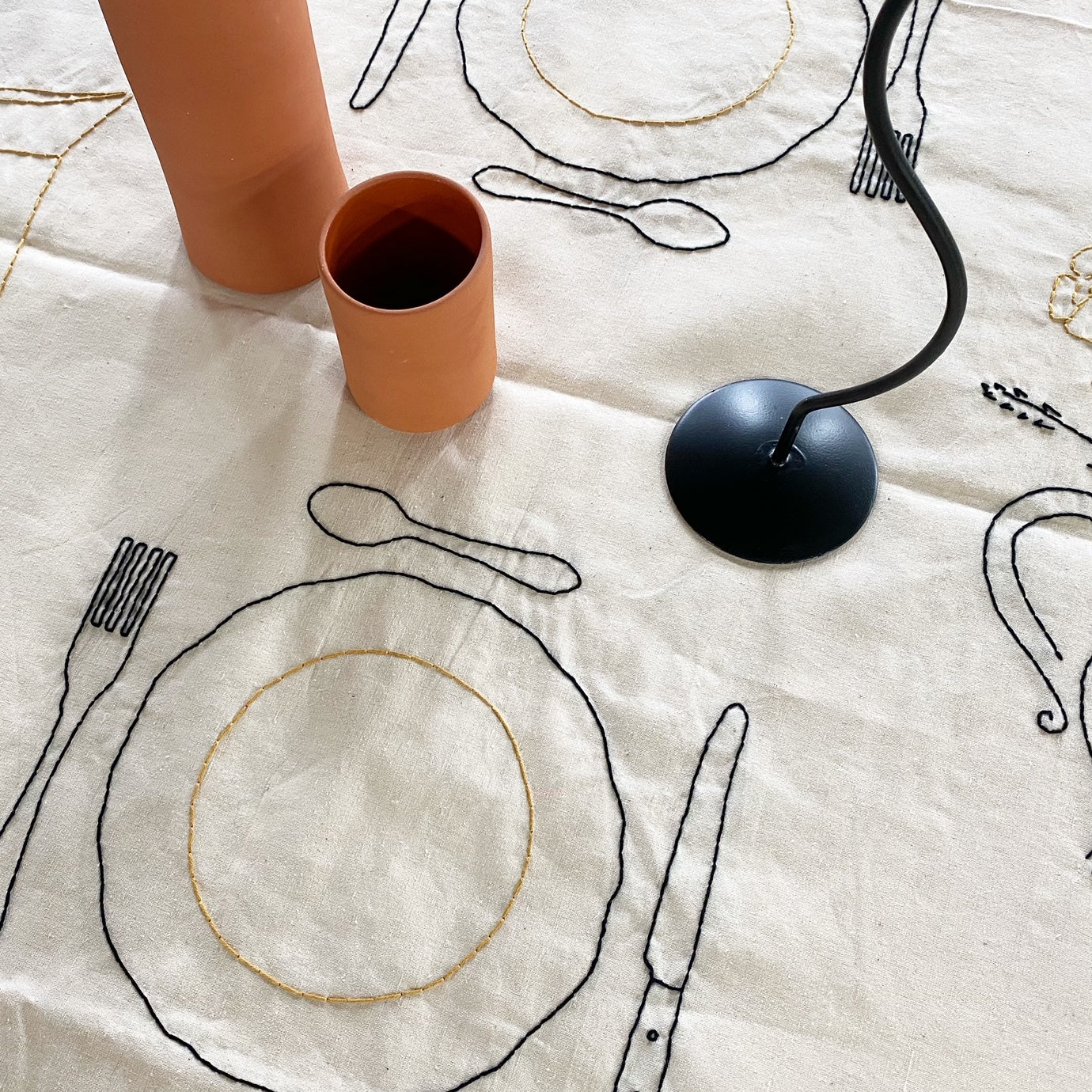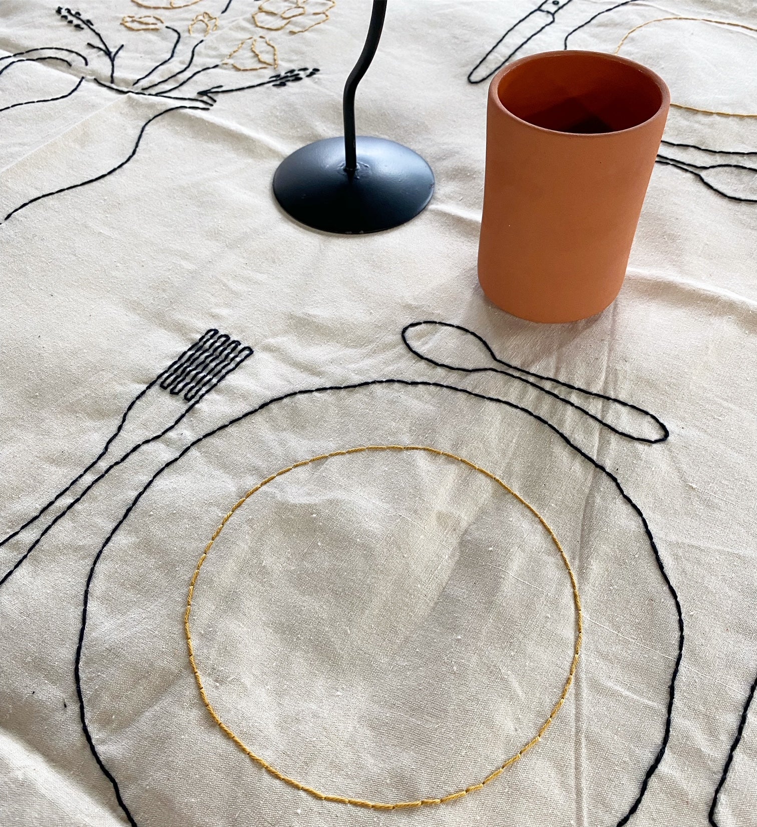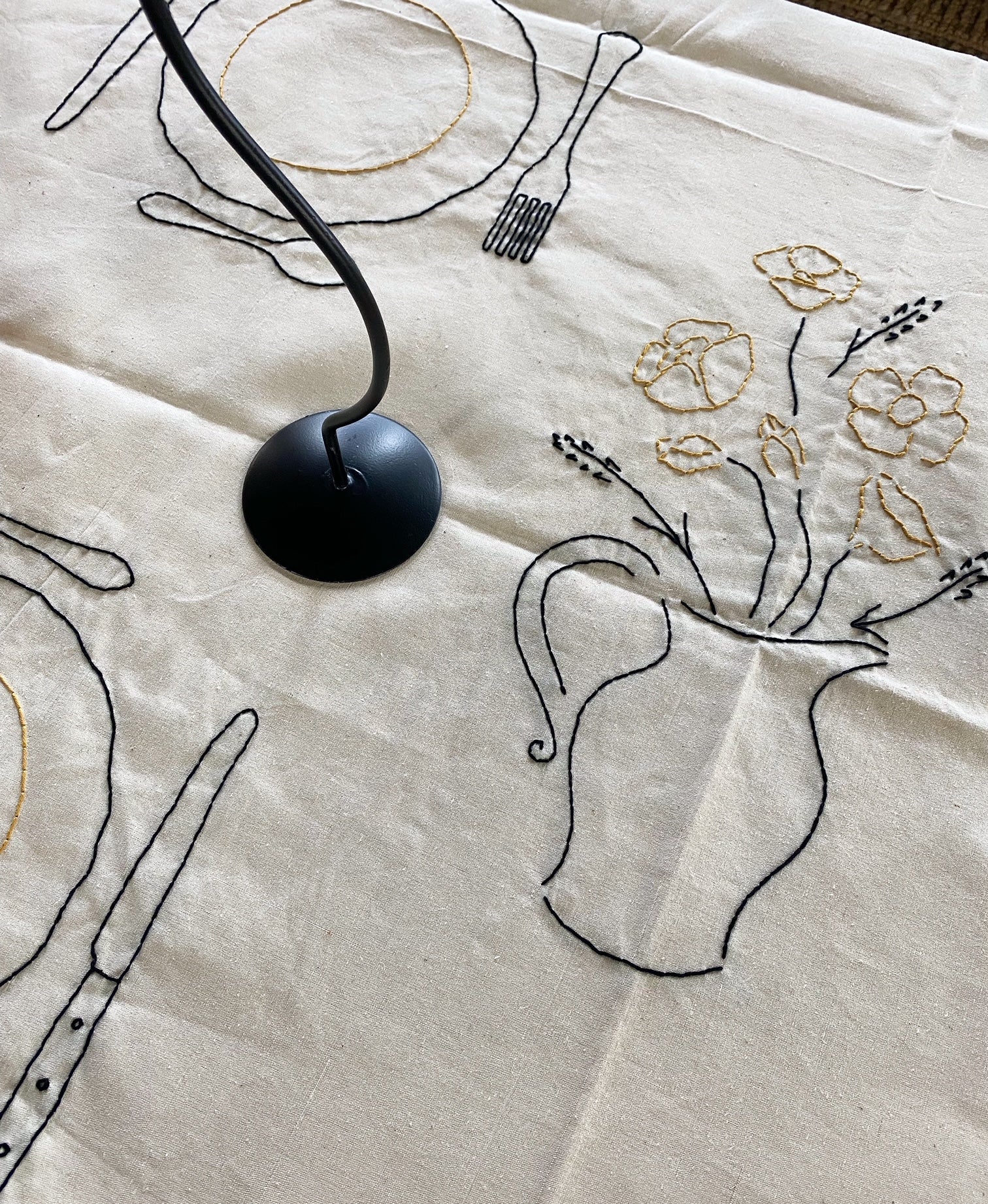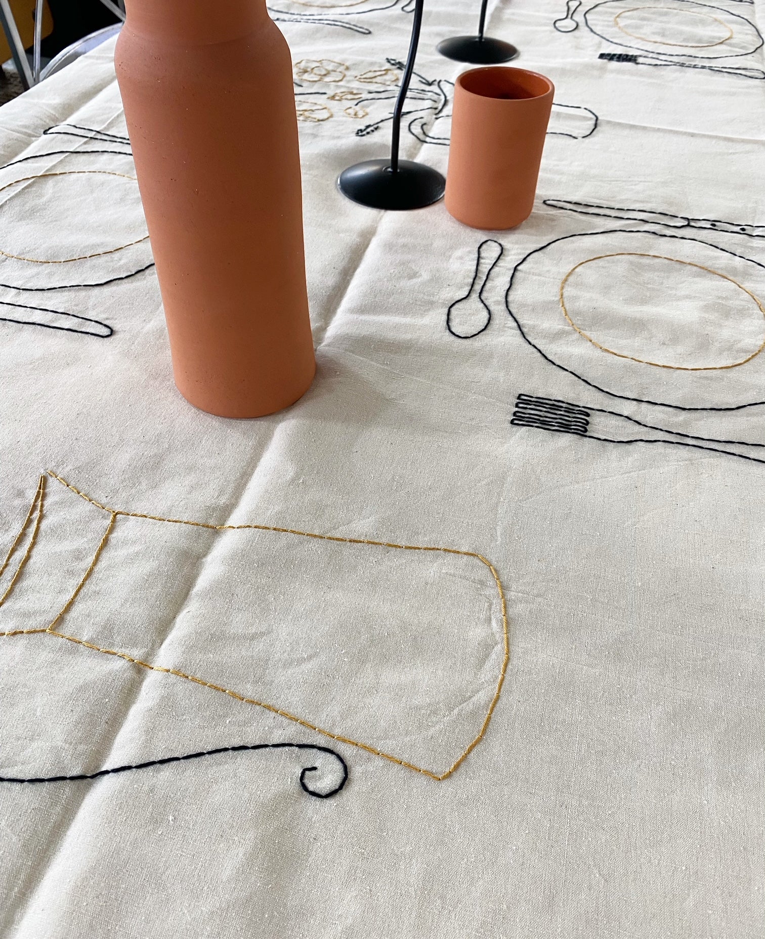 Hand embroidered antique linen tablecloth. Imagery and icons reminiscent of a country meal shared with family and friends. A bouquet of flowers, a baguette and knife, and more.