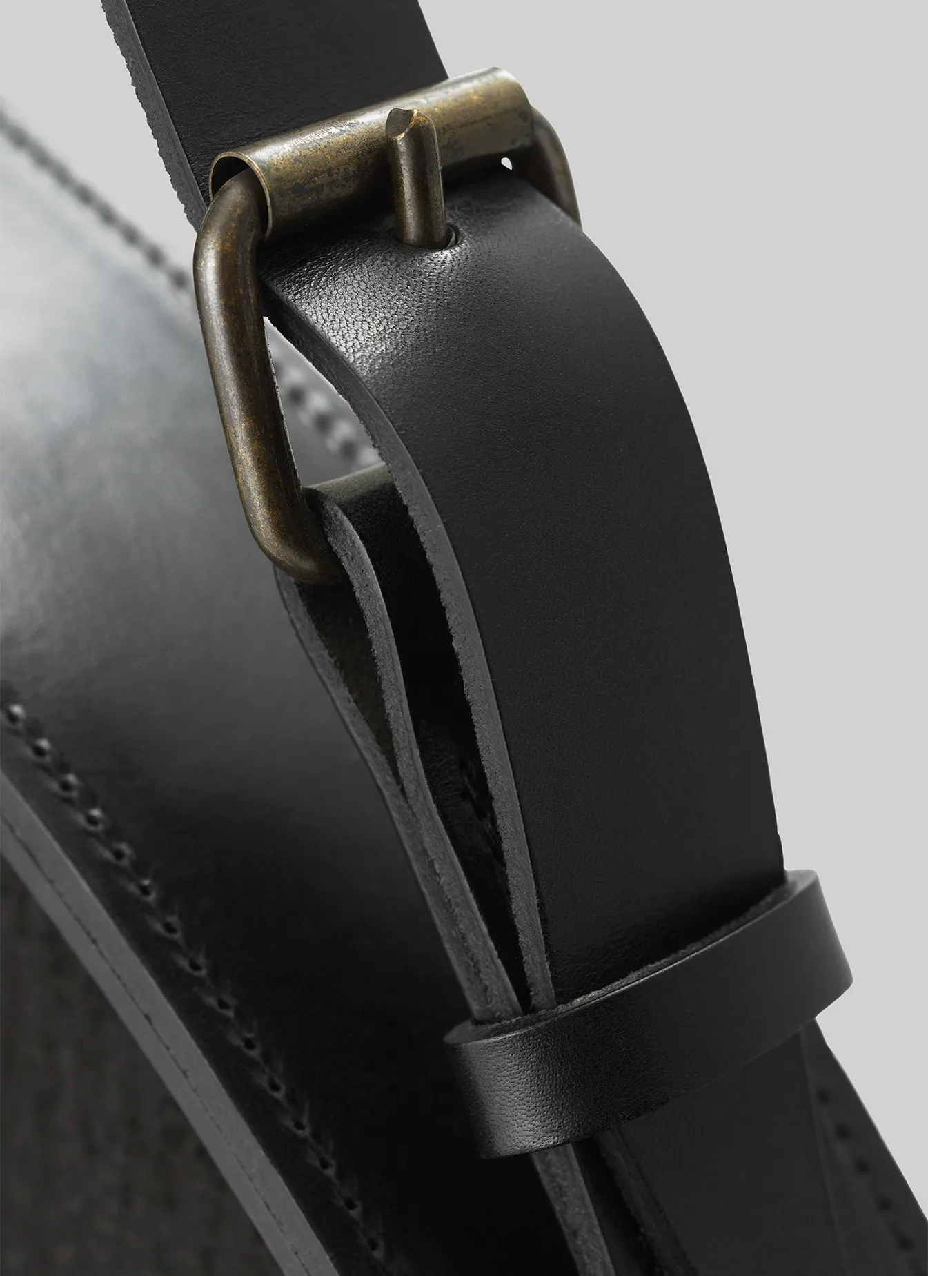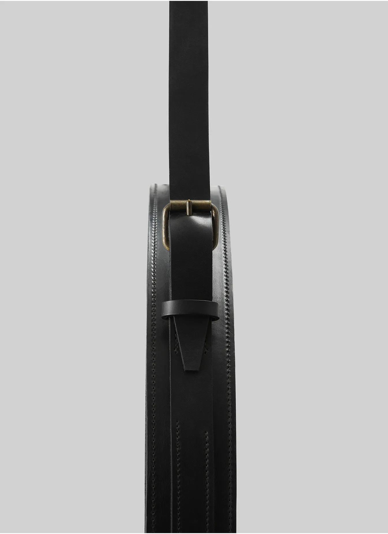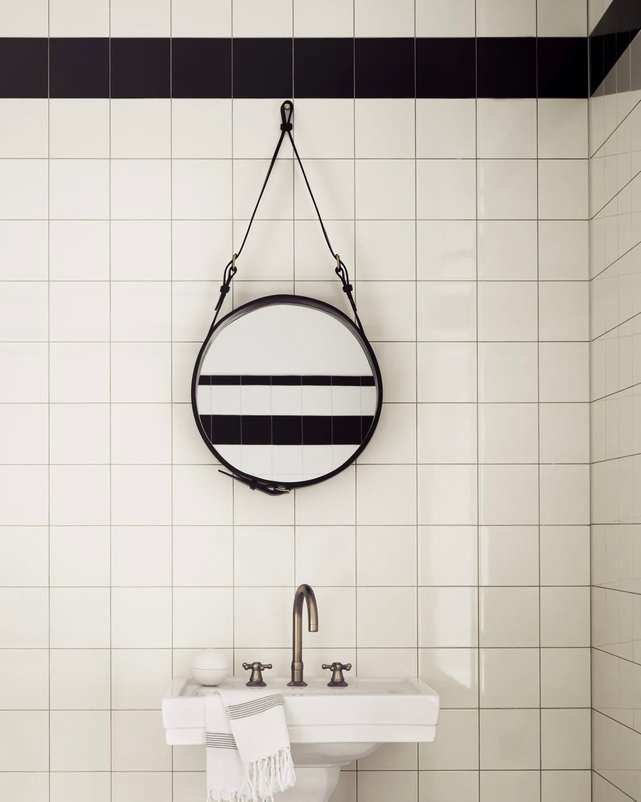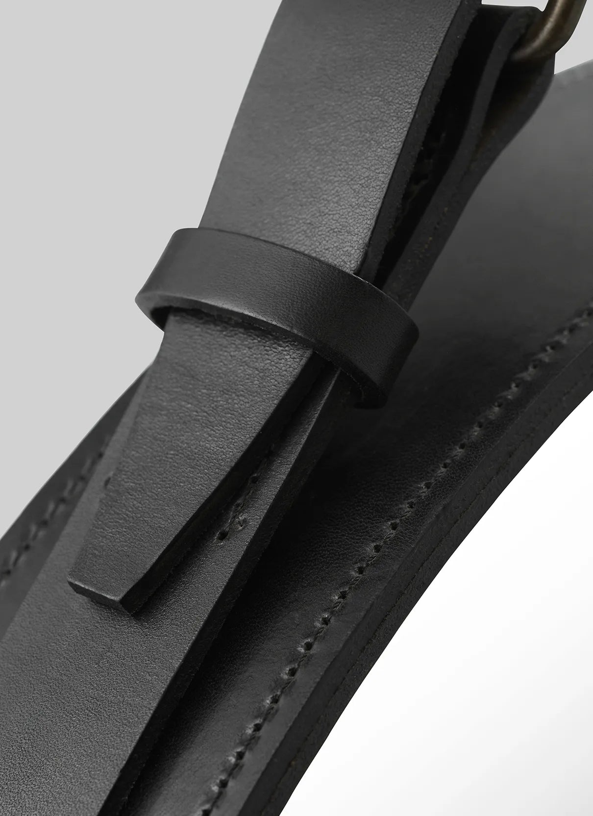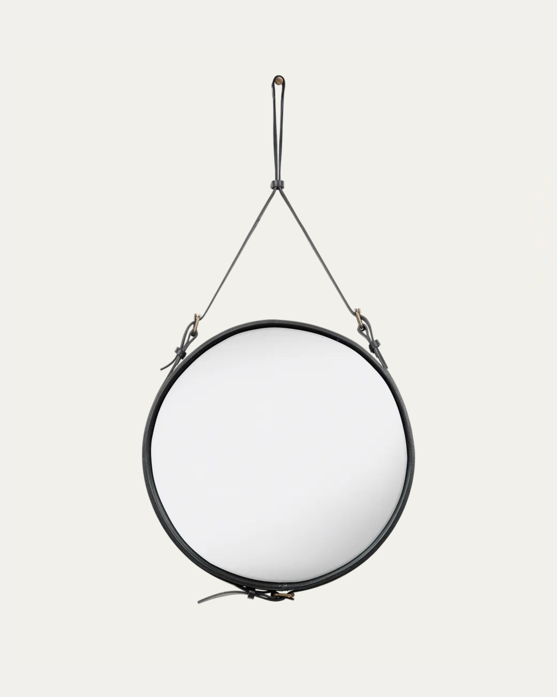 In 1950, Jacques Adnet formed a partnership with a famous French fashion house, where he developed a collection of discreet yet voluptuous leather-covered furniture and interior accessories. Known for being an innovative thinker, Adnet was one of the first designers to combine leather with glass. Accordingly, he designed this elegant, distinctive round leather mirror with equestrian inspired detailing. Besides the remarkable leather and burnished brass details, the mirror in 3 sizes is also unique as the strap holding the mirror is in direct proportion to the dimension of it. The timeless Adnet Wall Mirror adds a sculptural value to any hallway, bathroom, or living room and the 3 sizes can advantageously be combined to create an outstanding expression.
