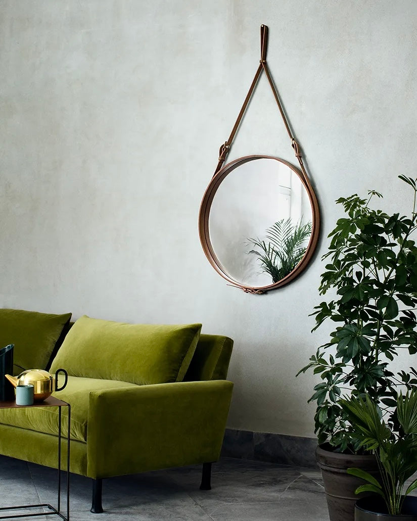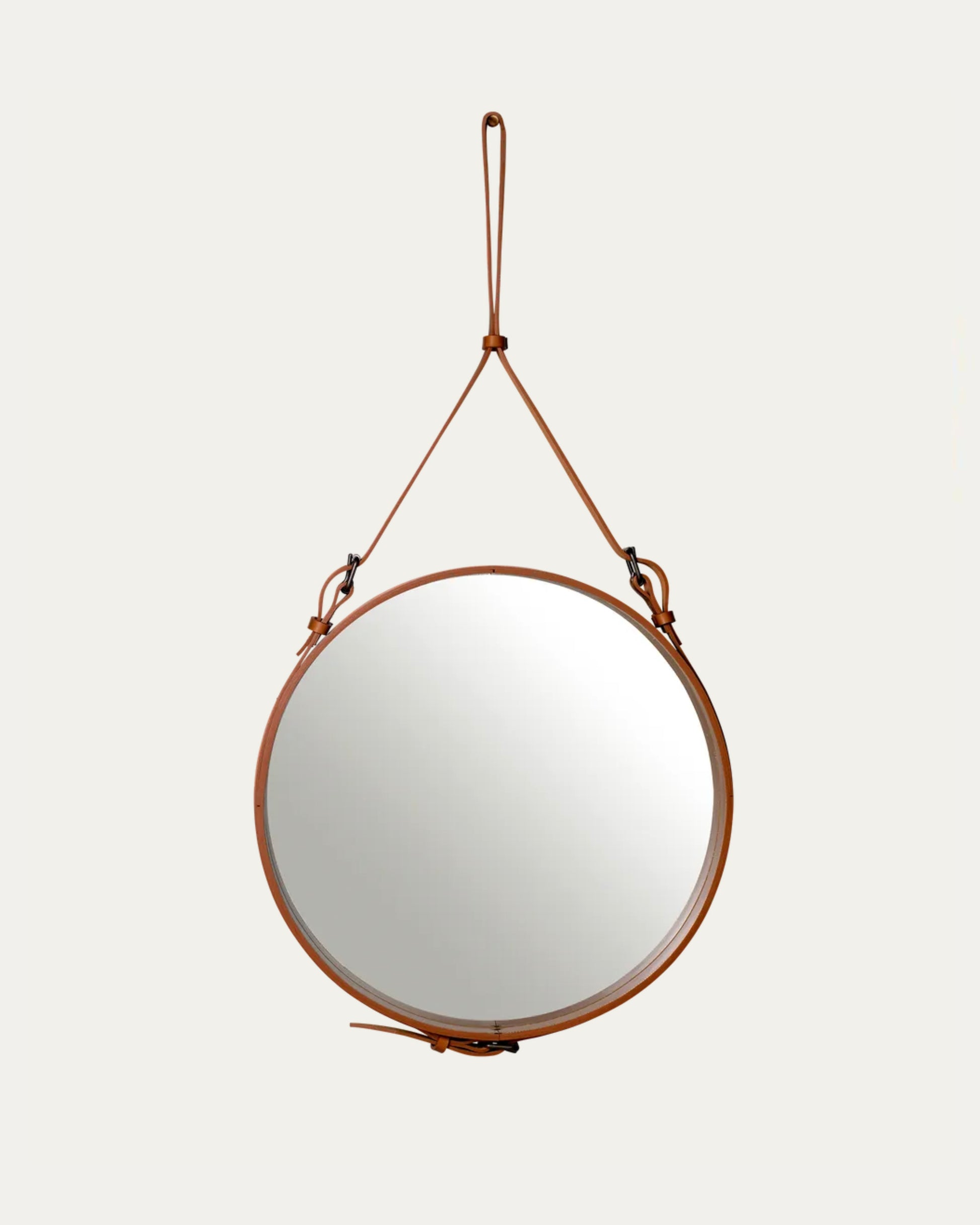 In 1950, Jacques Adnet formed a partnership with a famous French fashion house, where he developed a collection of discreet yet voluptuous leather-covered furniture and interior accessories. Known for being an innovative thinker, Adnet was one of the first designers to combine leather with glass. Accordingly, he designed this elegant, distinctive round leather mirror with equestrian inspired detailing. Besides the remarkable leather and burnished brass details, the mirror in 3 sizes is also unique as the strap holding the mirror is in direct proportion to the dimension of it. The timeless Adnet Wall Mirror adds a sculptural value to any hallway, bathroom, or living room and the 3 sizes can advantageously be combined to create an outstanding expression.