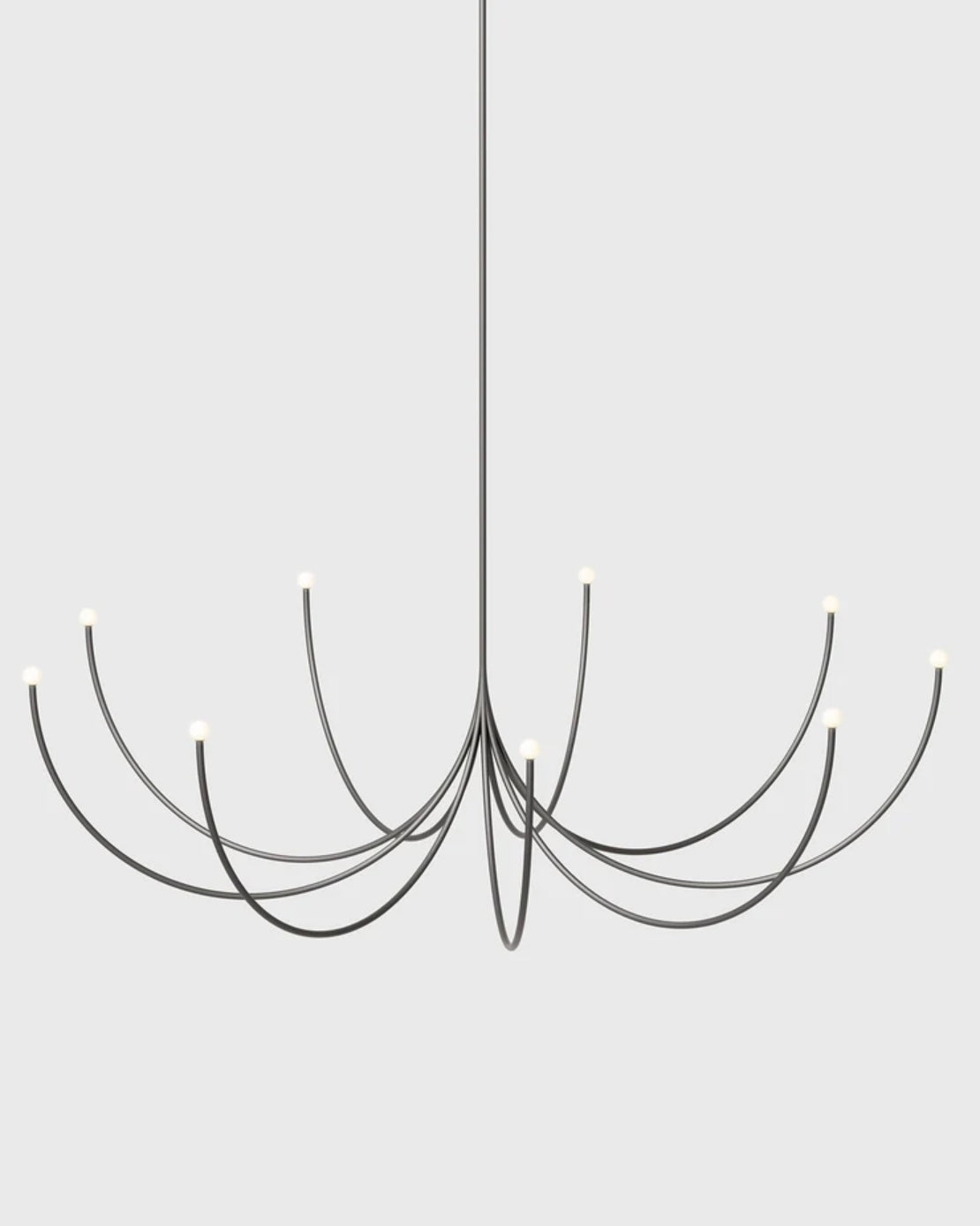 Arca is a lighting system whose form is a play of contrasts between the classical swooping branches and the spare minimalism of its linear, black composition. Tiers can be easily added together to create a unique chandelier.
