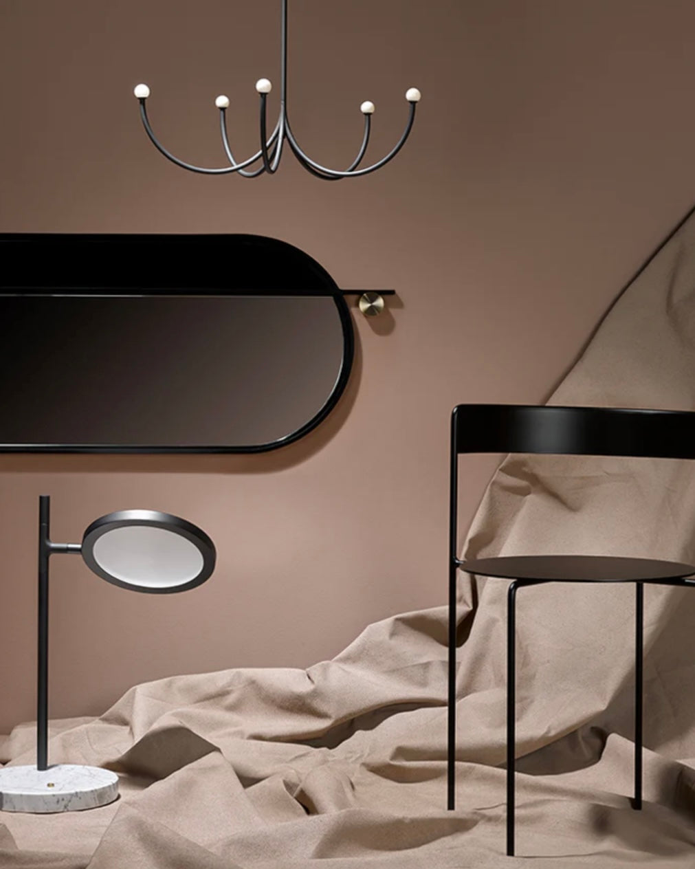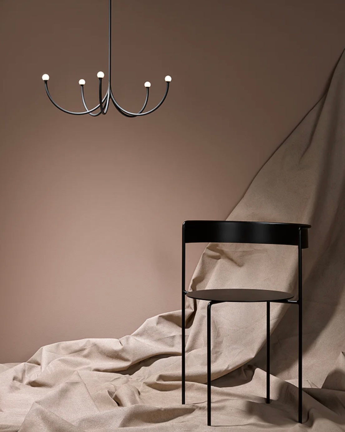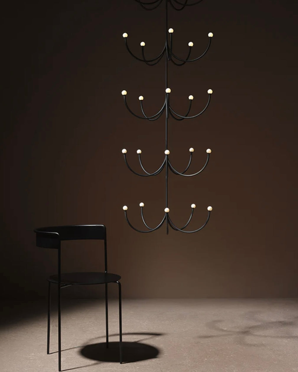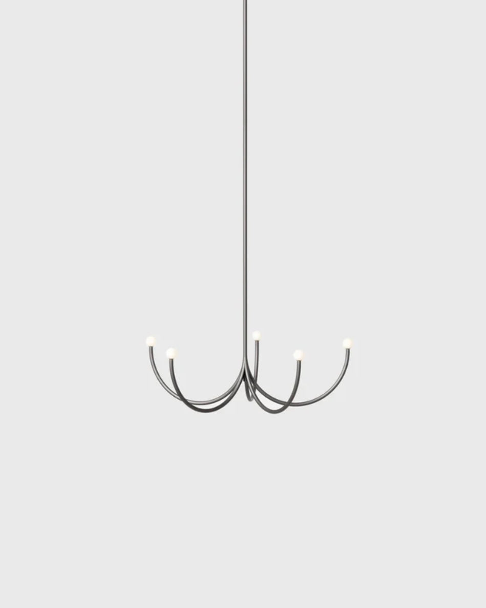 Arca is a lighting system whose form is a play of contrasts between the classical swooping branches and the spare minimalism of its linear, black composition. Tiers can be easily added together to create a unique chandelier.