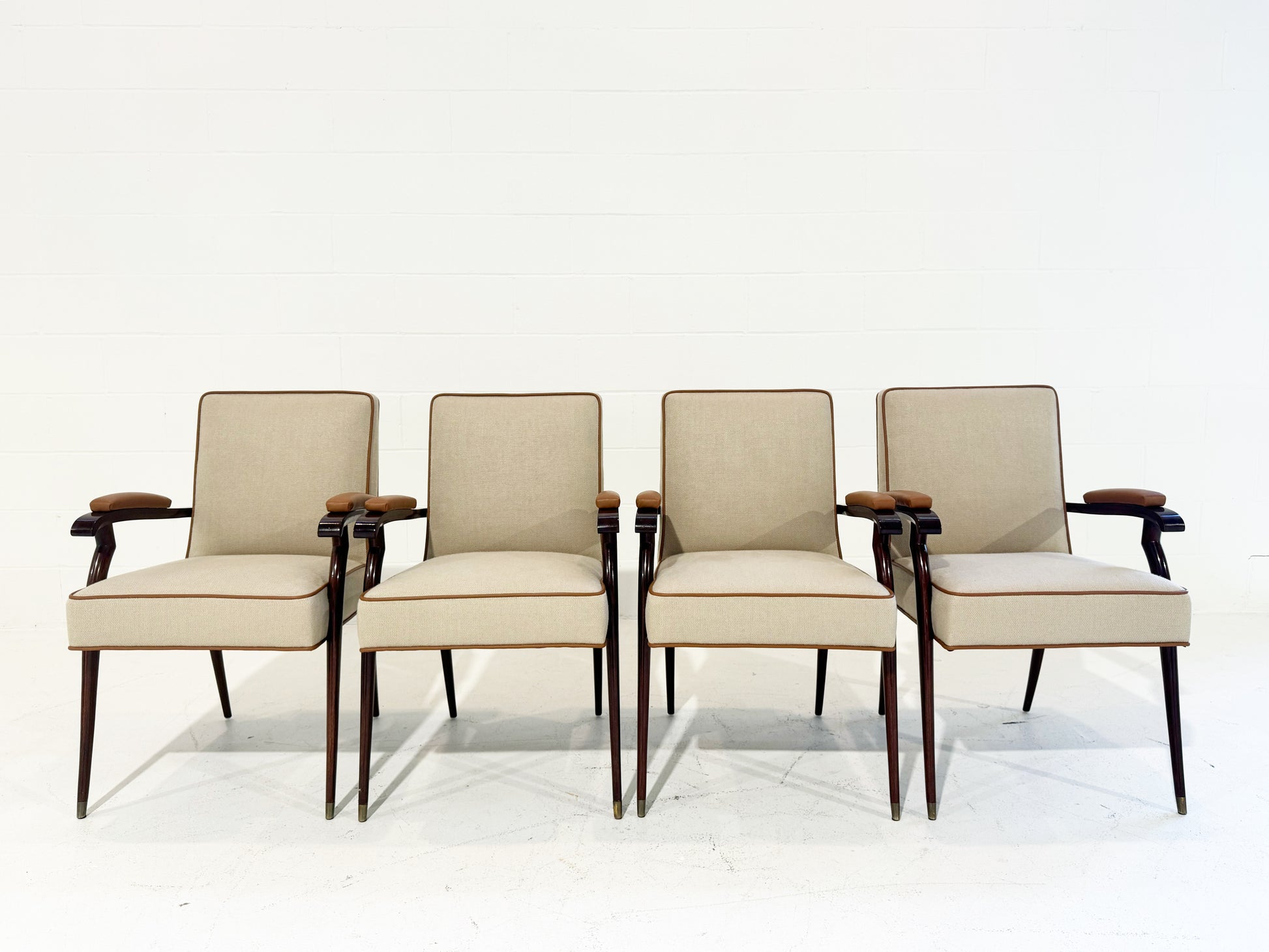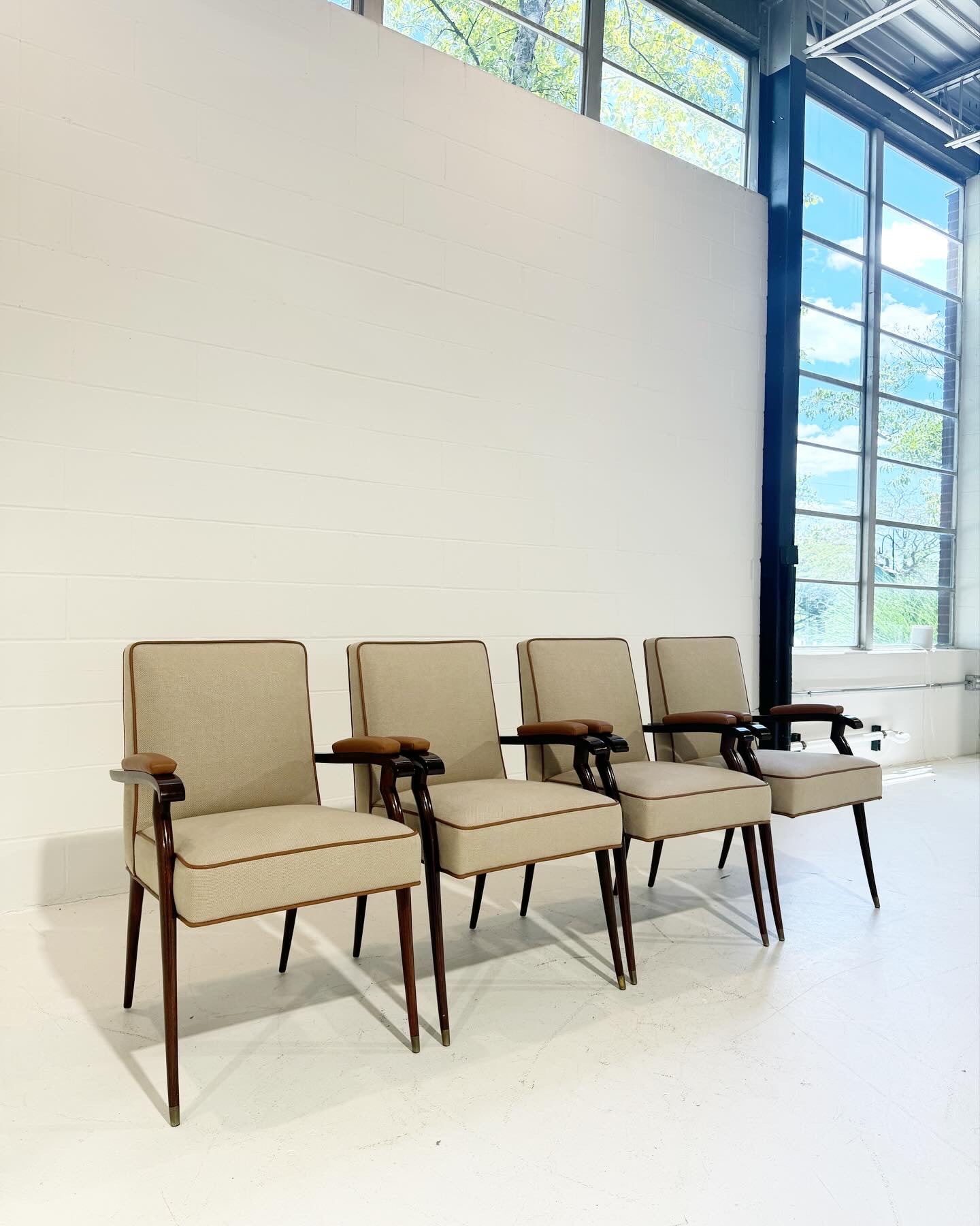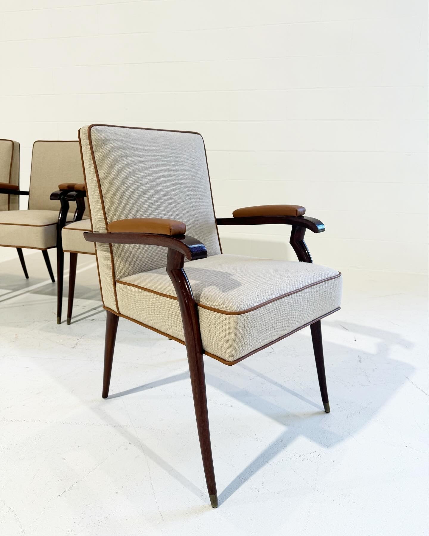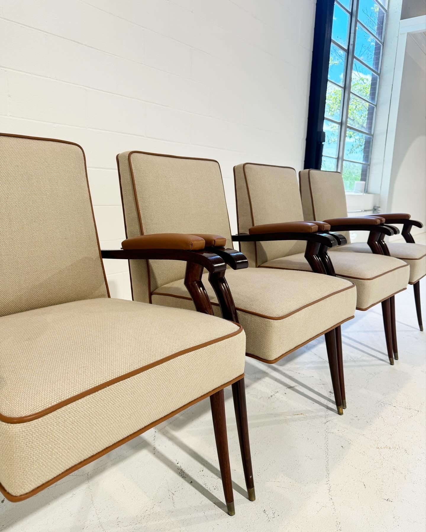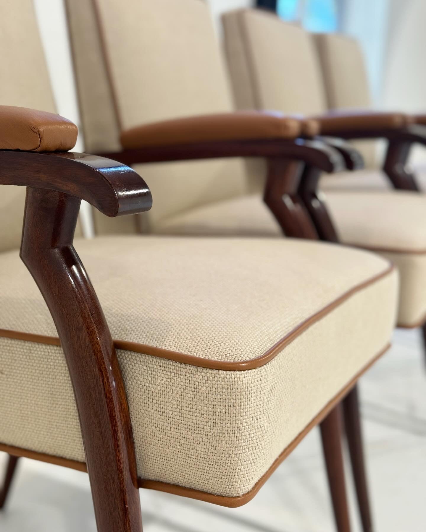 The chairs have been expertly reupholstered in linen from Loro Piana and welted in bufalo leather from Loro Piana.